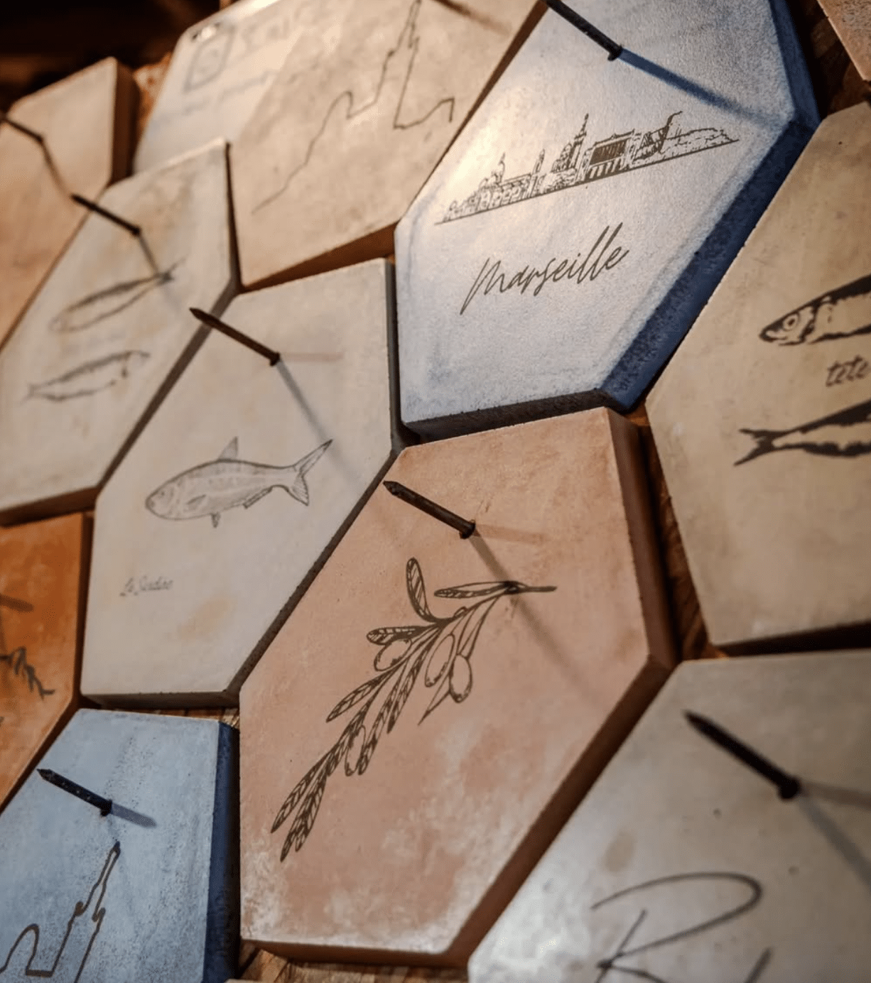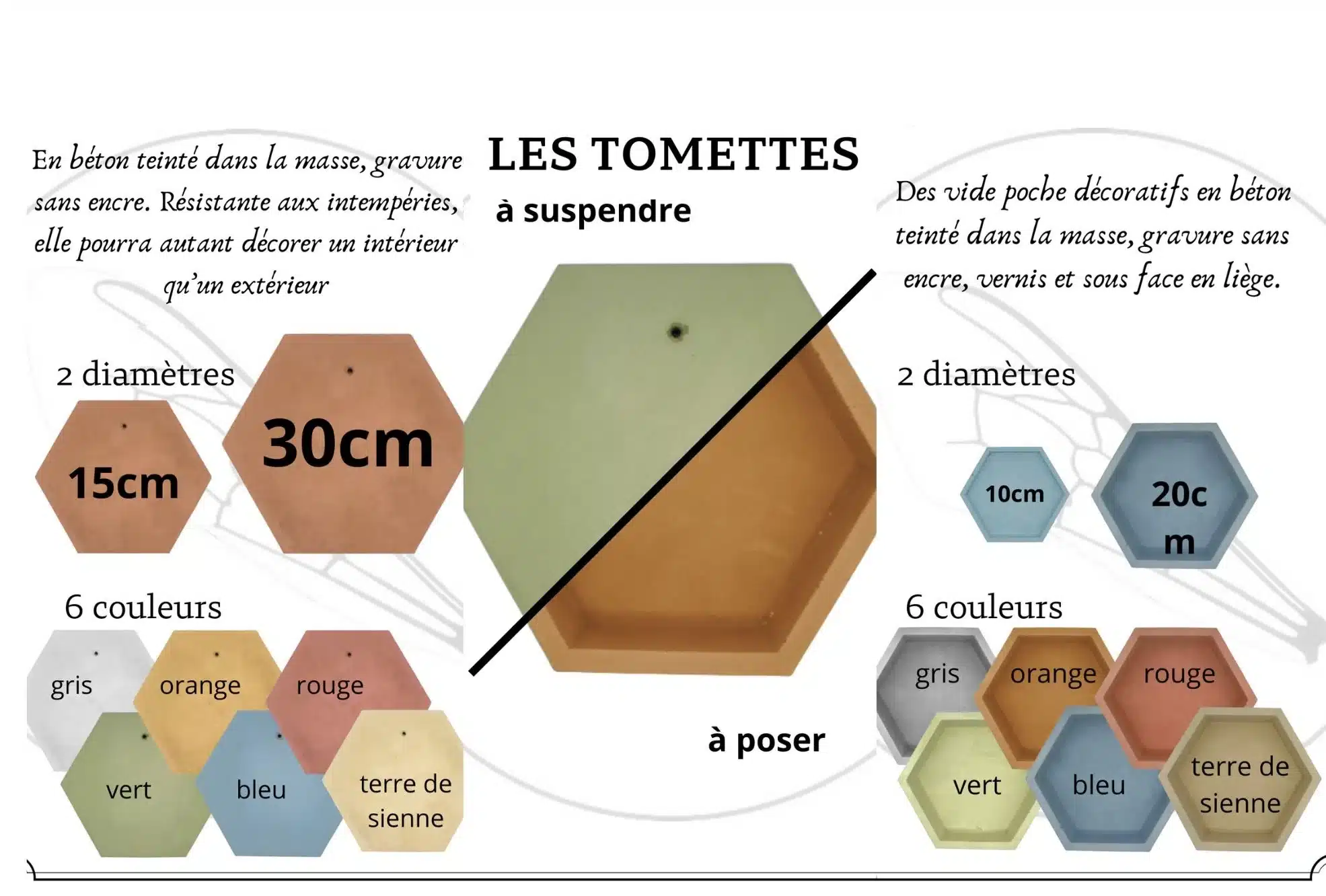Décoration murale en micro béton coulé à la main et gravé sans encre, perçée diamètre 4.