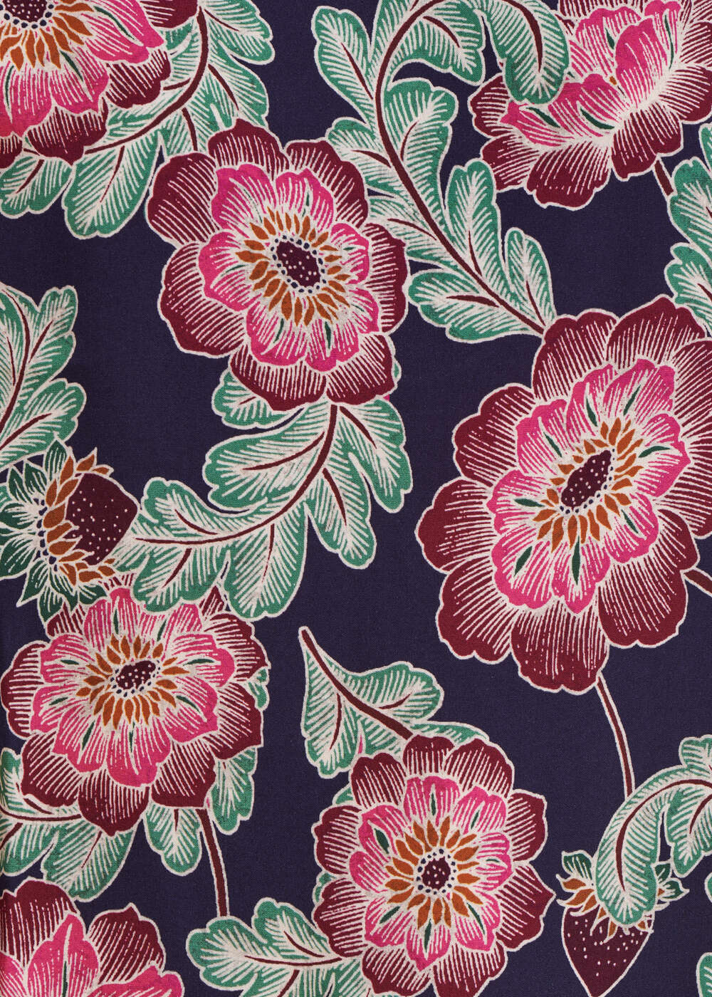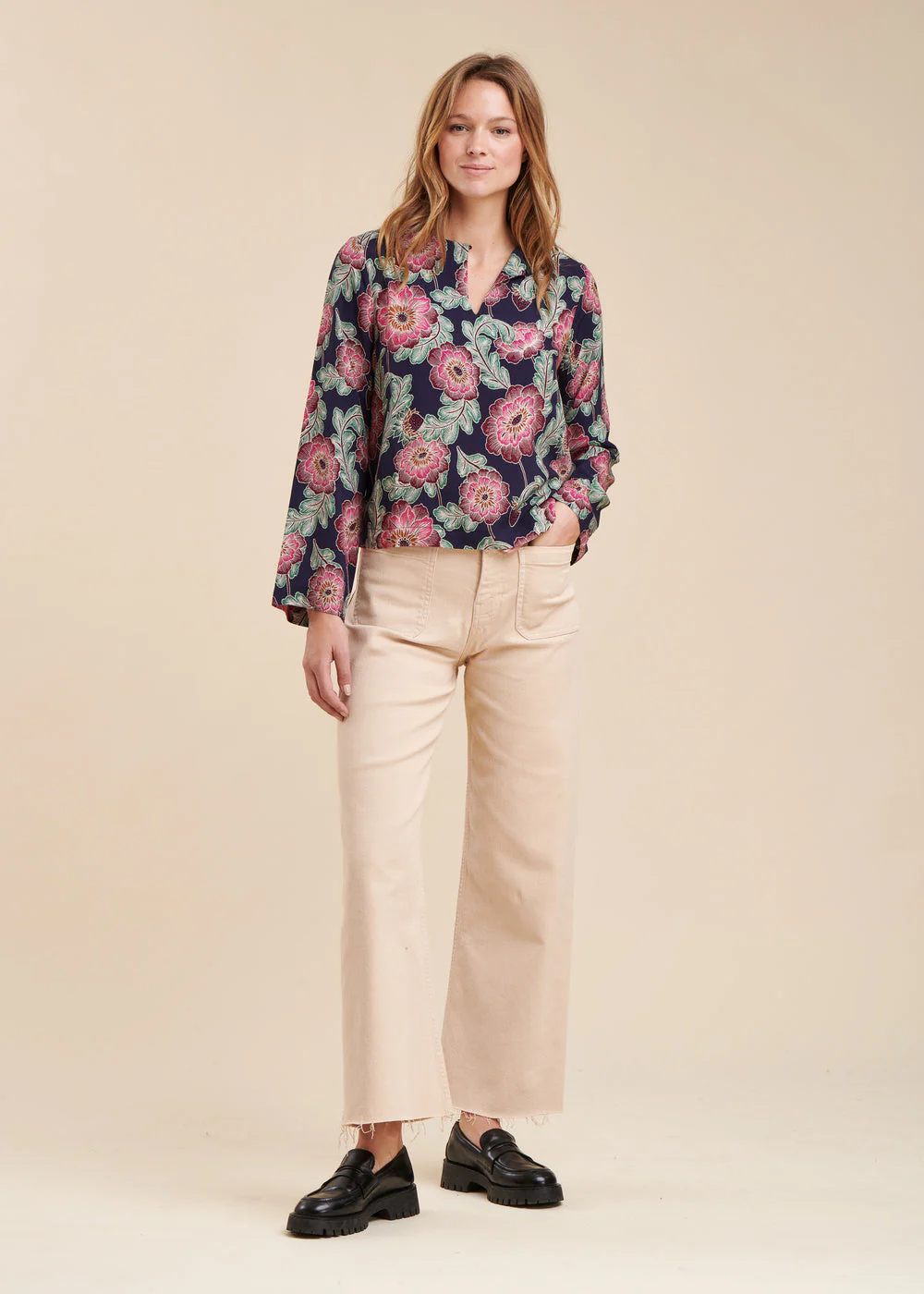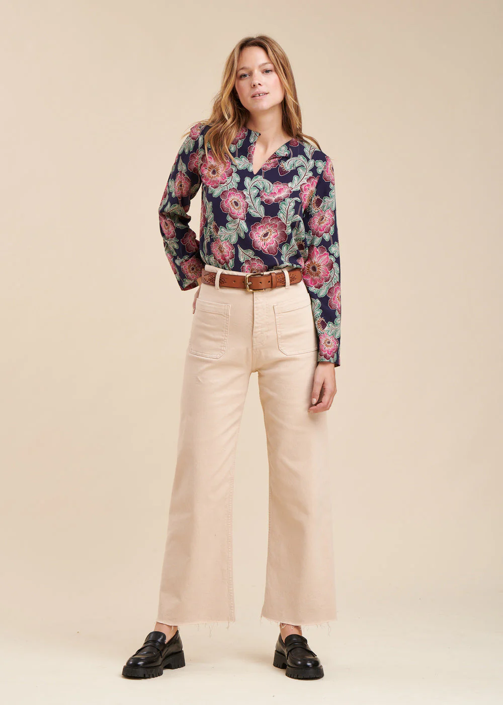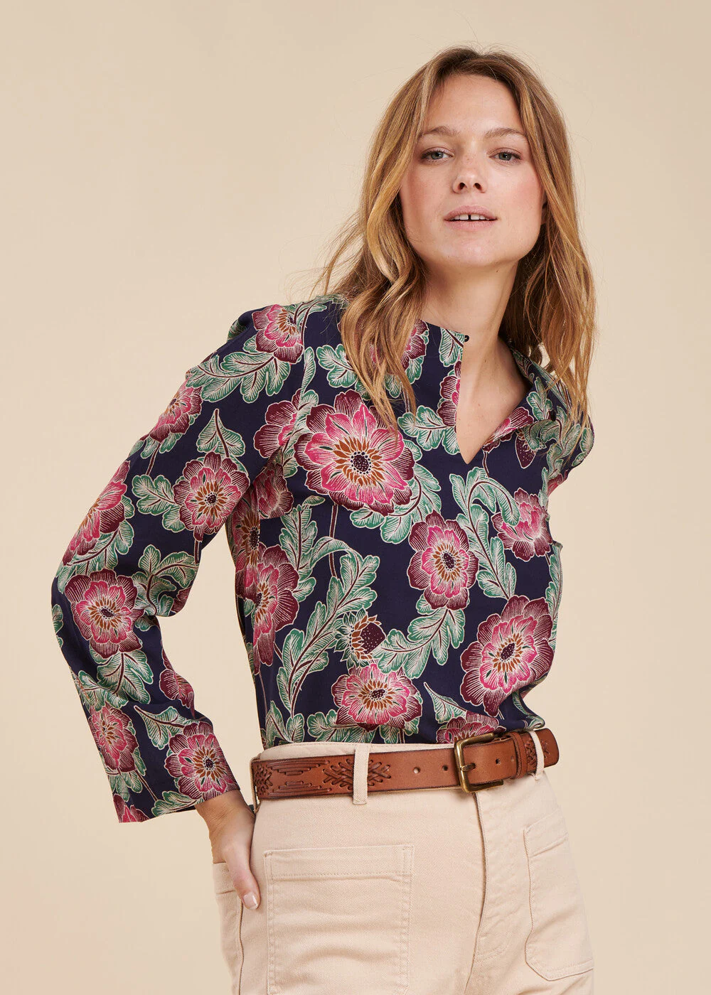 Top à imprimé fleuri, encolure tunisienne boutonnée, manches pagodes longues, coupe droite.