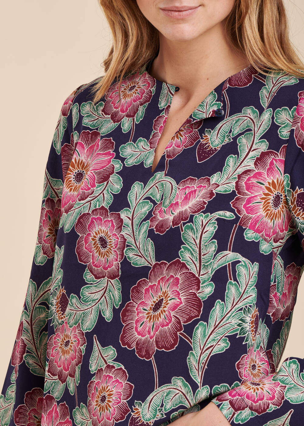 Top à imprimé fleuri, encolure tunisienne boutonnée, manches pagodes longues, coupe droite.Notre mannequin mesure 1m75 et porte une taille 36/S.Ce modèle taille normalement, prenez votre taille habituelle.