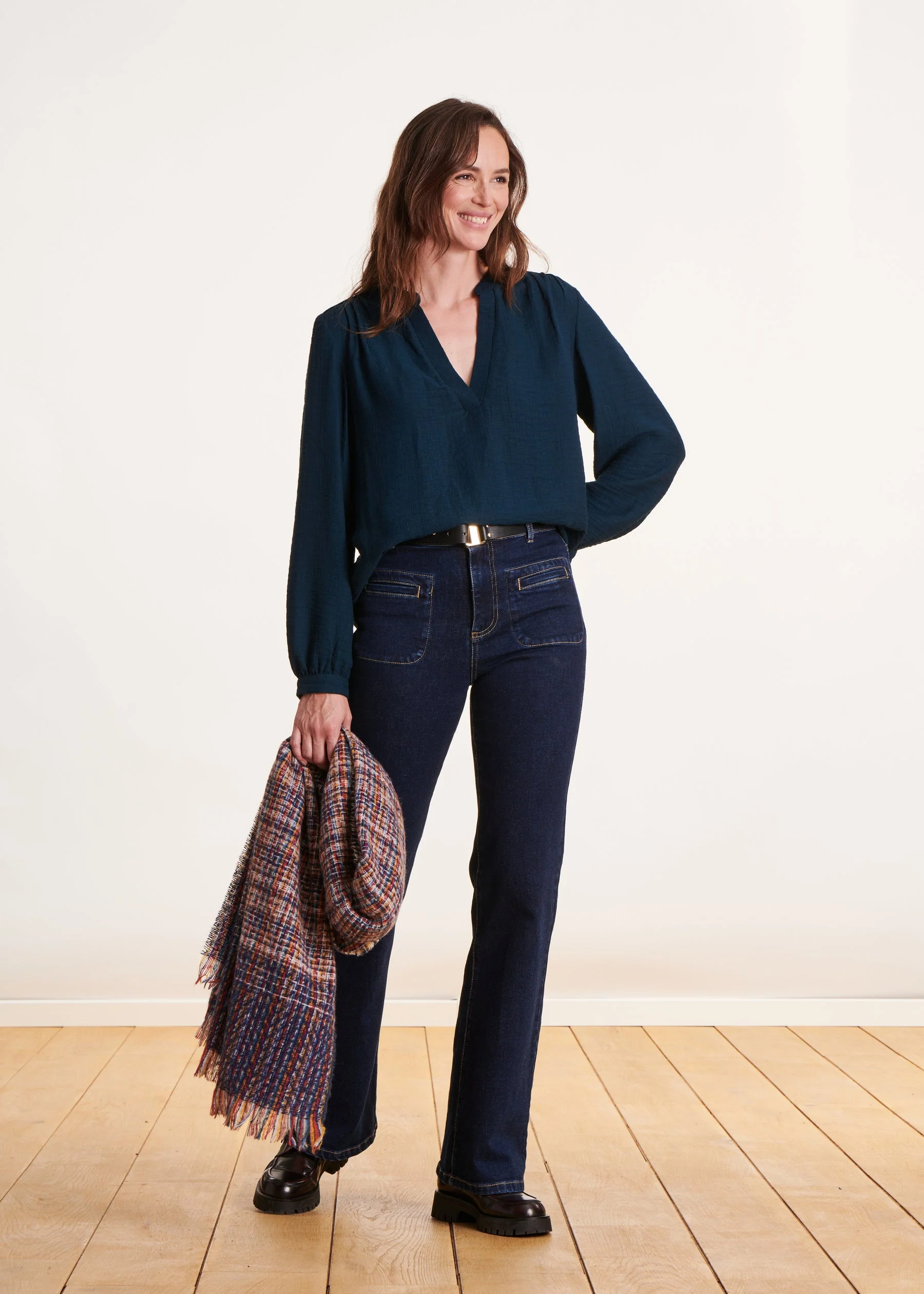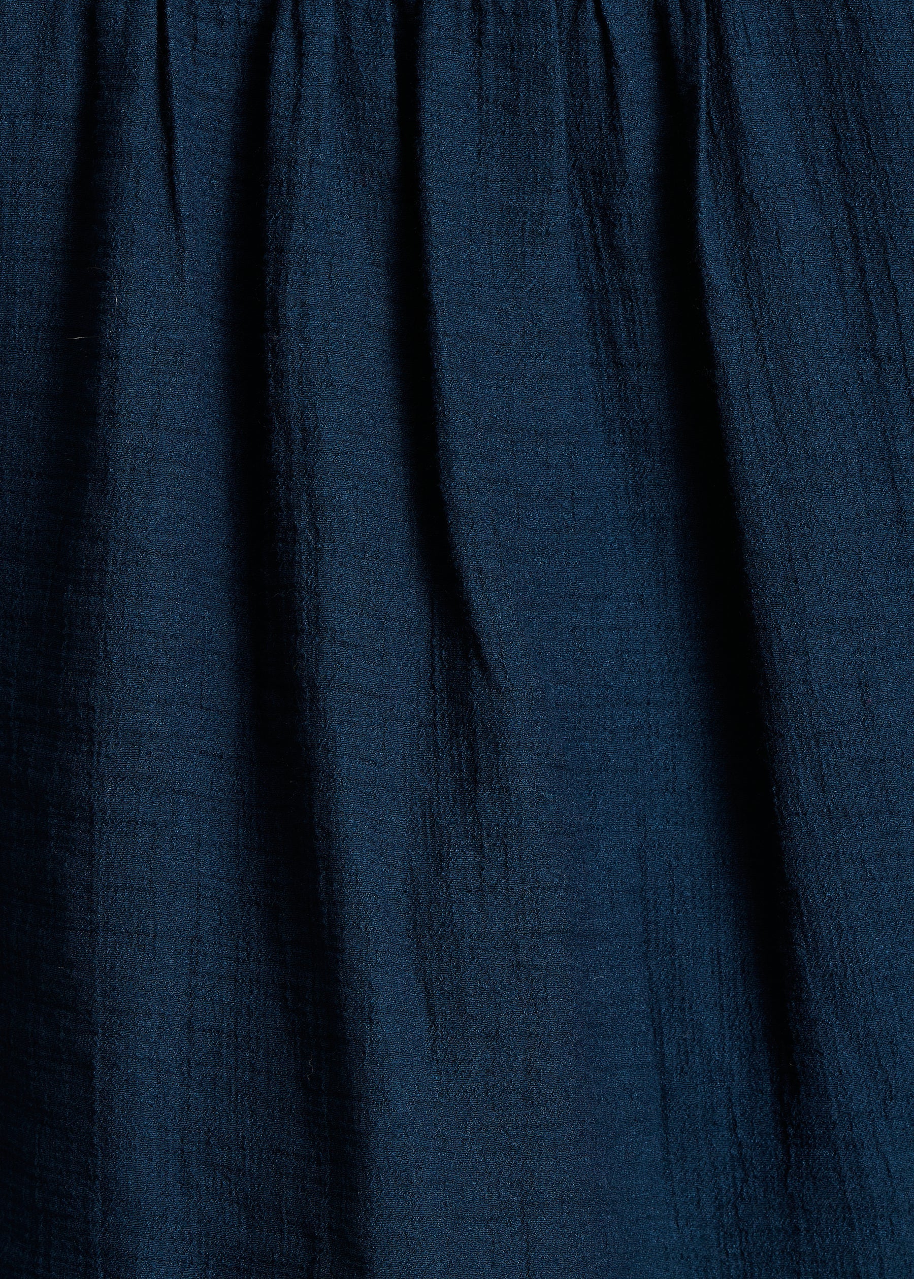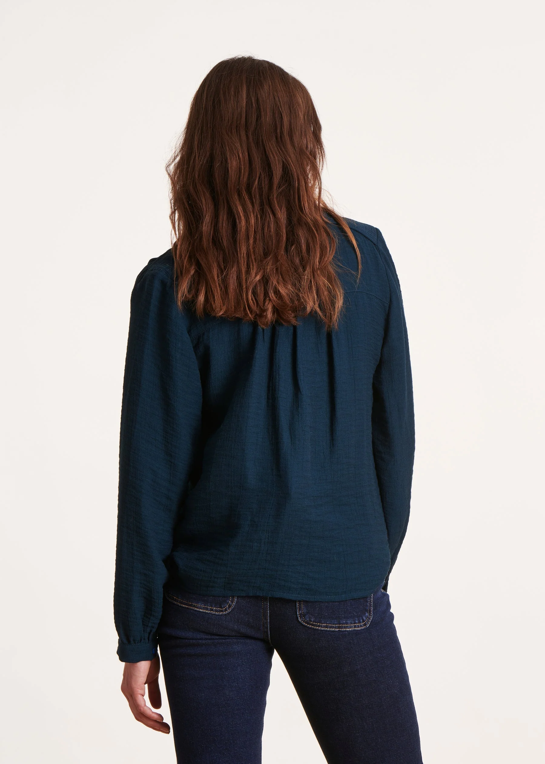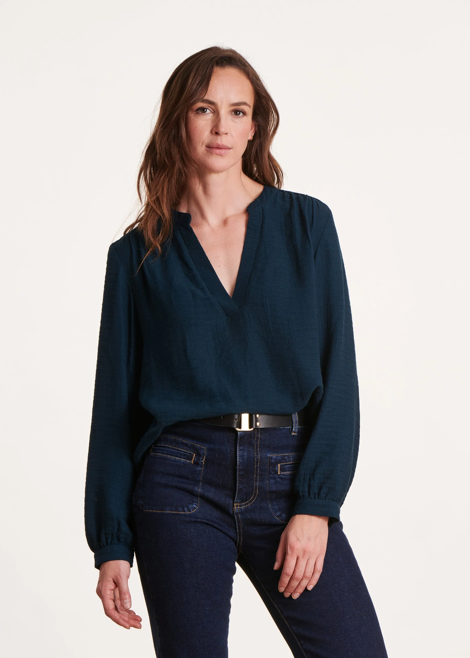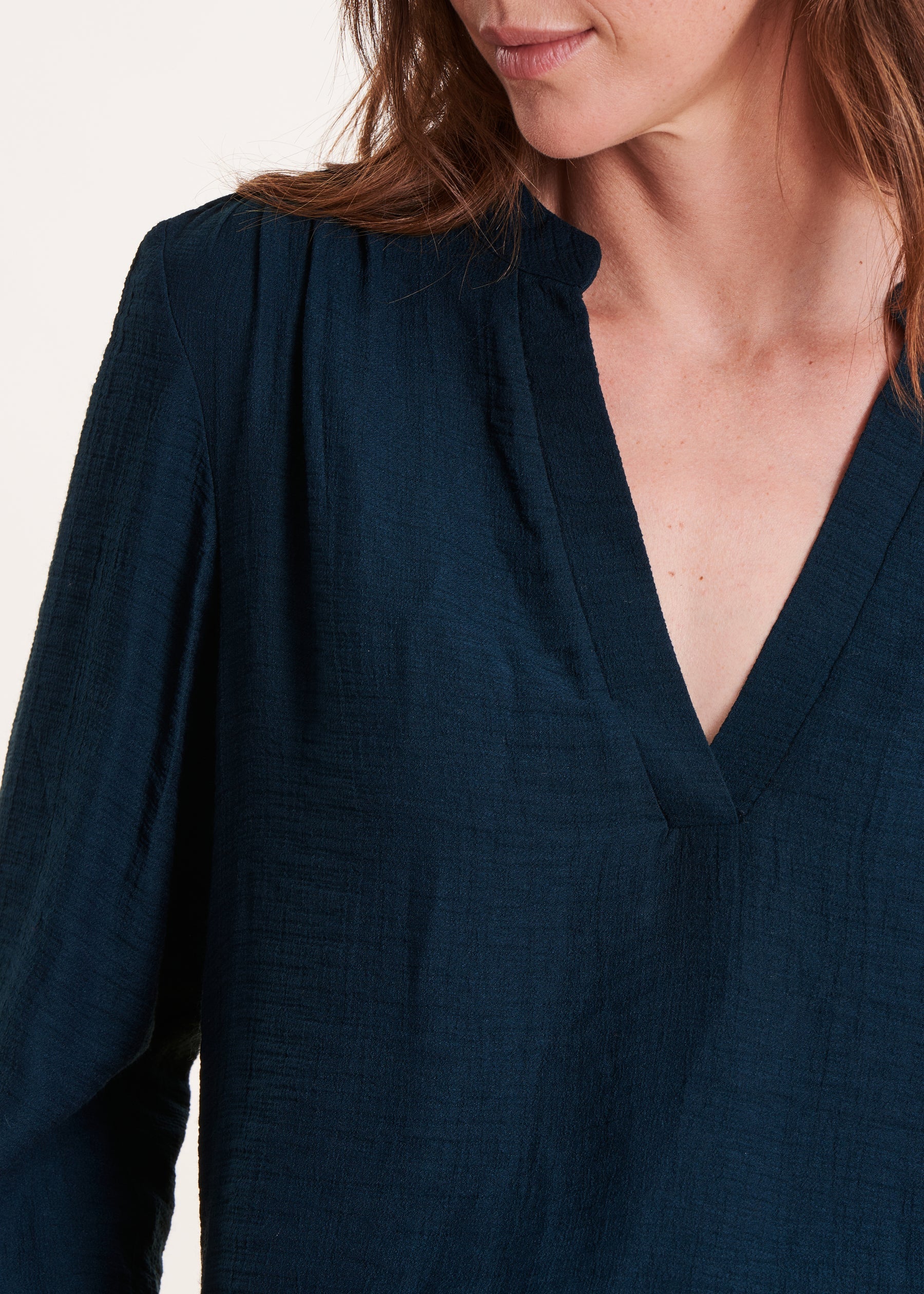 – Top coupe droite en viscose crinkle– Encolure tunisienne– Manches longues avec poignets boutonnés et fentes