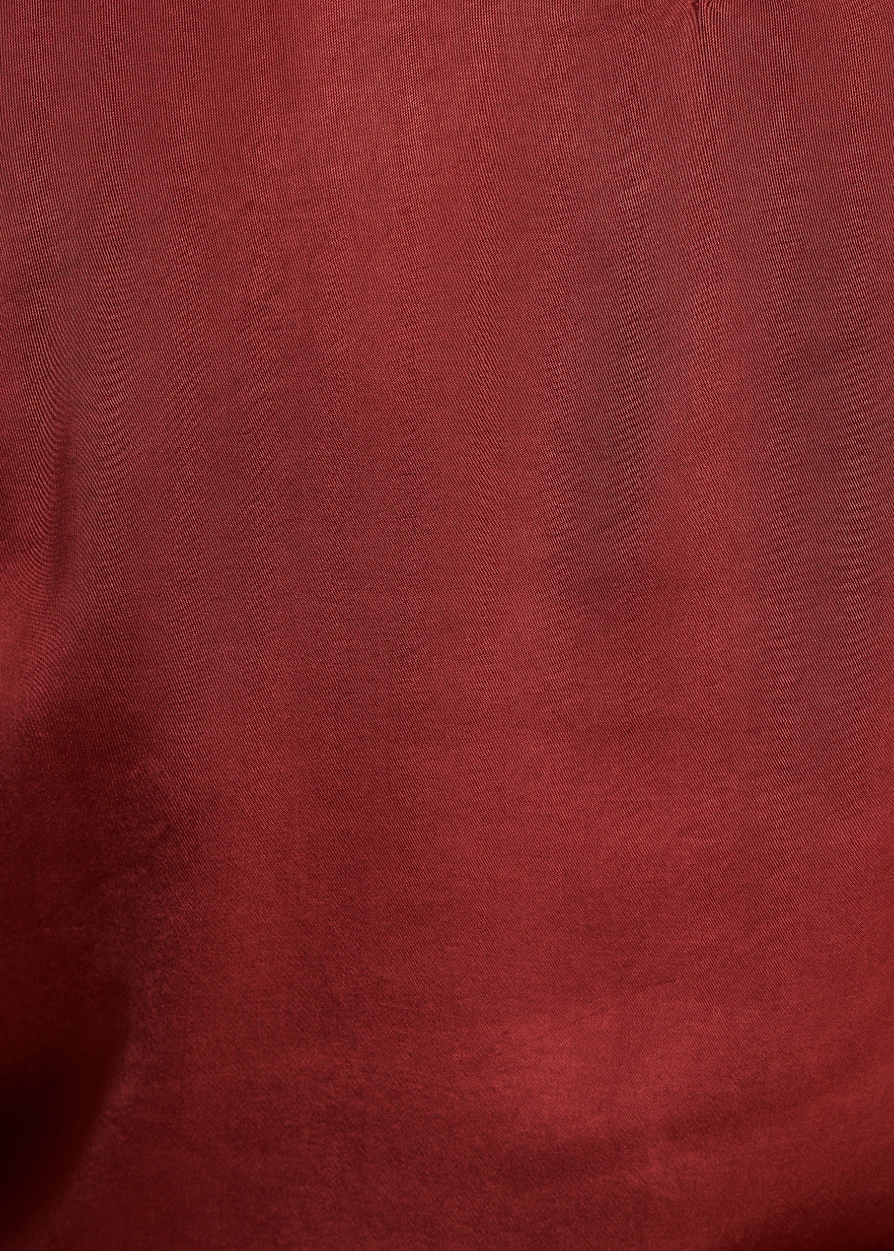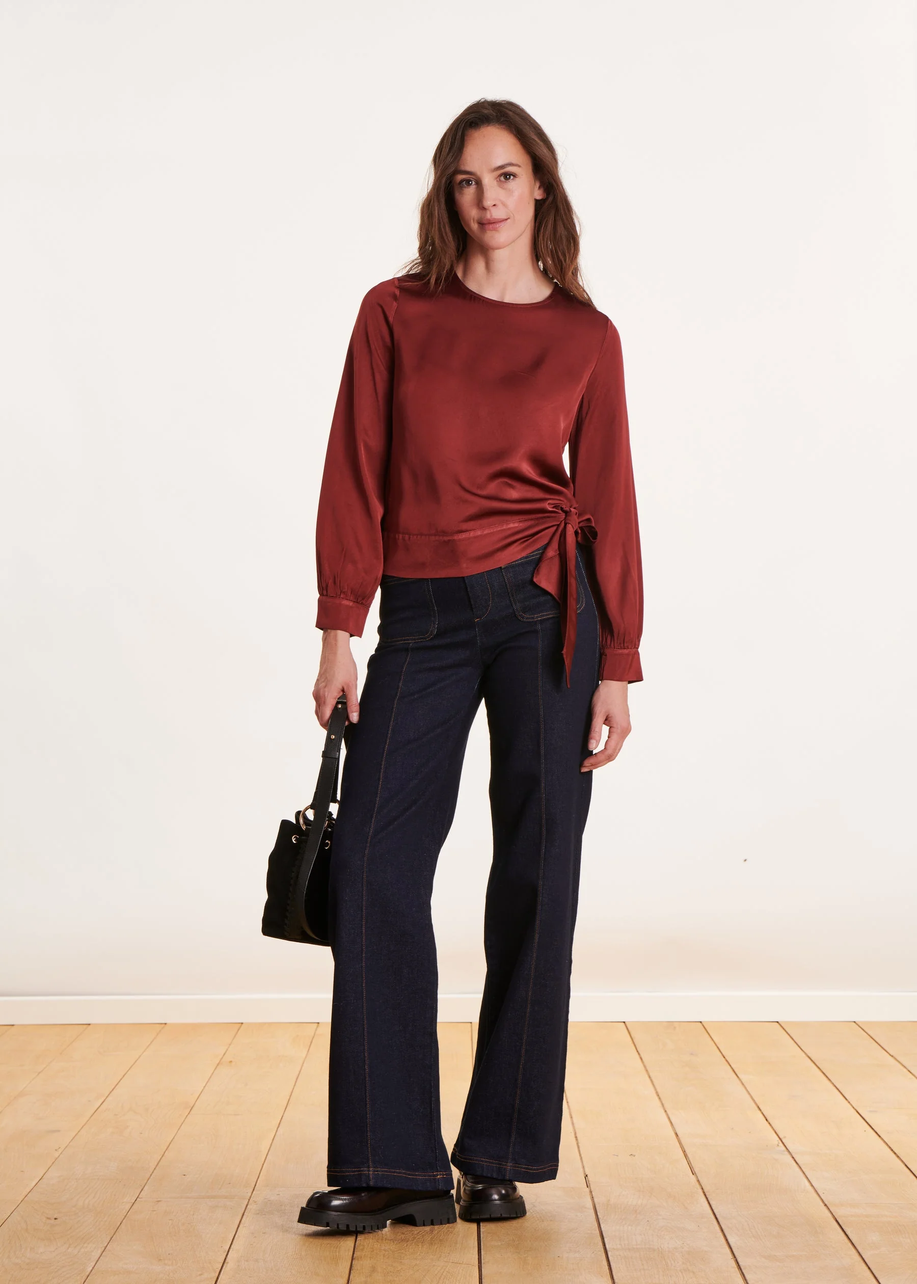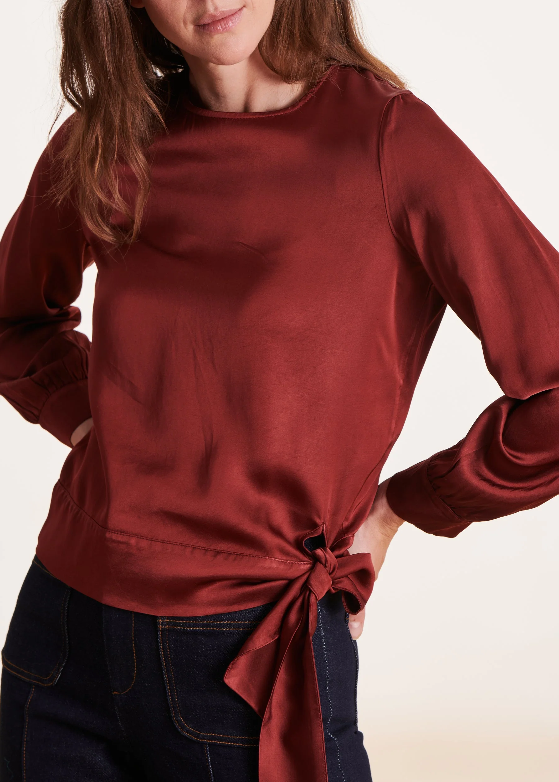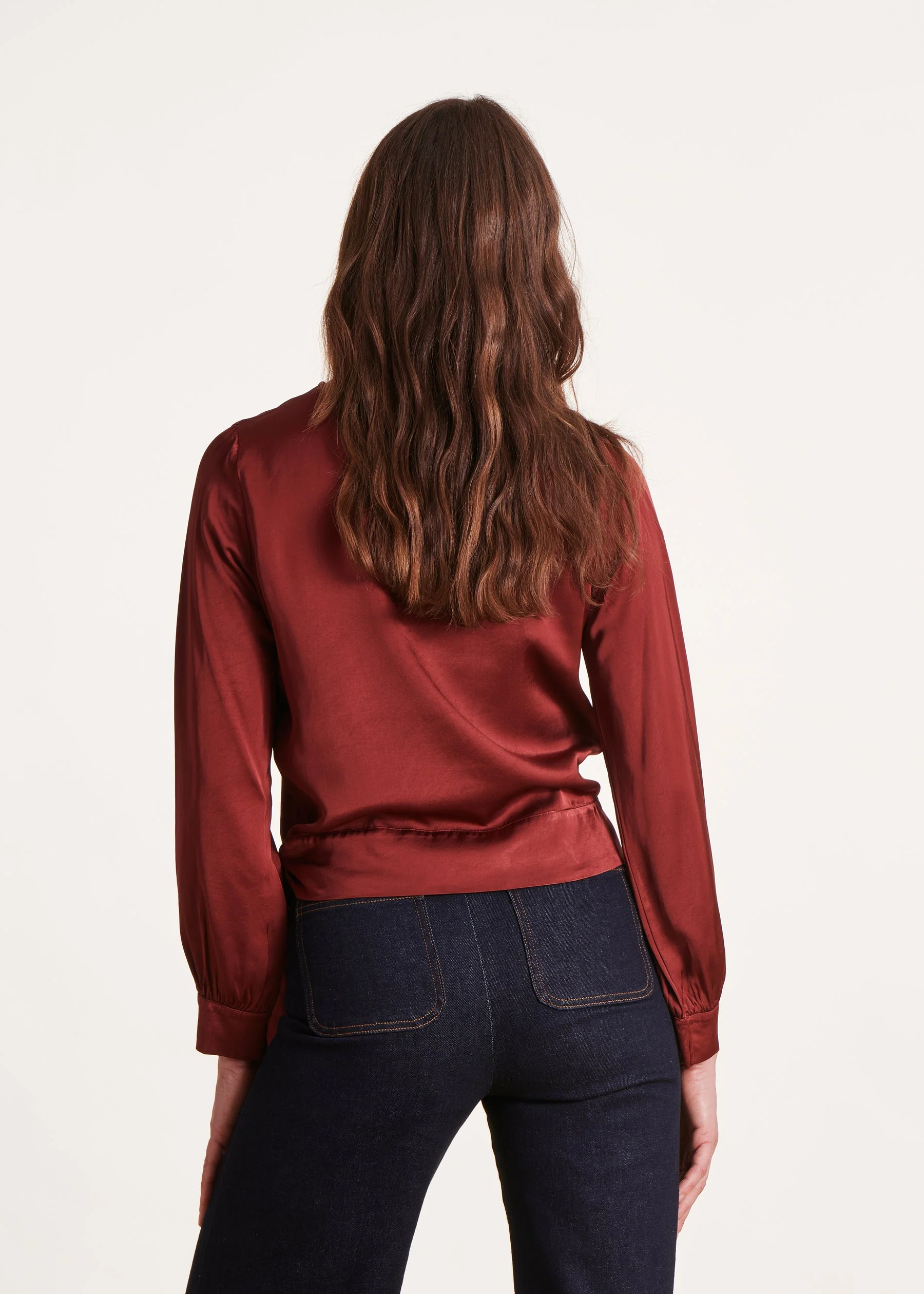 – Top en satin de viscose– Coupe ample– Encolure ronde– Manches longues avec poignets– Bande en bas de corps à nouer