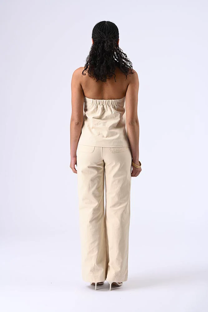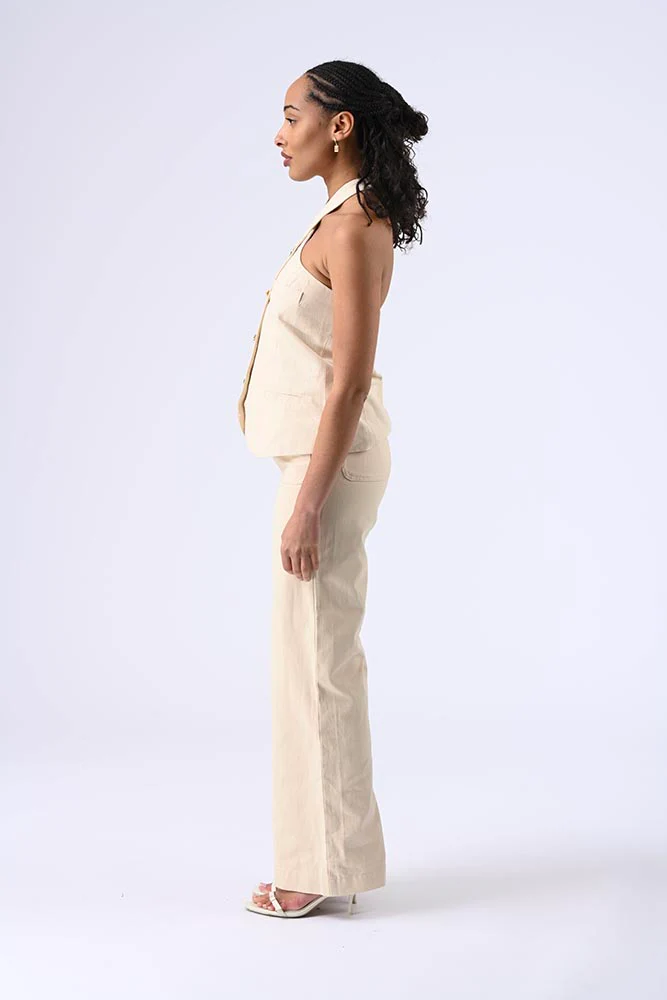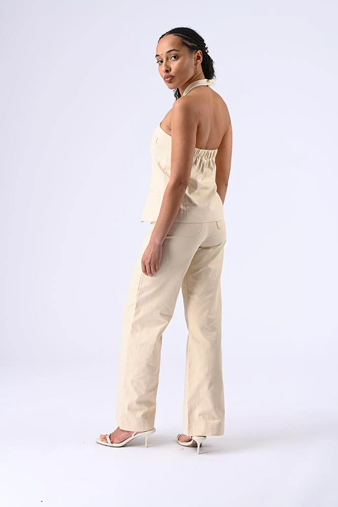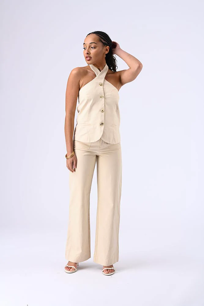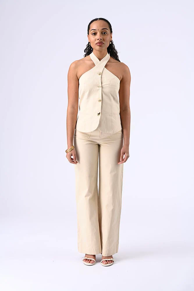 Top à nouer au cou, boutons dorés, poches style veste et élastique discret au dos pour une coupe raffinée et ajustée. Couleur beige