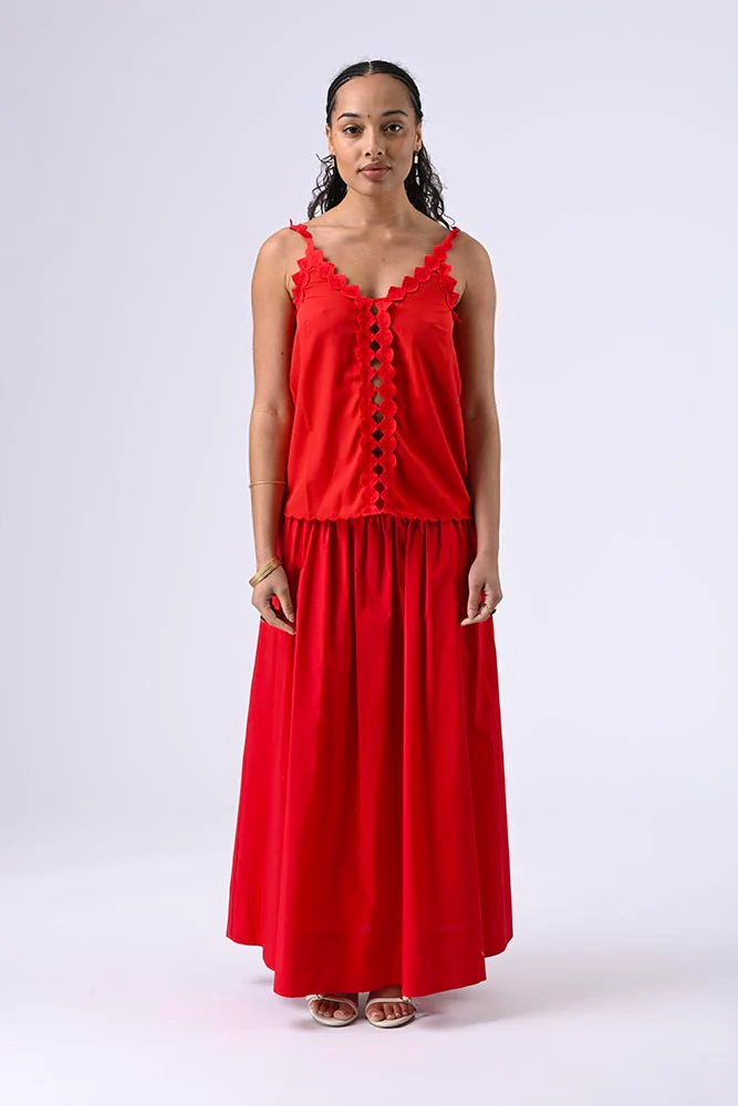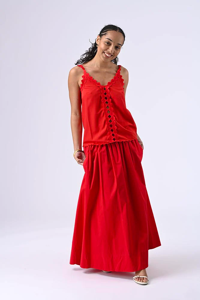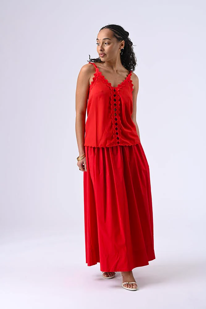 Blouse en satin à bretelles, ornée d’un empiècement brodé sur les bretelles et le long du décolleté jusqu’a l’ourlet pour une allure sophistiquée. Couleur rouge
