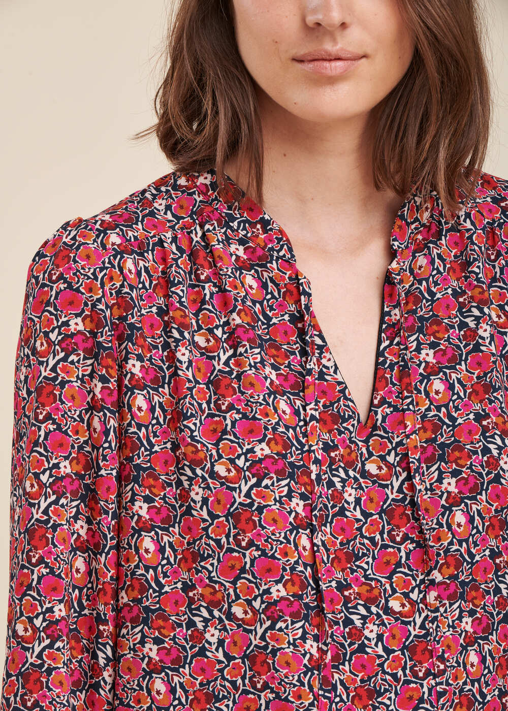 Top en viscose écoresponsable Ecovero à imprimé fleuri, encolure tunisienne avec liens à nouer, manches longues bouffantes avec bracelets, découpes épaules avec fronces, découpe dos avec fronces.