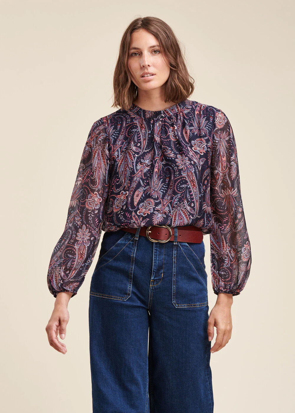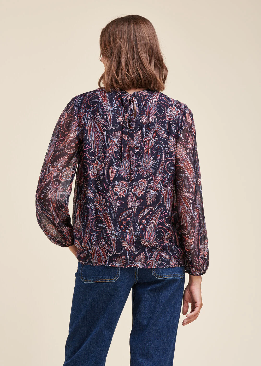 Top en voile de viscose soie à imprimé floral, petit col montant avec liens à nouer dans le dos, manches longues transparentes bouffantes élastiquée, top doublé.Notre mannequin mesure 1m75 et porte une taille 36/S.Ce modèle taille normalement, prenez votre taille habituelle.