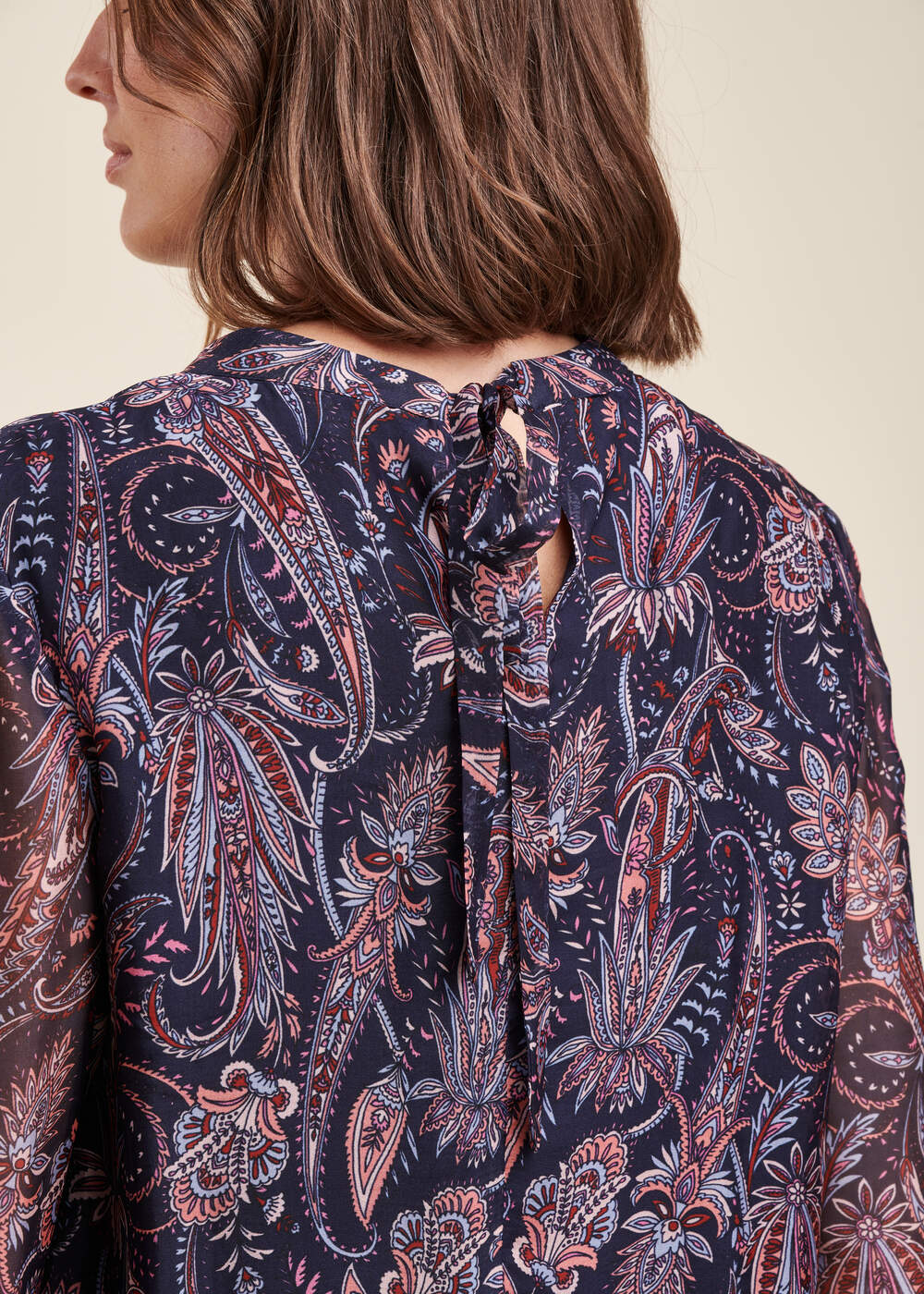 Top en voile de viscose soie à imprimé floral, petit col montant avec liens à nouer dans le dos, manches longues transparentes bouffantes élastiquée, top doublé.