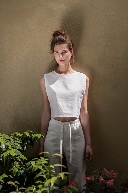 Top court aux emmanchures géométriques. Coupe droite légèrement large et encolure ronde.