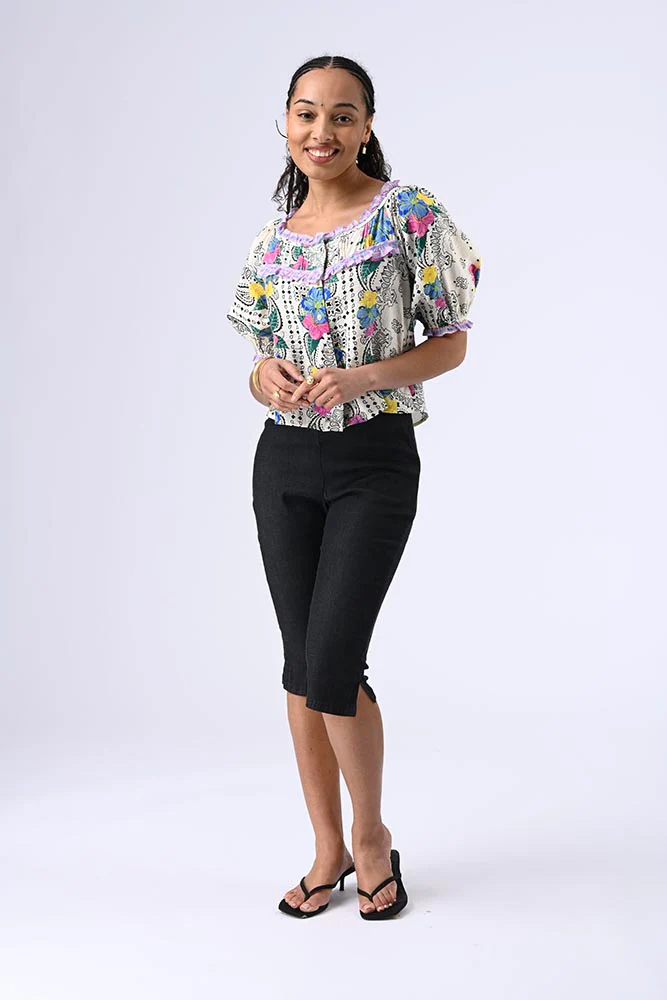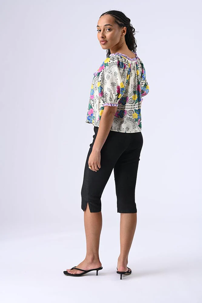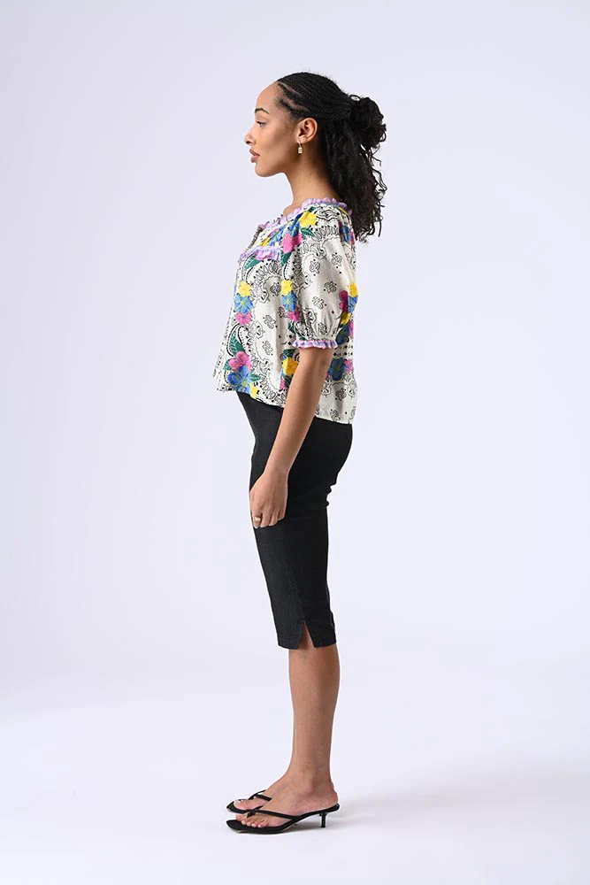 Blouse à manches 3/4 bouffantes, col bateau, petits boutons à l’avant. Tissu contrasté volanté au col, à la poitrine et aux poignets resserrés pour une touche sophistiquée. Couleur blanc