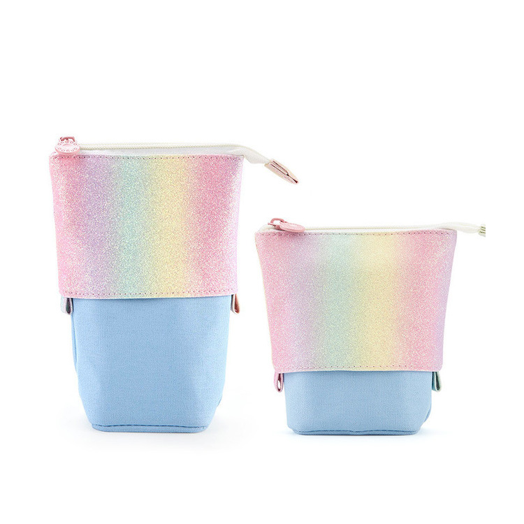 Voici une trousse Originale pour ranger vos crayons. En un coup de tirette, cette trousse rétractable arc en ciel bleu se transforme en un pot à crayon.