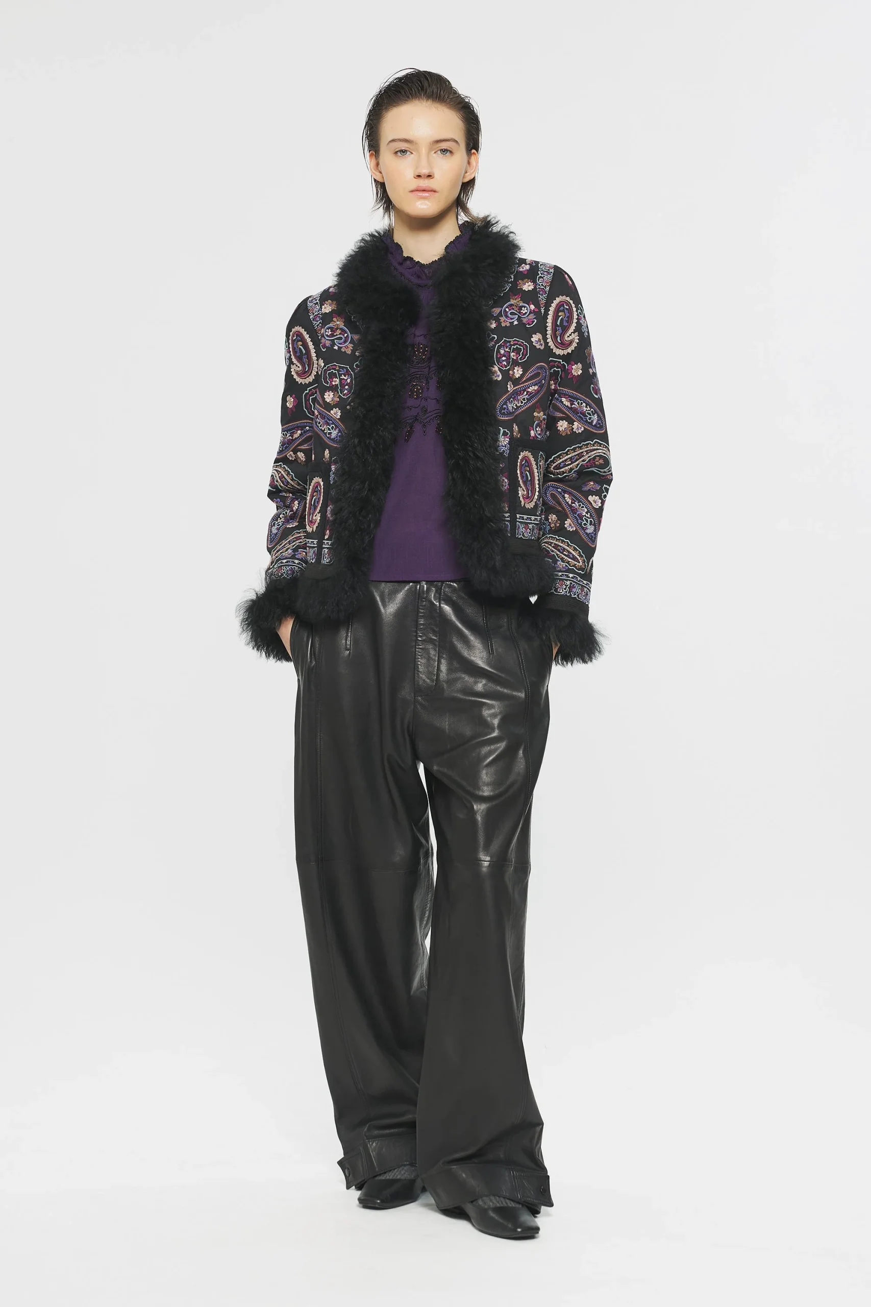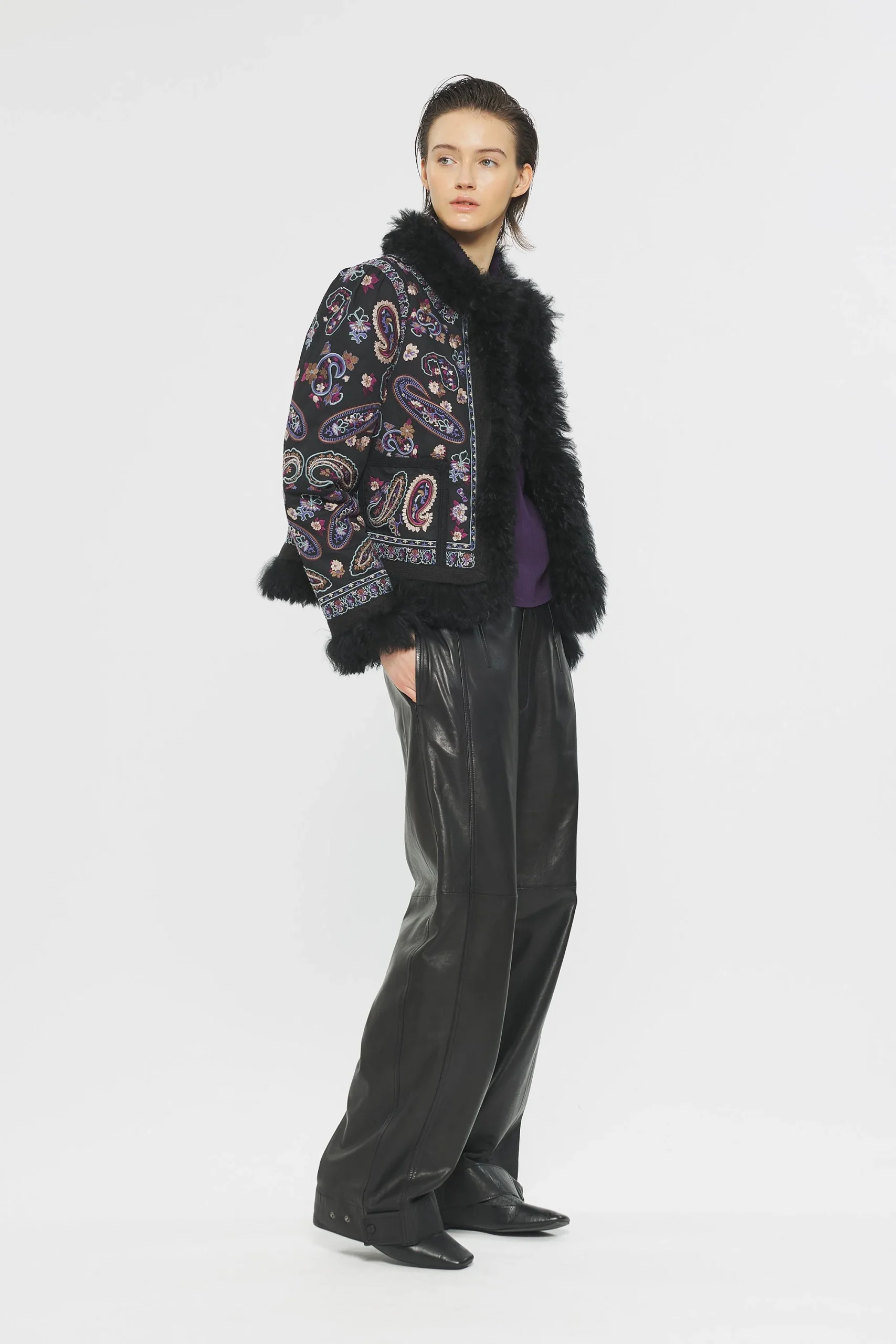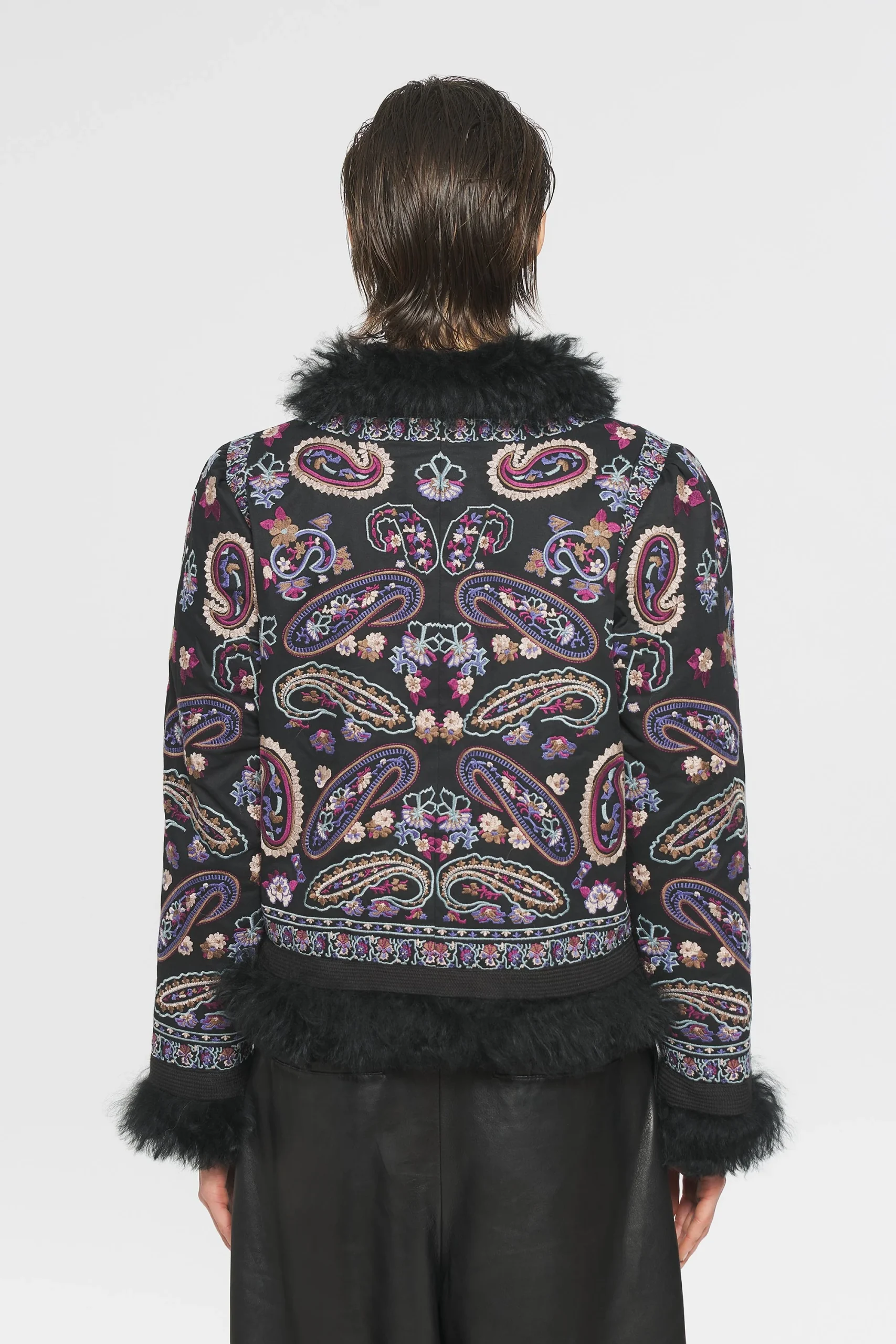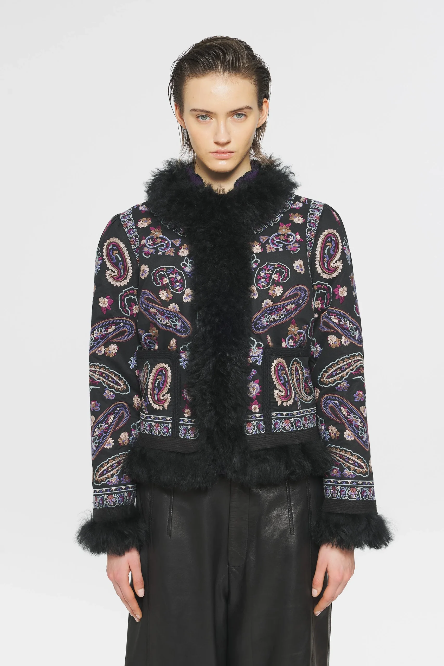 Veste brodée d’inspiration afghane. Broderies florales artisanales sur l’ensemble de la veste. Finitions en fourrure d’agneau ton sur ton. Doublure en fausse fourrure ultra-douce. Fermeture crochets.