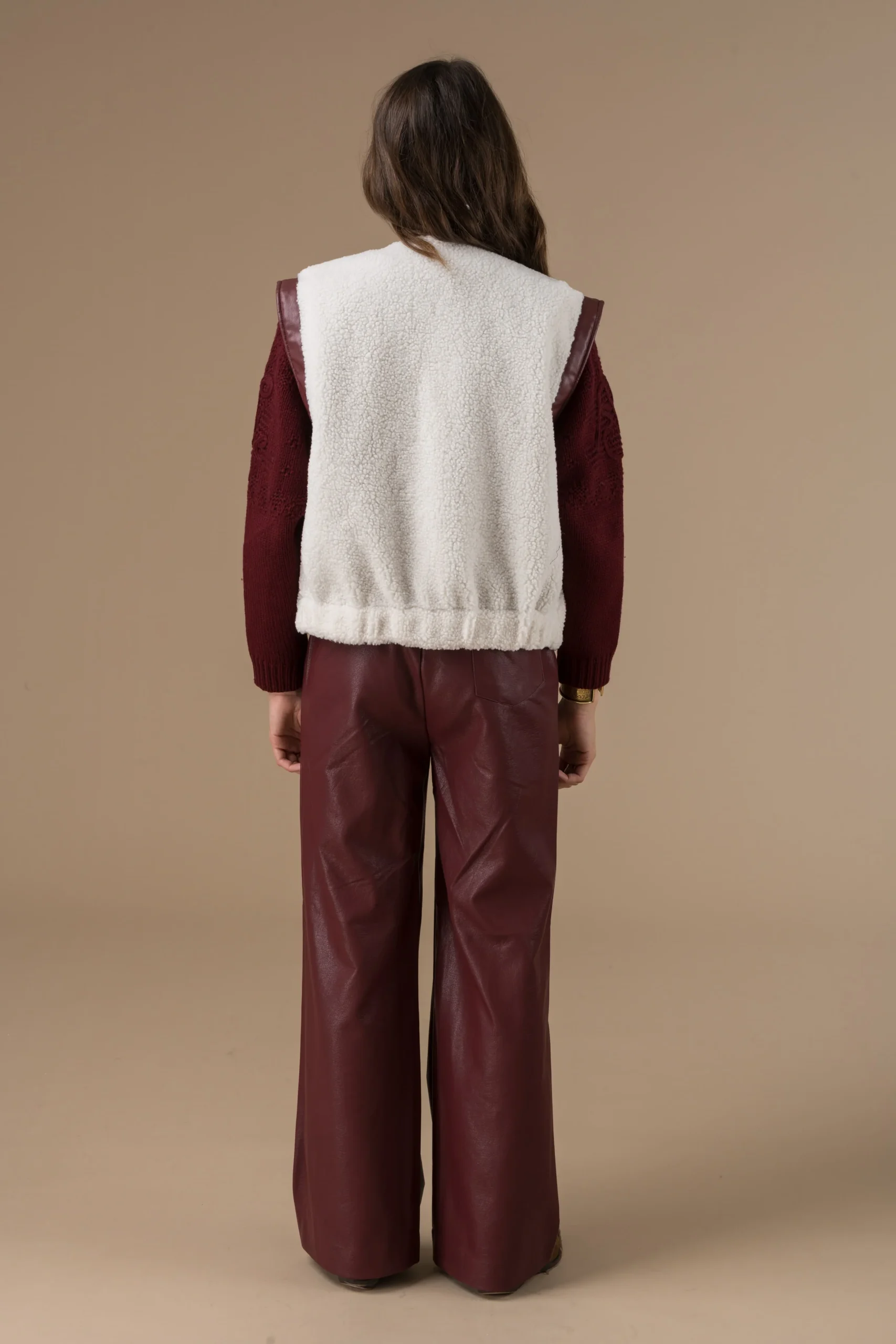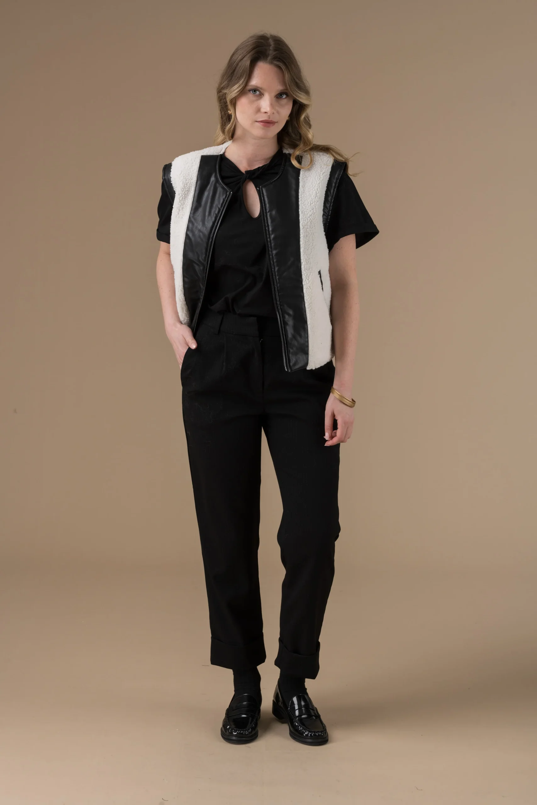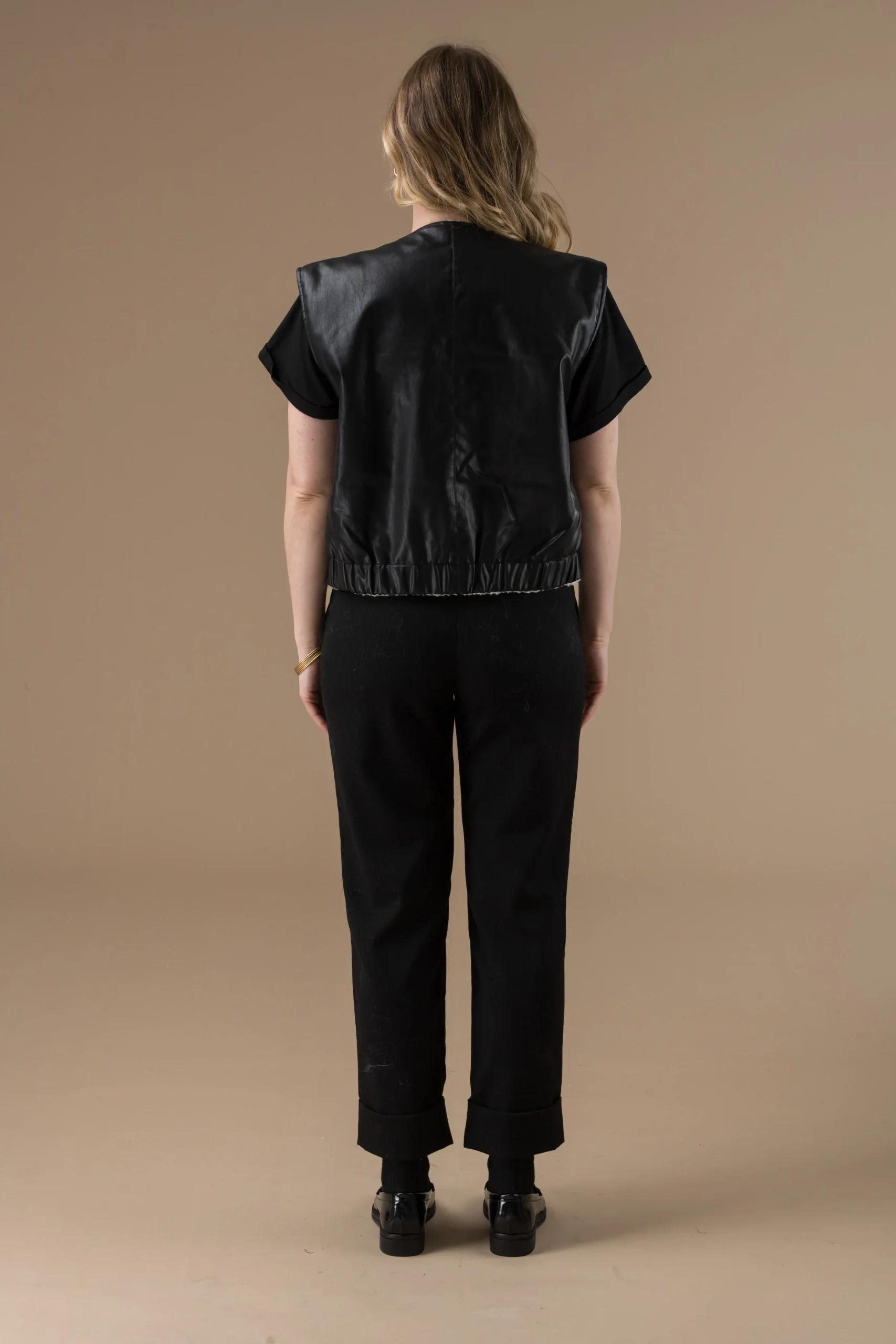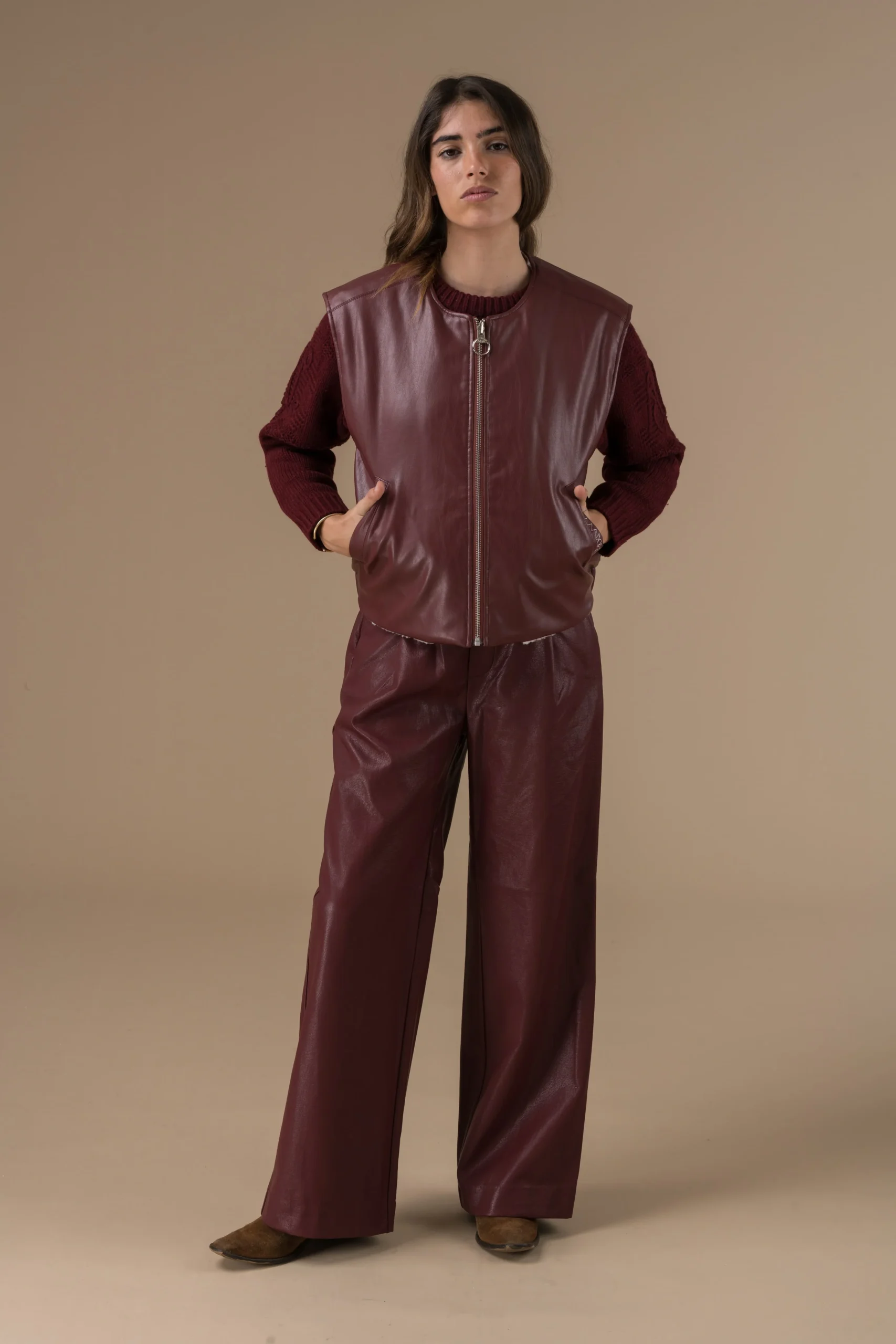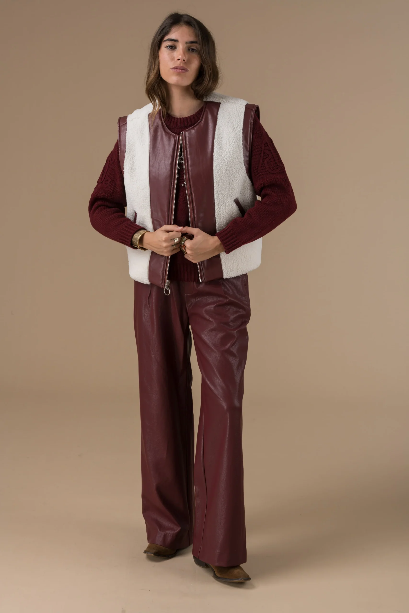 Veste Cecile réversible sans manches, en cuir souple et doublure textile. Une coupe droite et épurée, pensée pour se porter des deux côtés et s’adapter à toutes les envies.