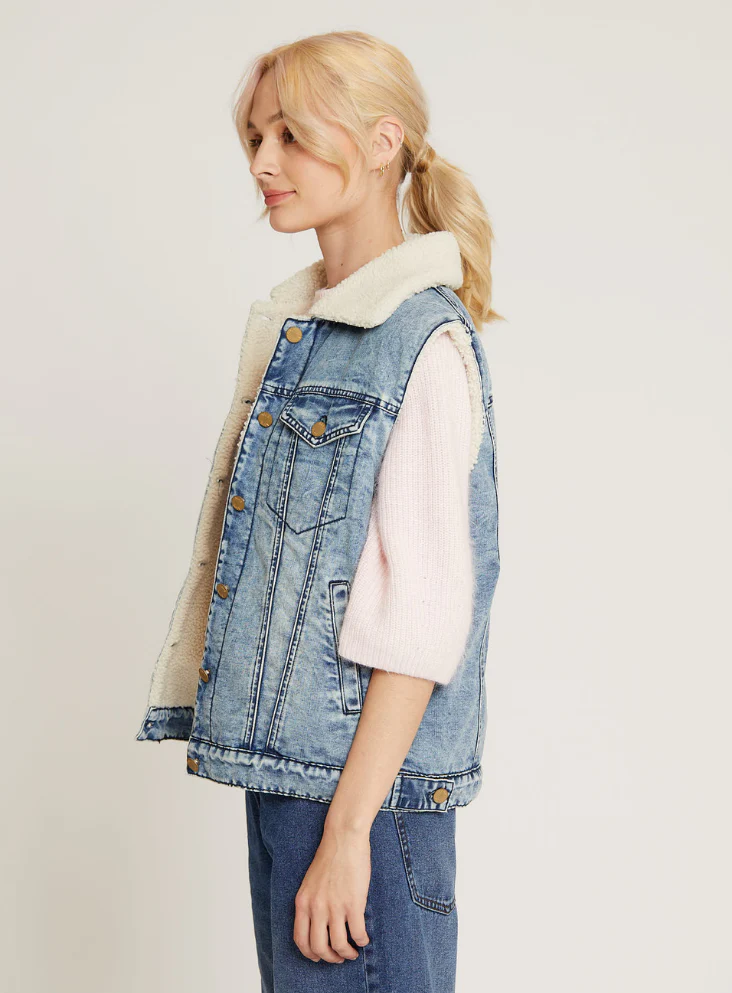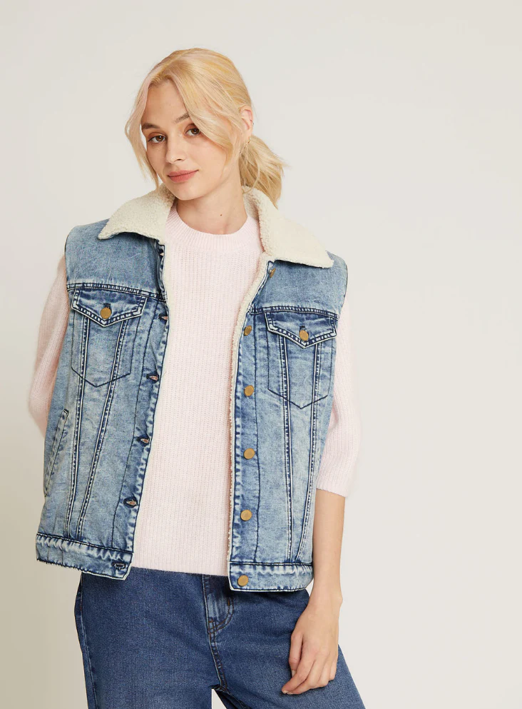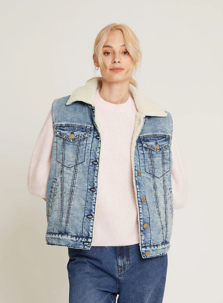 Découvrez la veste sans manches Zoe bleue, une pièce incontournable pour les amateurs de mode à la recherche d’un équilibre parfait entre praticité et style. Conçue en denim, cette veste se distingue par son col à revers et sa doublure en polaire, offrant à la fois confort et chaleur. Avec des poches latérales et des poches à rabat sur la poitrine, elle allie fonctionnalité et élégance.