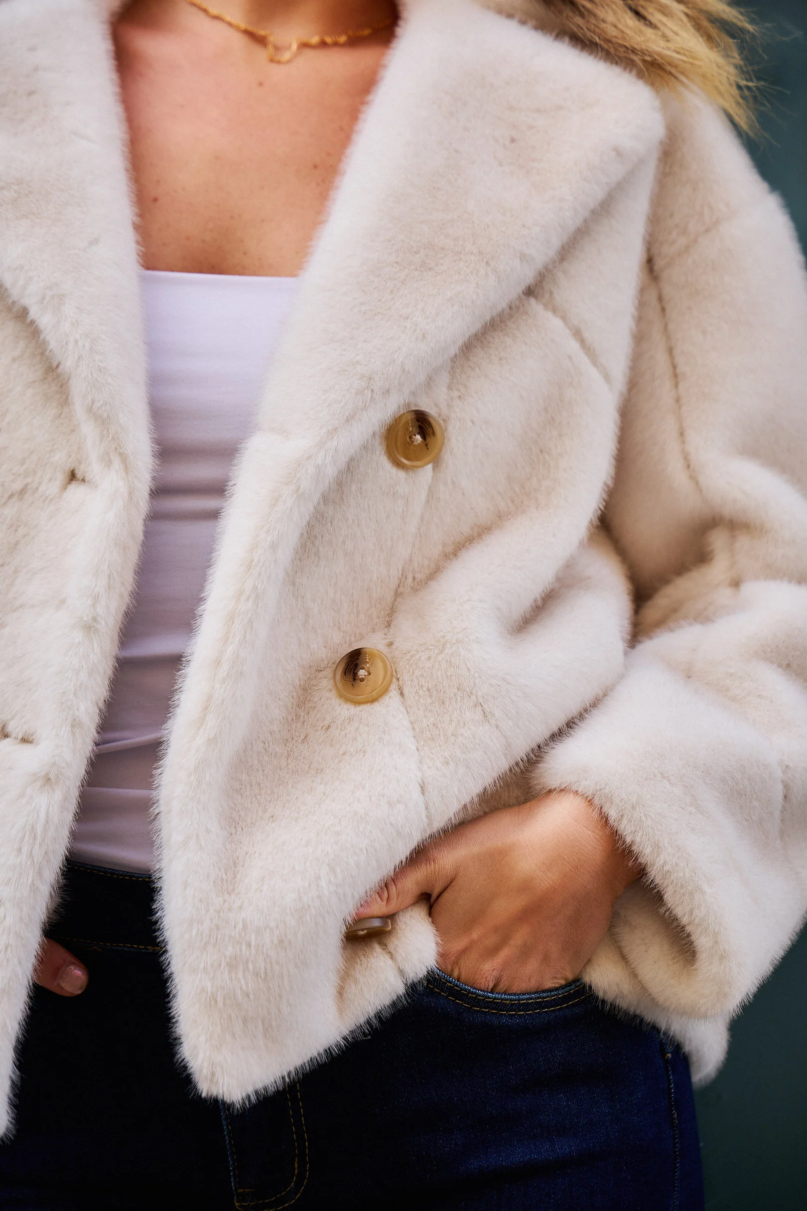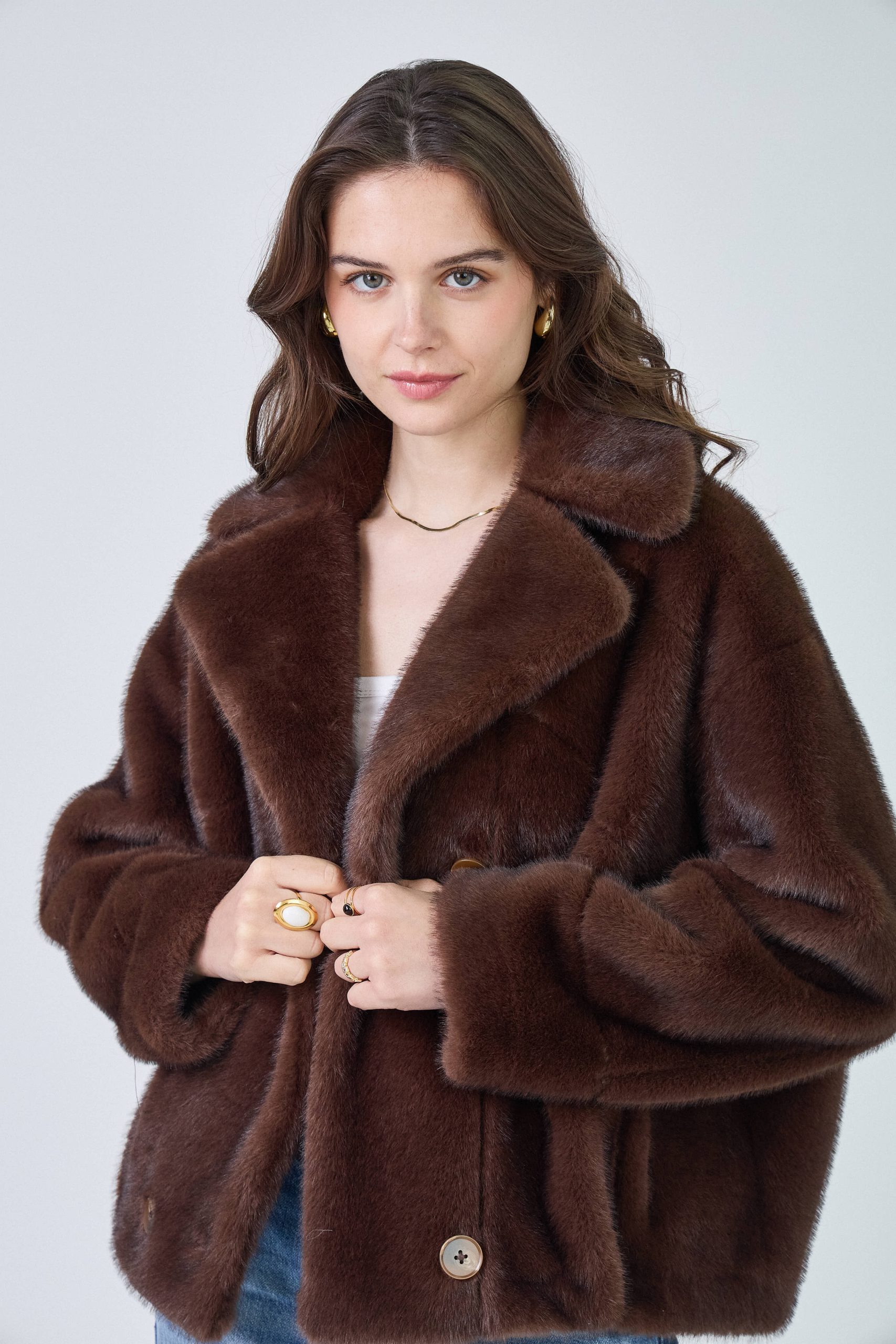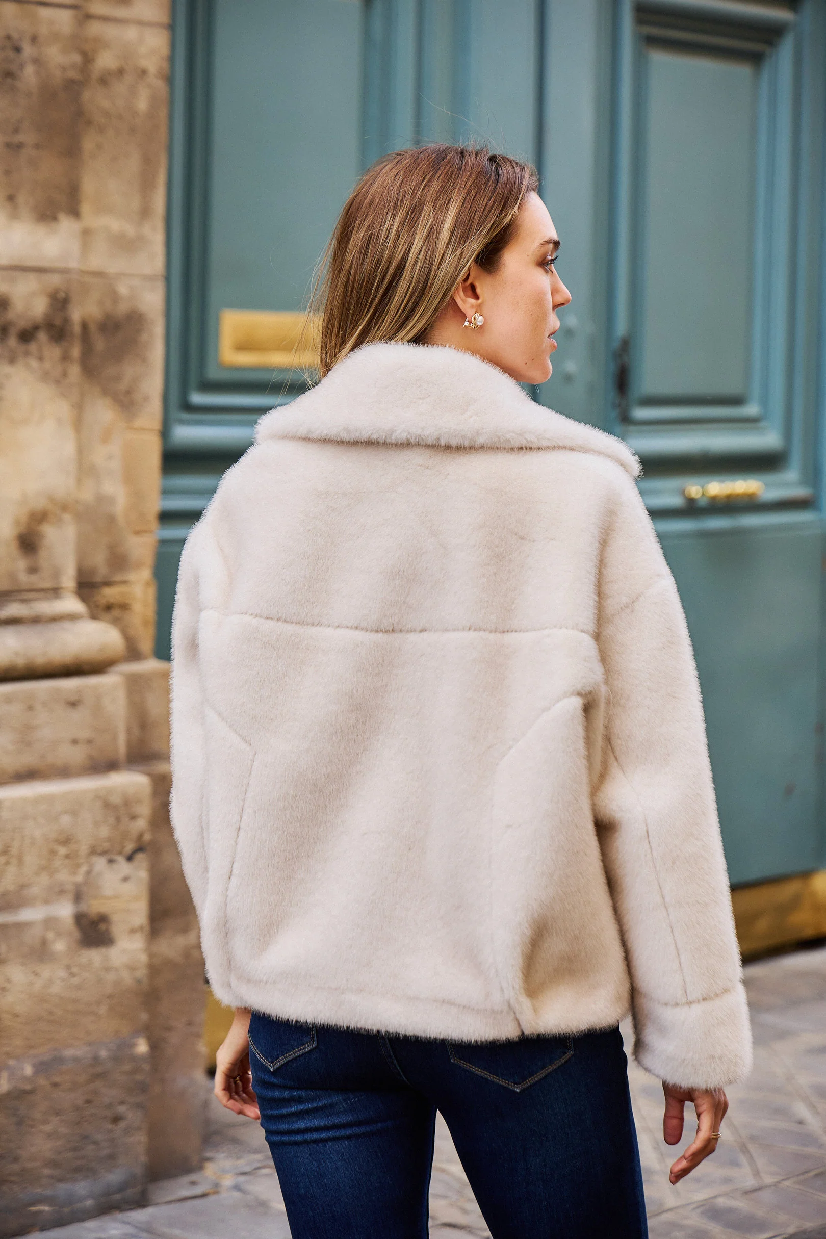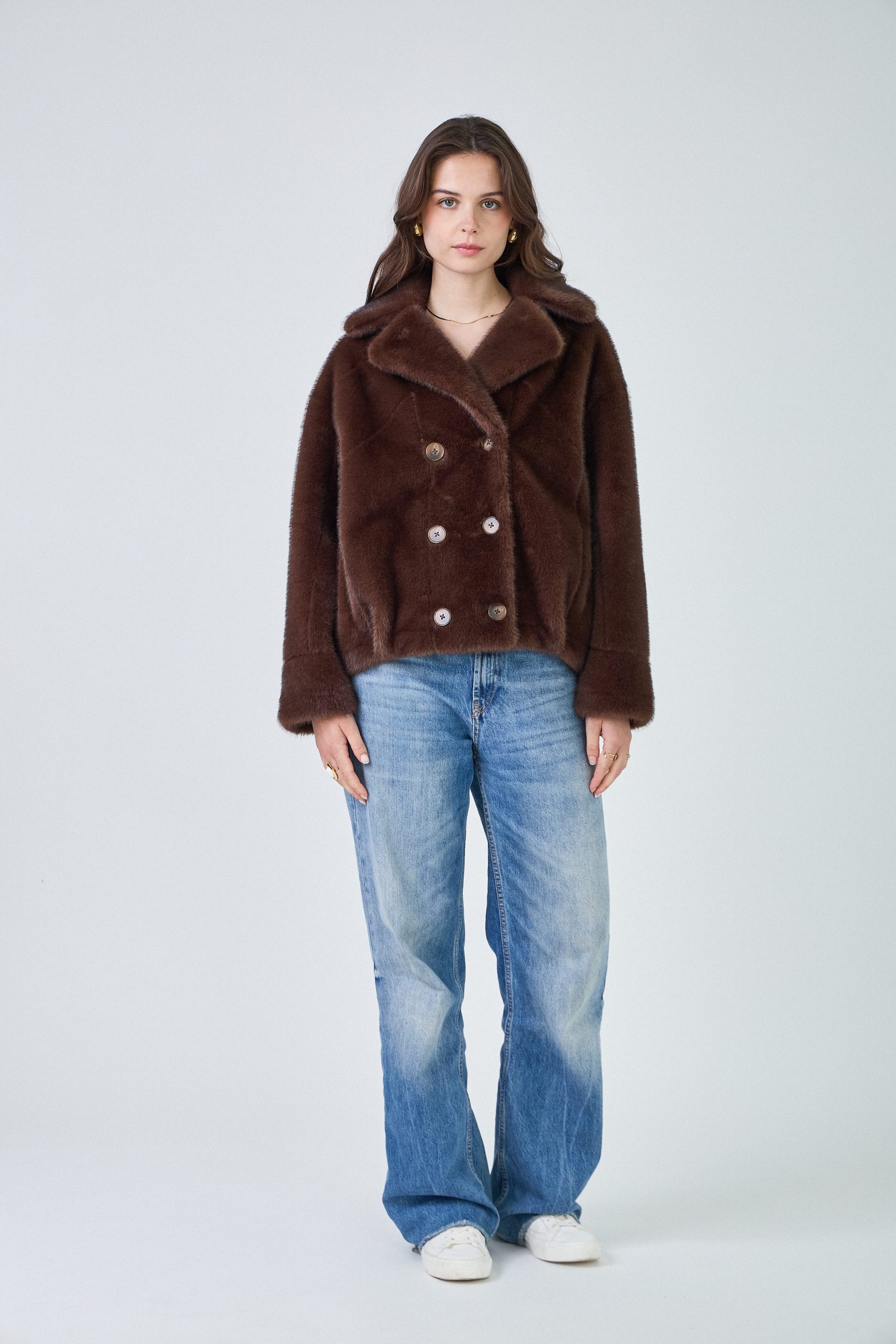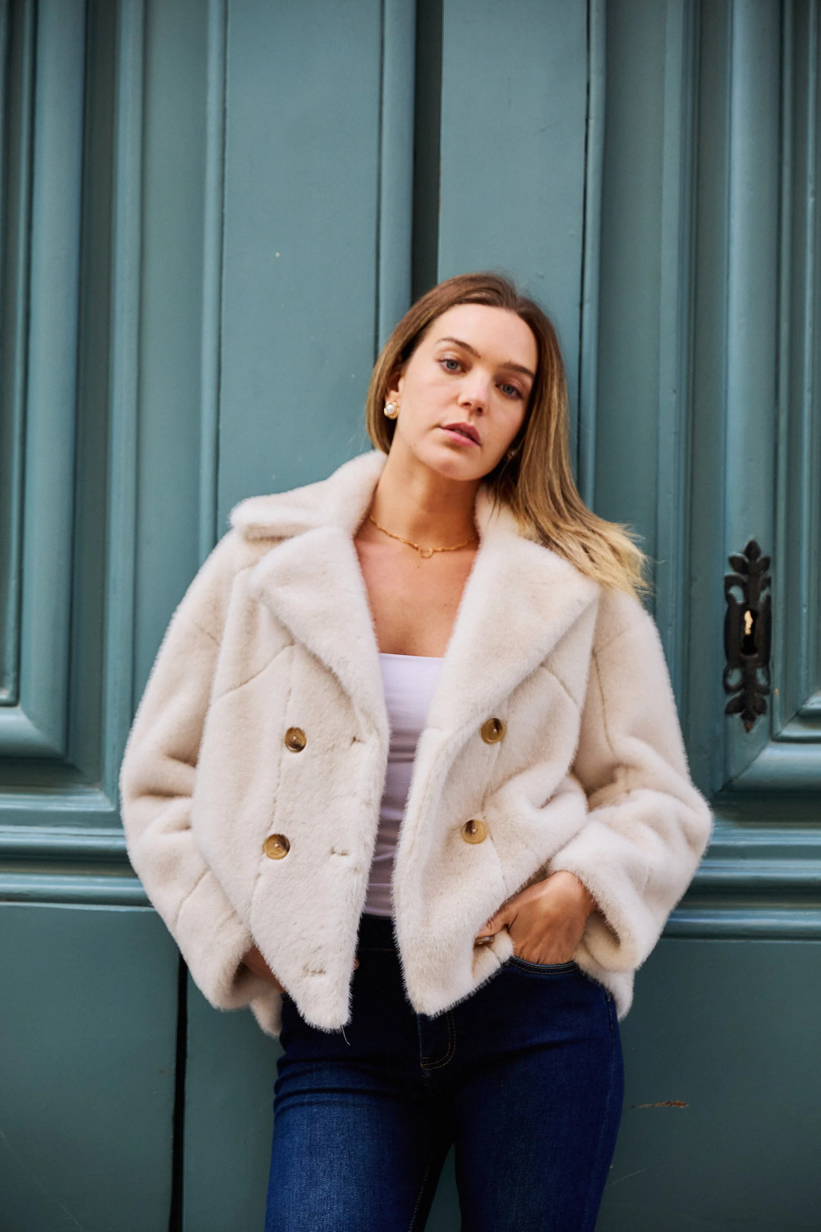 La veste Zoé séduit par sa coupe courte et ses boutons dorés, qui apportent un contraste chic à son tissu duveteux. Idéale pour la mi-saison, elle complètera vos looks avec une touche sophistiquée et élégante.
