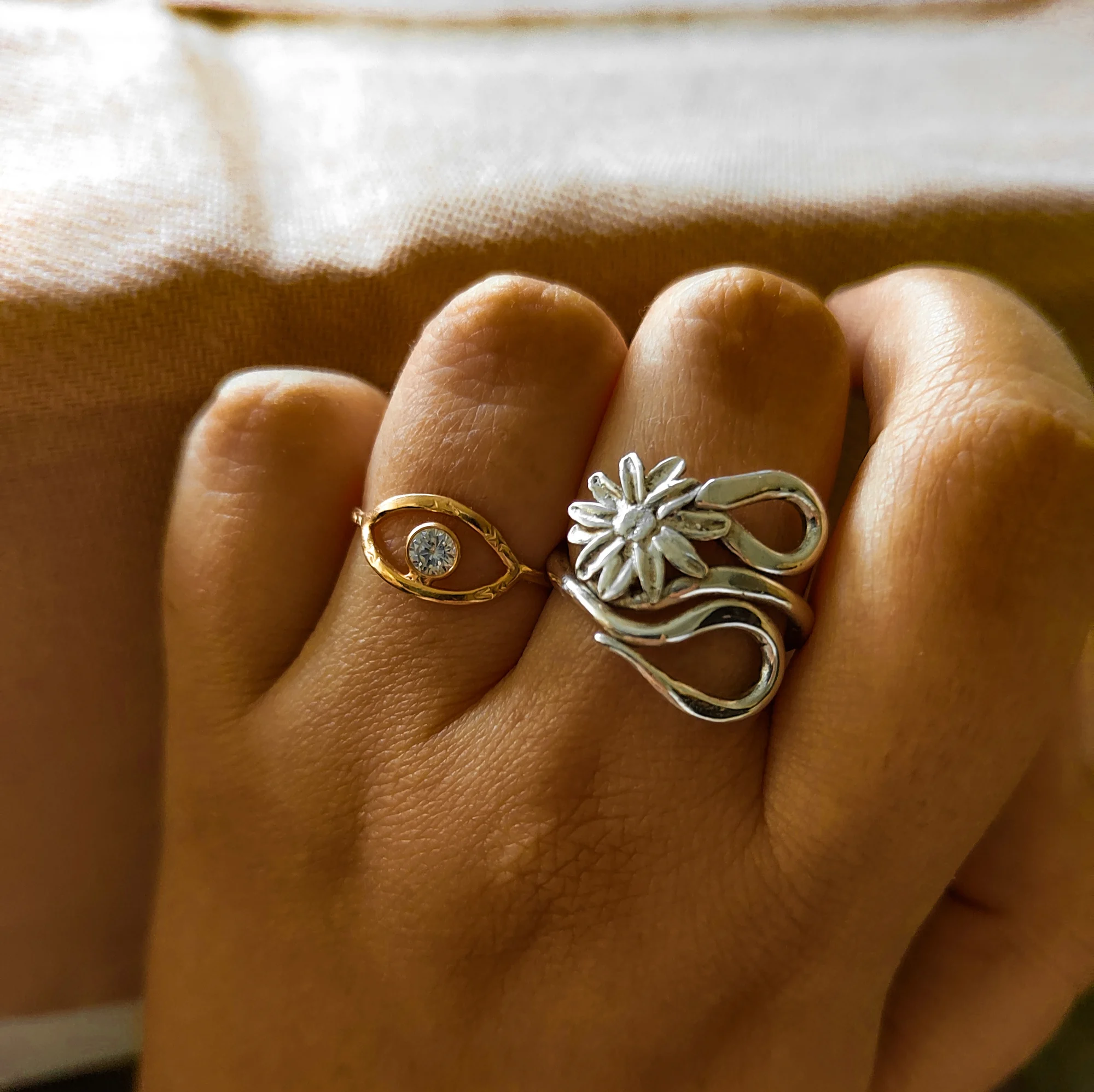 Bague réalisée à la main en fil d’argent 925 sertie d’une fleur en argent 925.