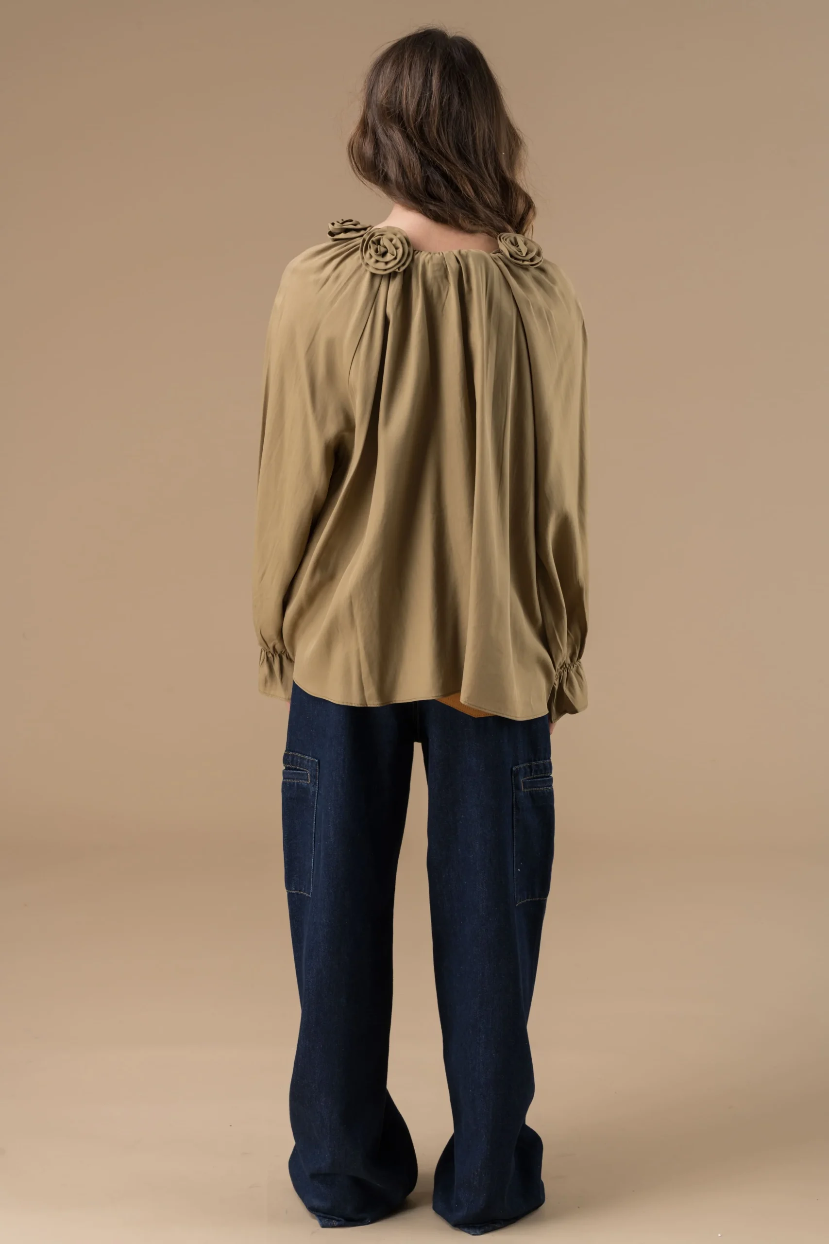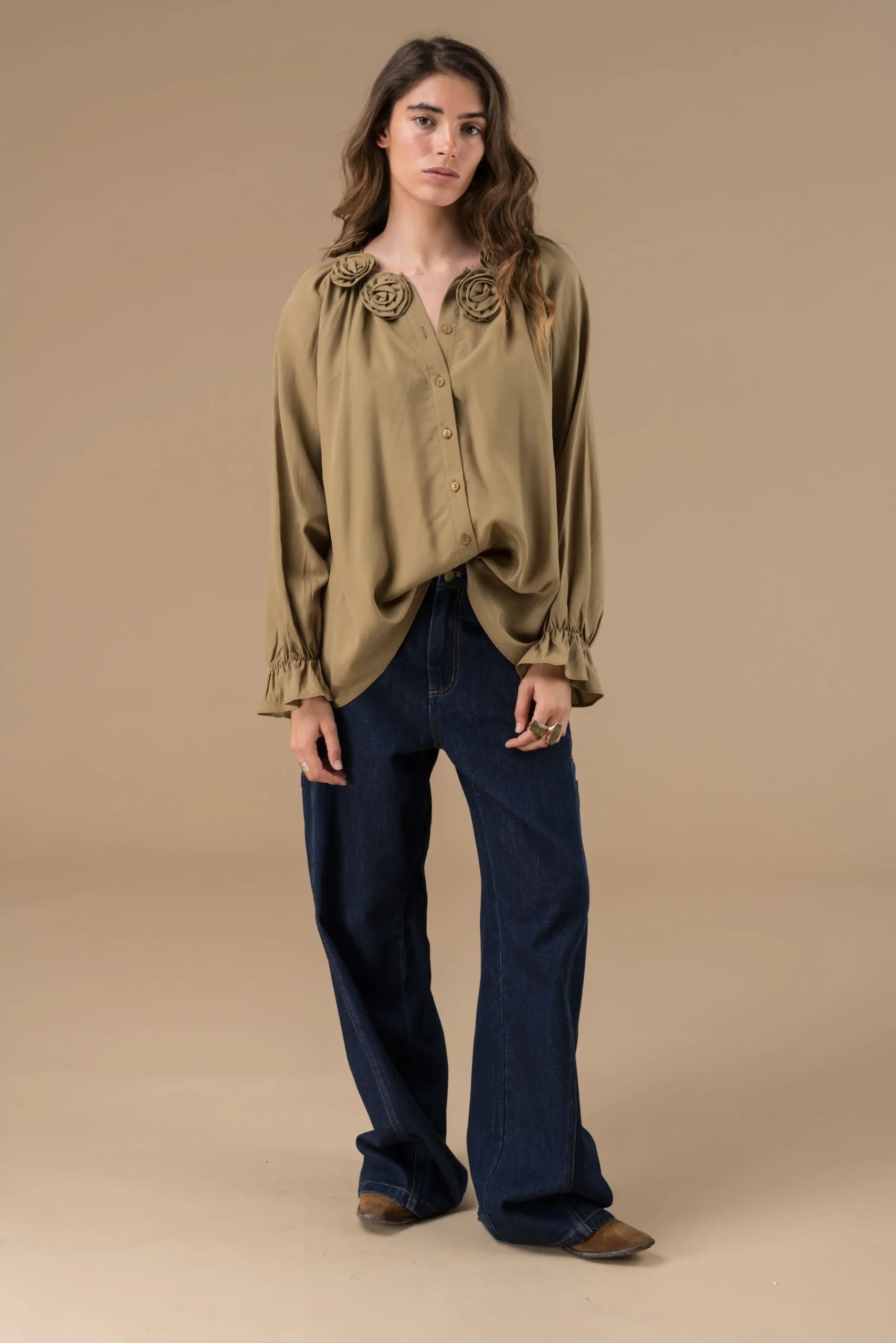 Blouse Amaryllis Army boutonnée, dont le col est ornée de fleurs en tissu, comme des roses, rehaussant le volume du vêtement d’un ensemble floral qui apporte une touche moderne et unique. Les manches élastiquées au poignet, s’élargissent pour donner, là aussi, du volume et libérer le mouvement des mains.