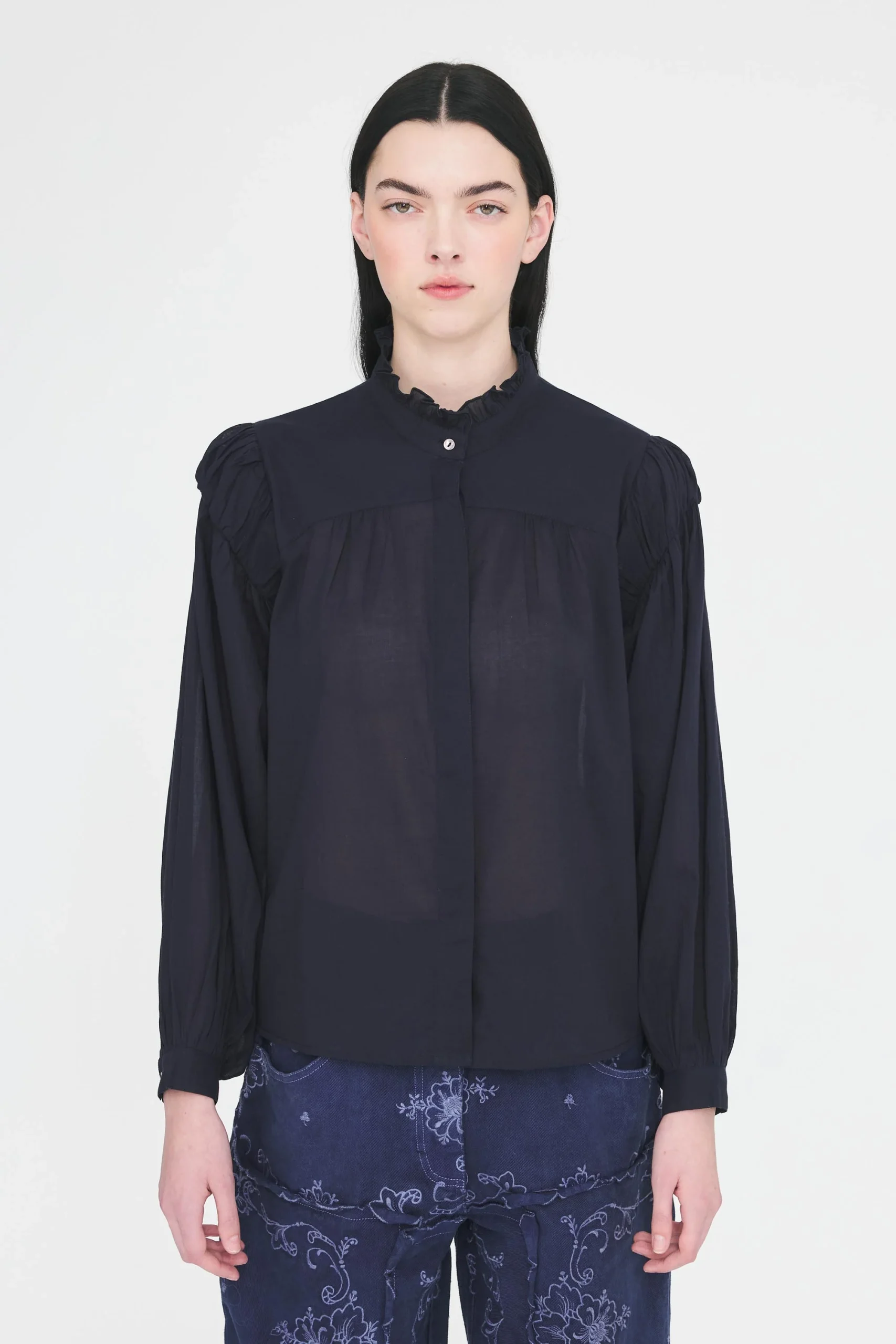Blouse en voile de coton. Manches longues. Fronces au niveau de la poitrine et aux épaules. Mini col montant volanté. Patte de boutonnage dissimulée.