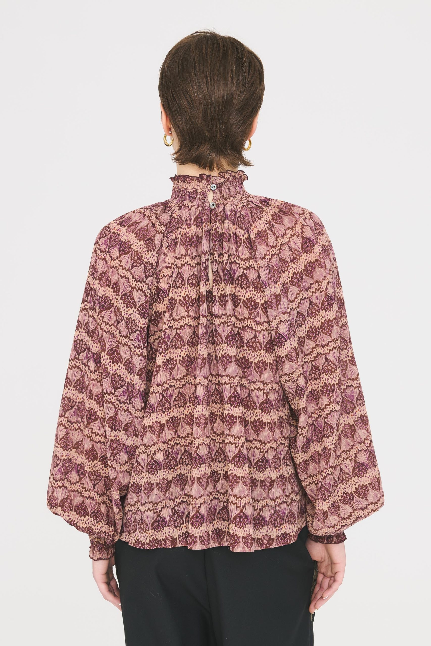 Blouse ample en coton et viscose imprimé. Petit col élastiqué qui se ferme par un bouton. Poignets élastiqués.