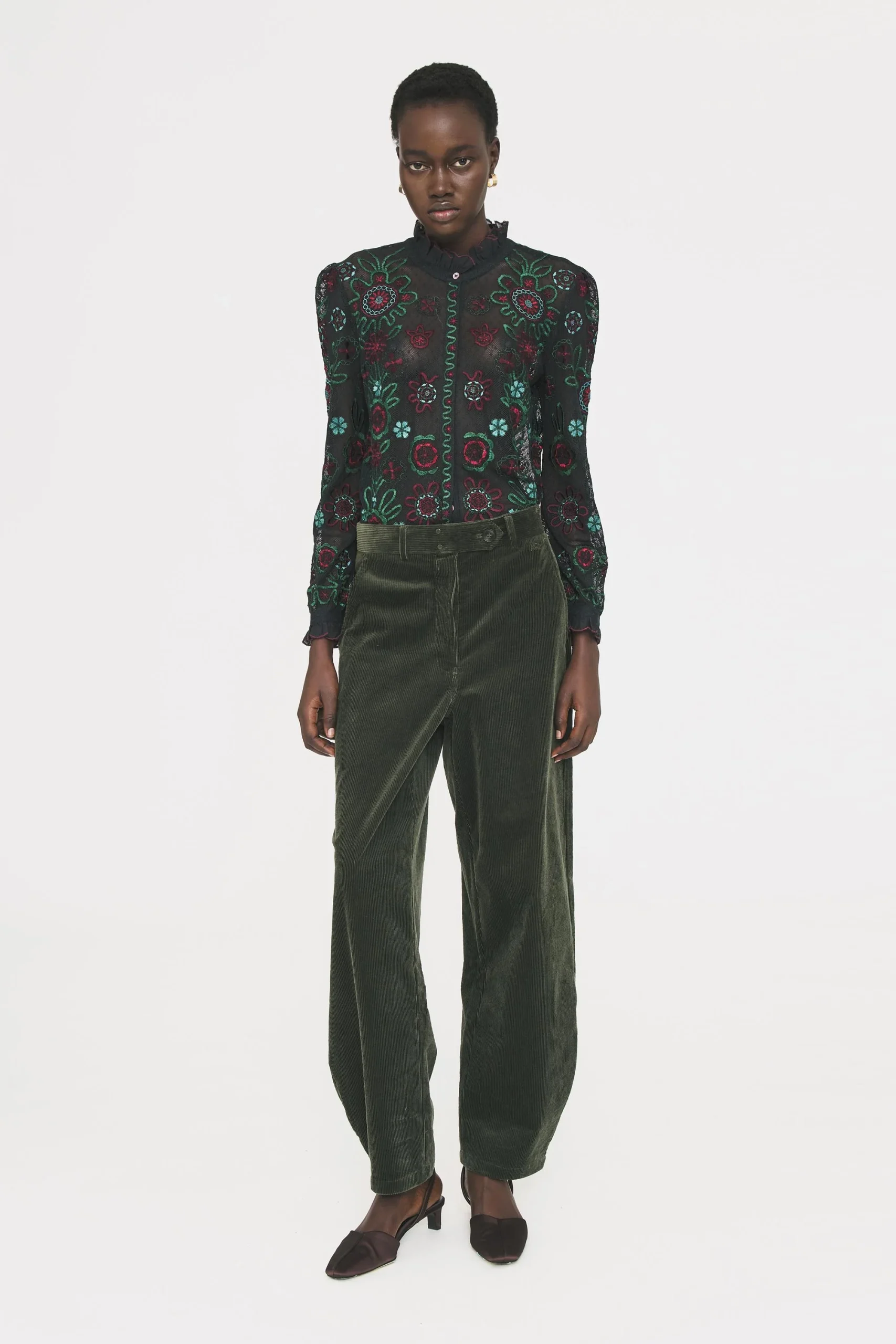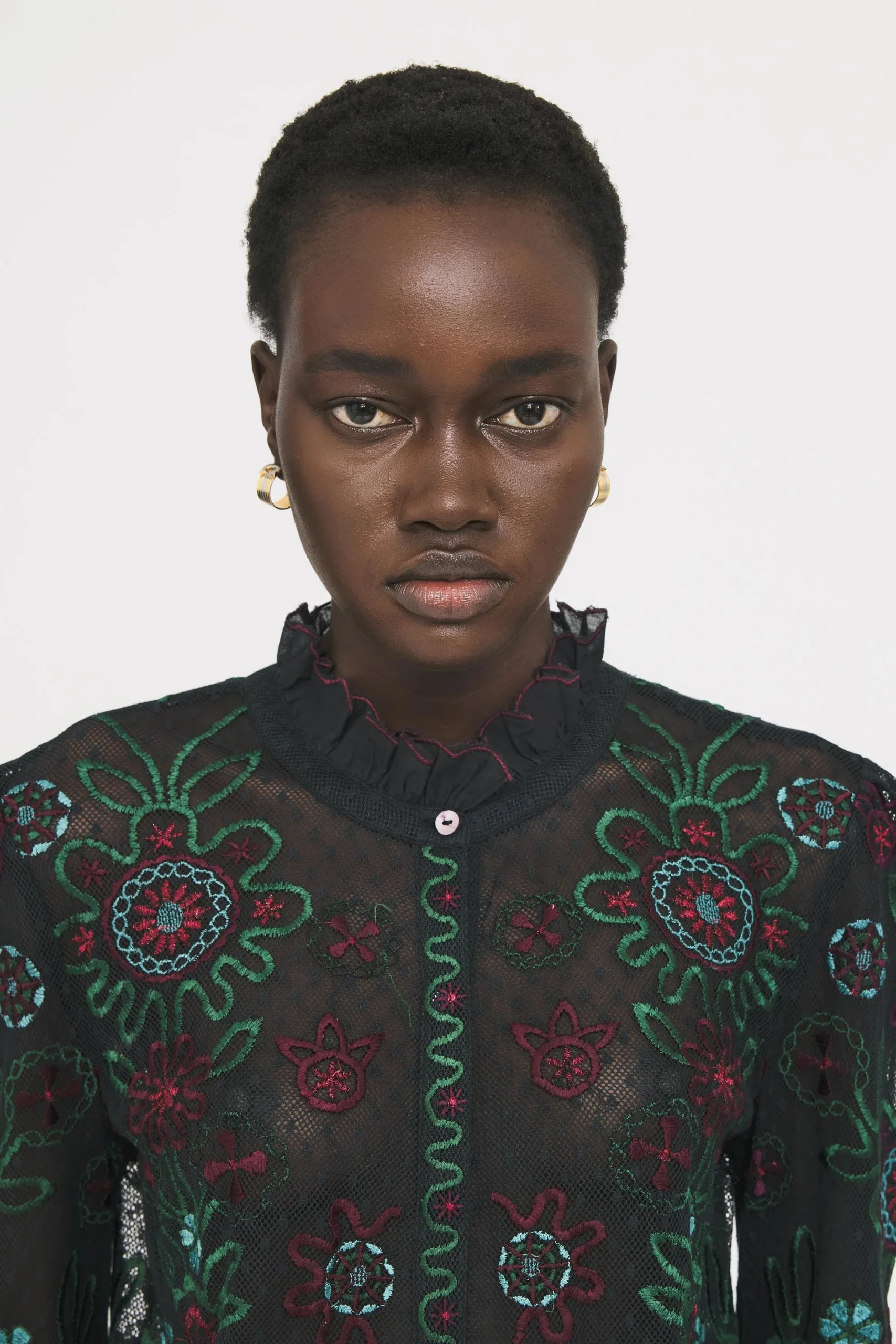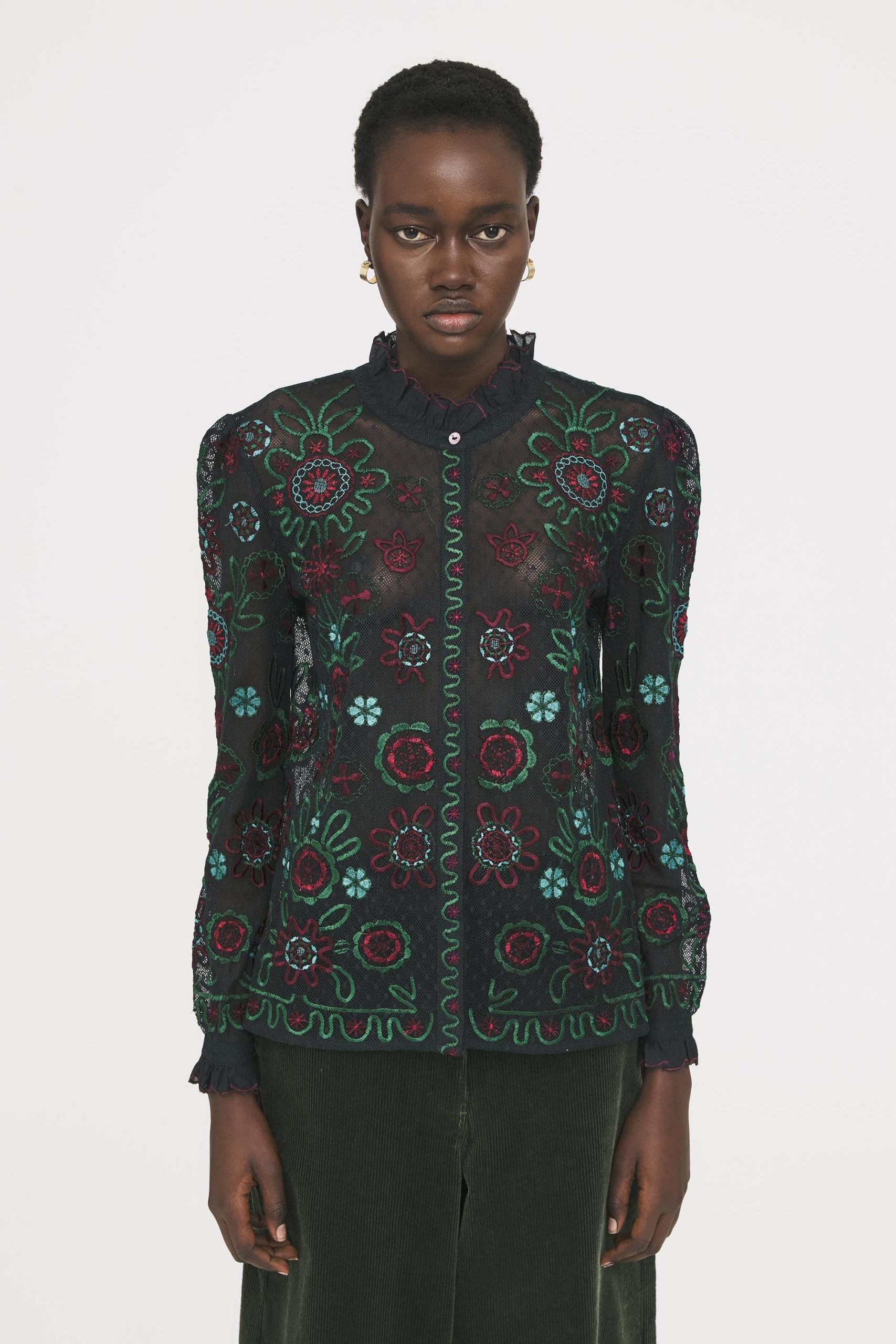 Blouse brodée en résille de coton. Résille avec dessin plumetis. Broderies florales et bicolores. Poignets et col cousus en corolle. Fils satinés.