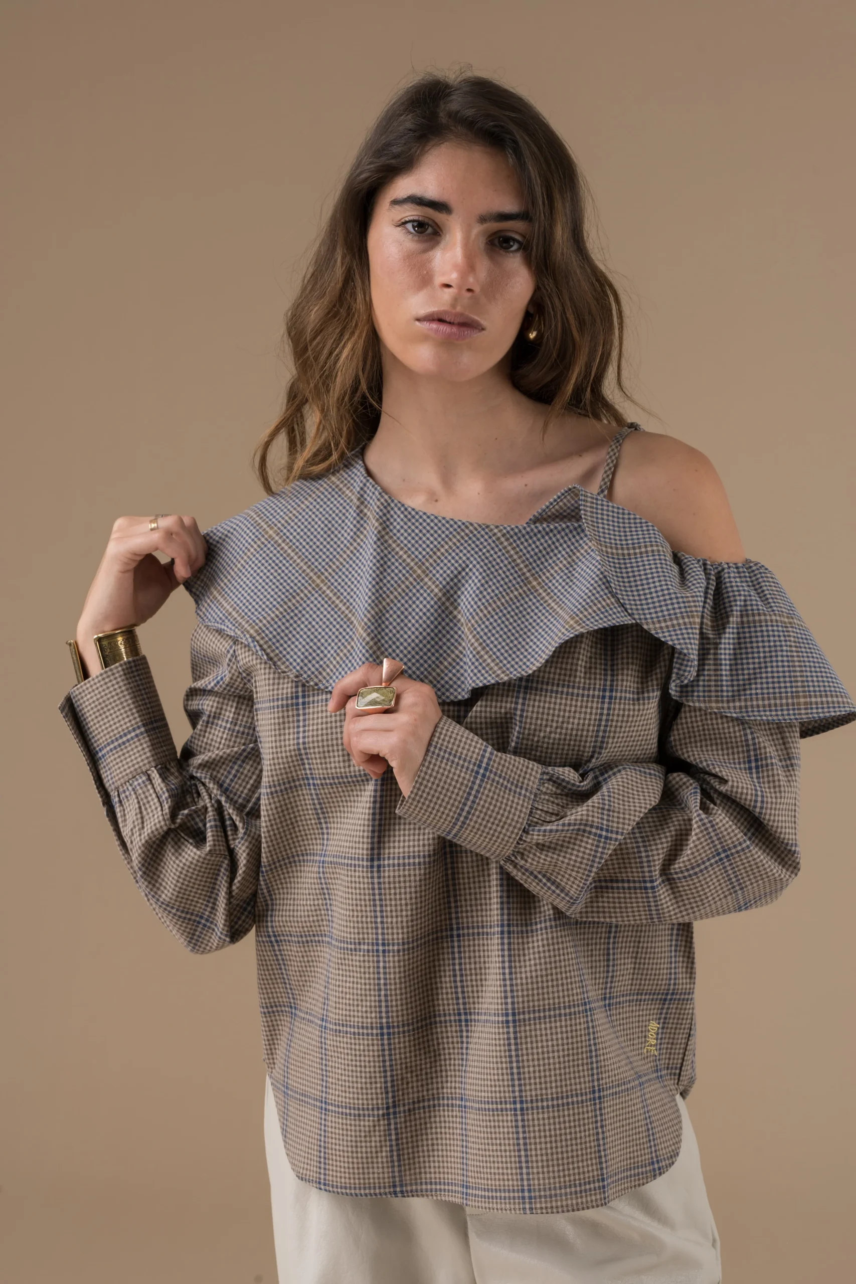 Cette Blouse Hortense carreaux et col à volant se distingue par son col à volant délicat et son imprimé carreaux subtil. Fluide et élégante, elle apporte une touche raffinée à vos tenues, que vous la portiez seule ou sous une veste. Existe en carreaux marine ou bruns.