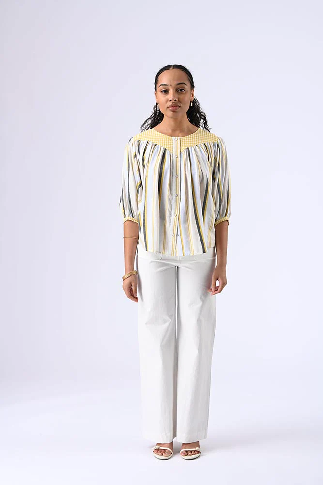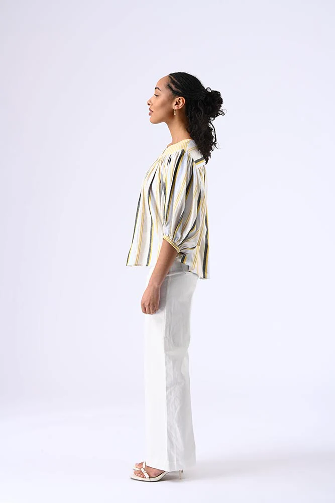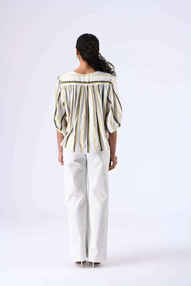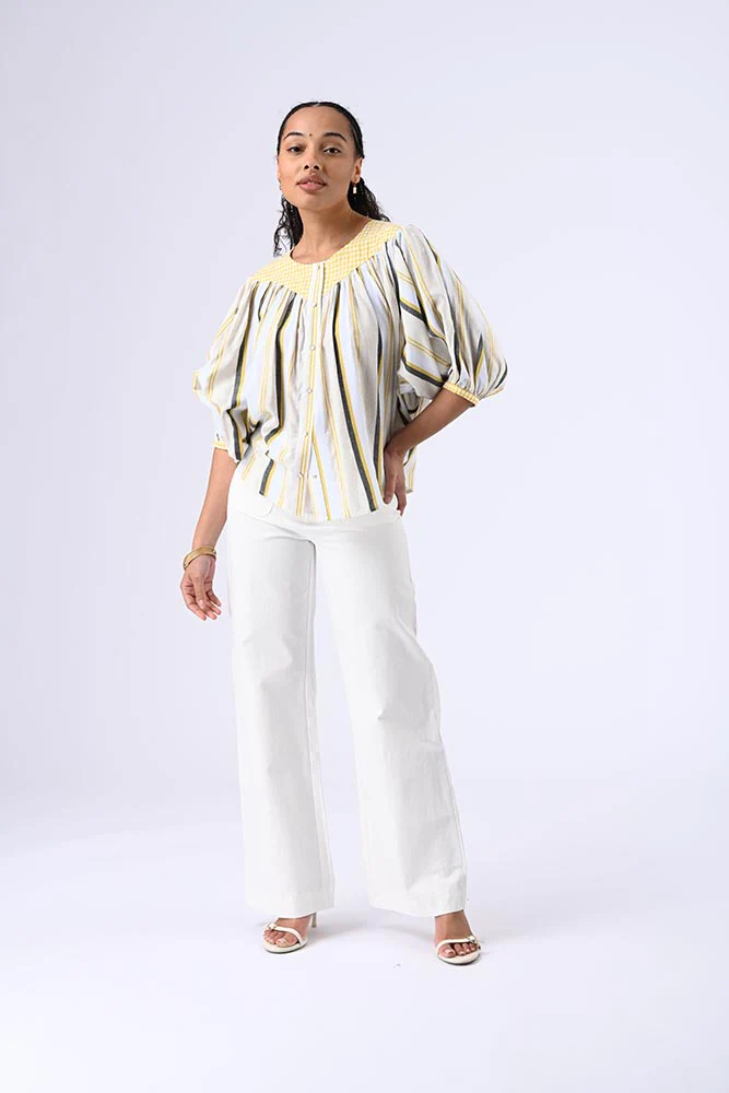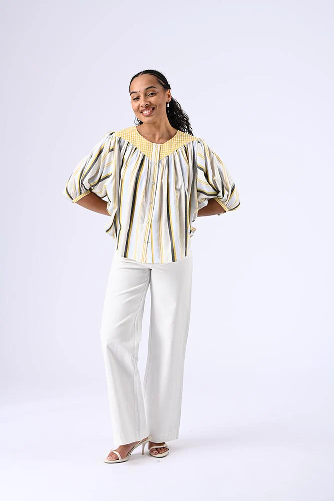 Blouse ample et fluide, manches 3/4 bouffantes, boutons pression en nacre et col rond pour une élégance aérienne et délicate. Couleur beige