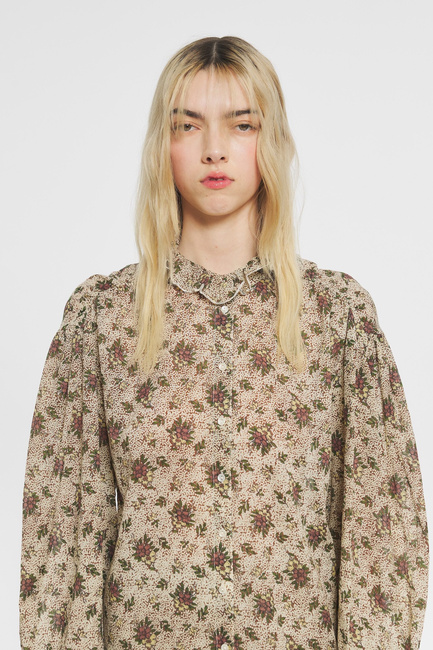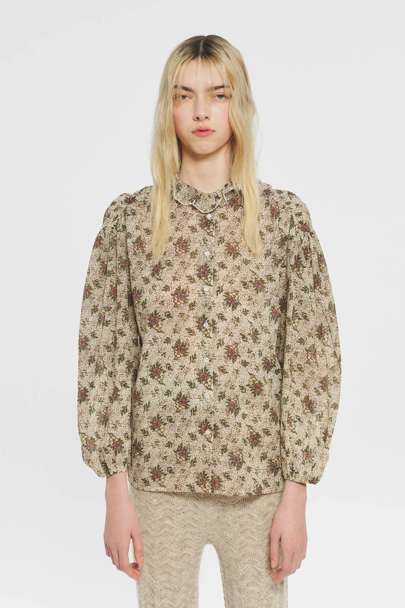 Chemise en voile de coton imprimé. Manches effet ballon resserrées aux poignets par des boutons. Boutons en nacre naturelle. Col froncé légèrement montant.