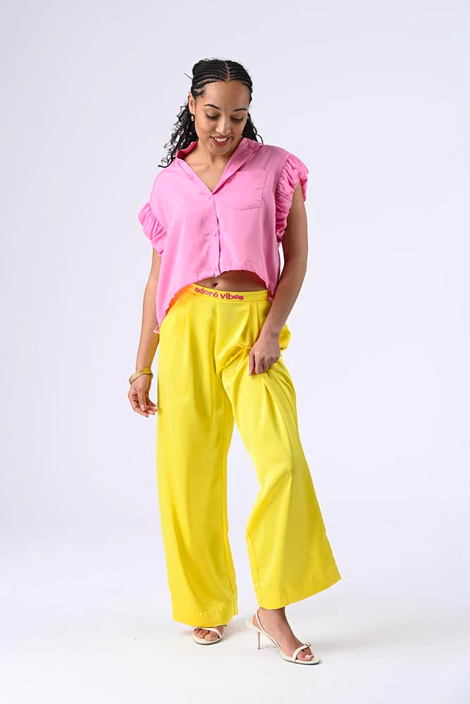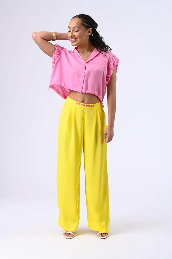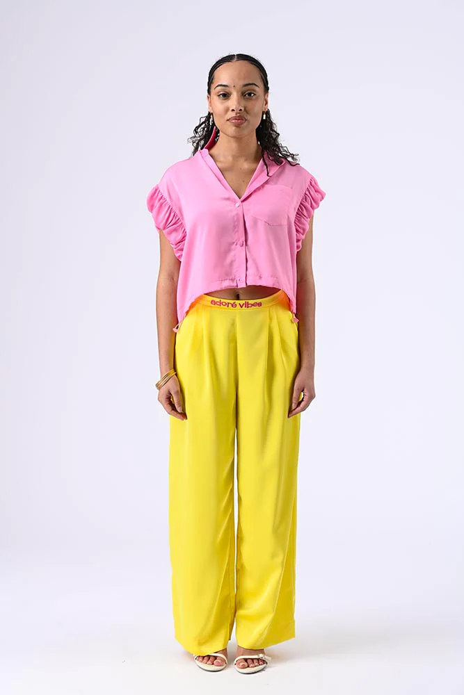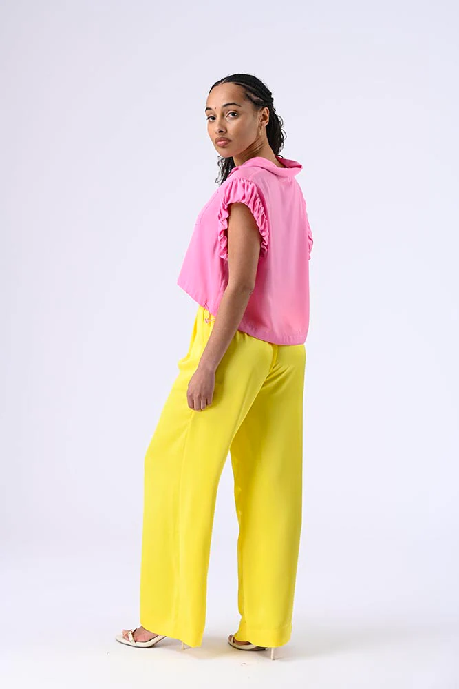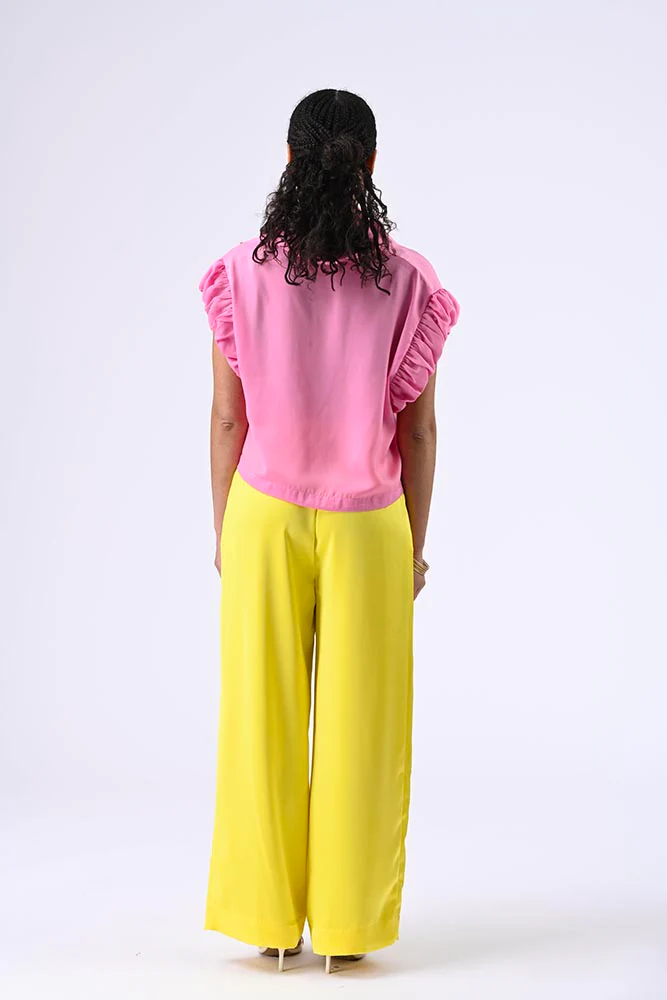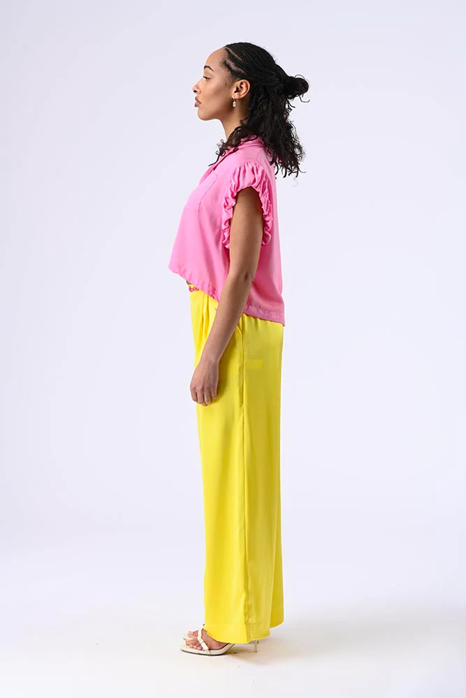 Blouse à manches courtes volantées, col classique, boutons, petit poche et lien de resserrage sur le bas pour une silhouette délicate et flatteuse. Couleur rose