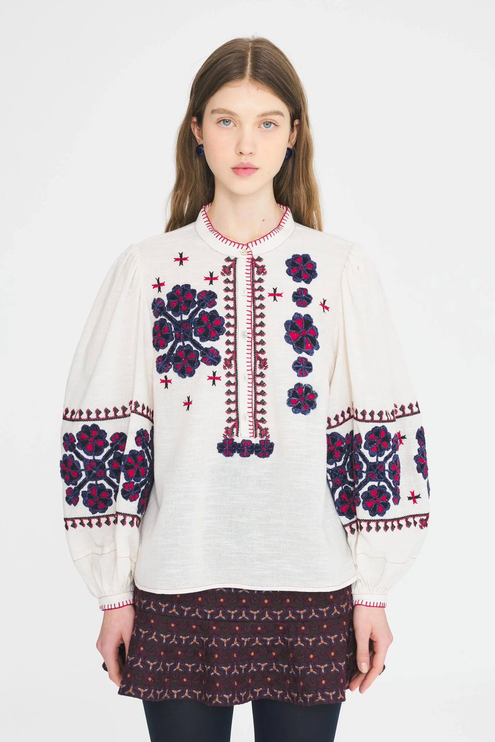Blouse en coton d’inspiration hongroise. Broderie chenille avec une texture douce et moelleuse sur le devant de la blouse et broderie main sur le col, les poignets et la patte de boutonnage.