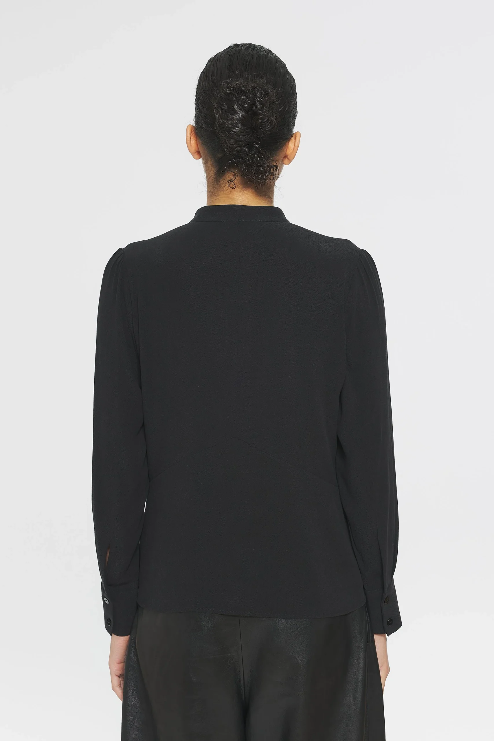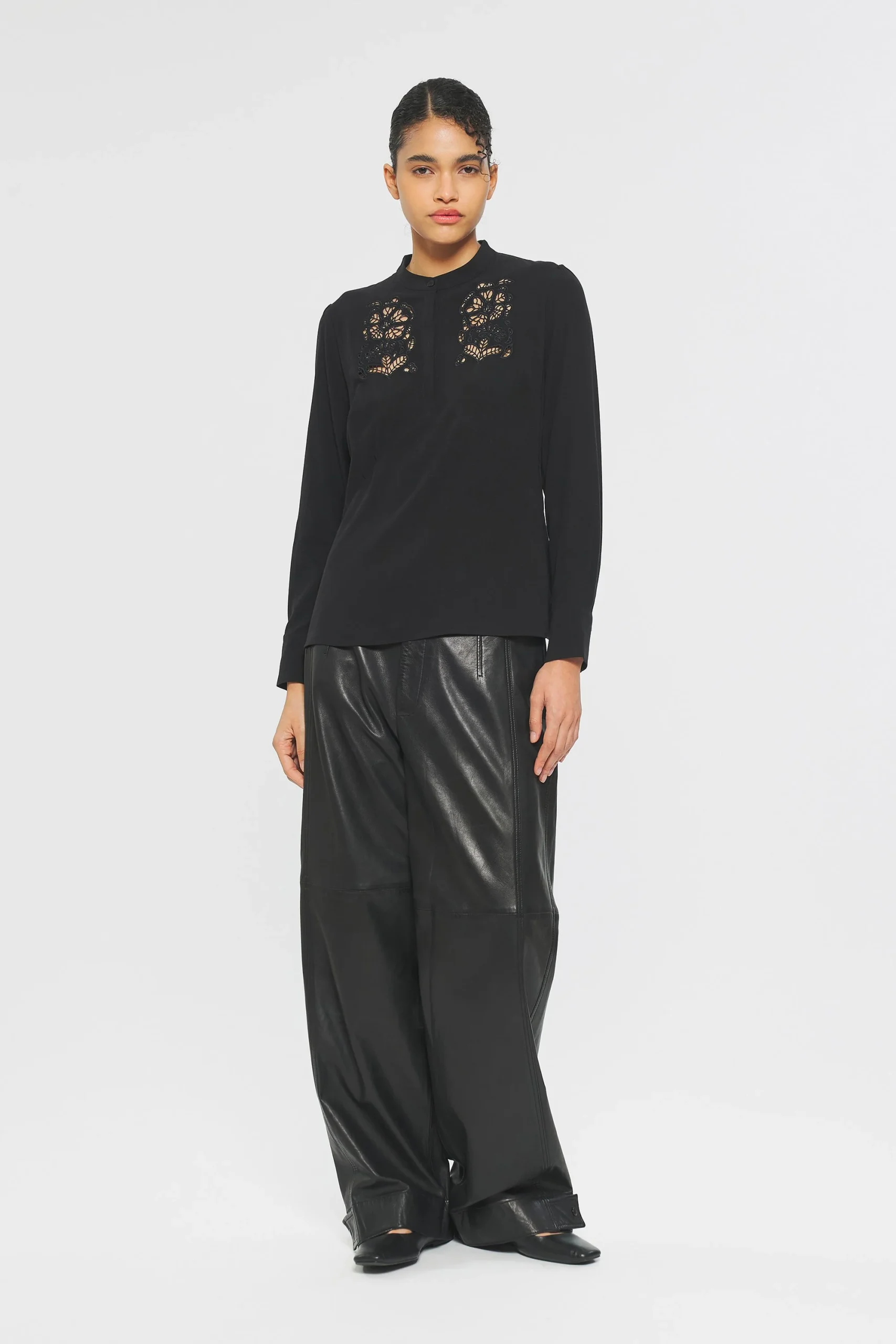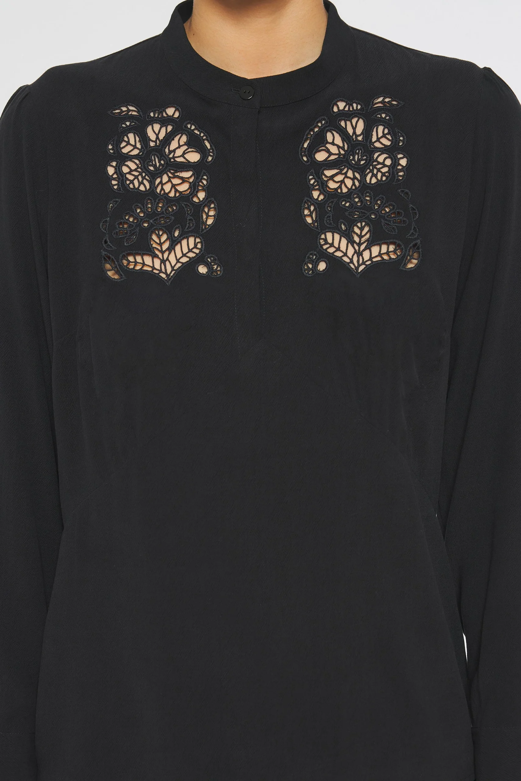Blouse en tencel. Broderies sur le devant ajourées et faites artisanalement. Patte de boutonnage sur le devant et aux poignets. Boutons en nacre naturelle.