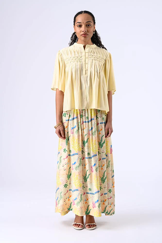 Blouse ample et fluide, manches 3/4 bouffantes, col rond, boutons en nacre et détails ajustés sur la poitrine pour une touche élégante et structurée. Couleur jaune