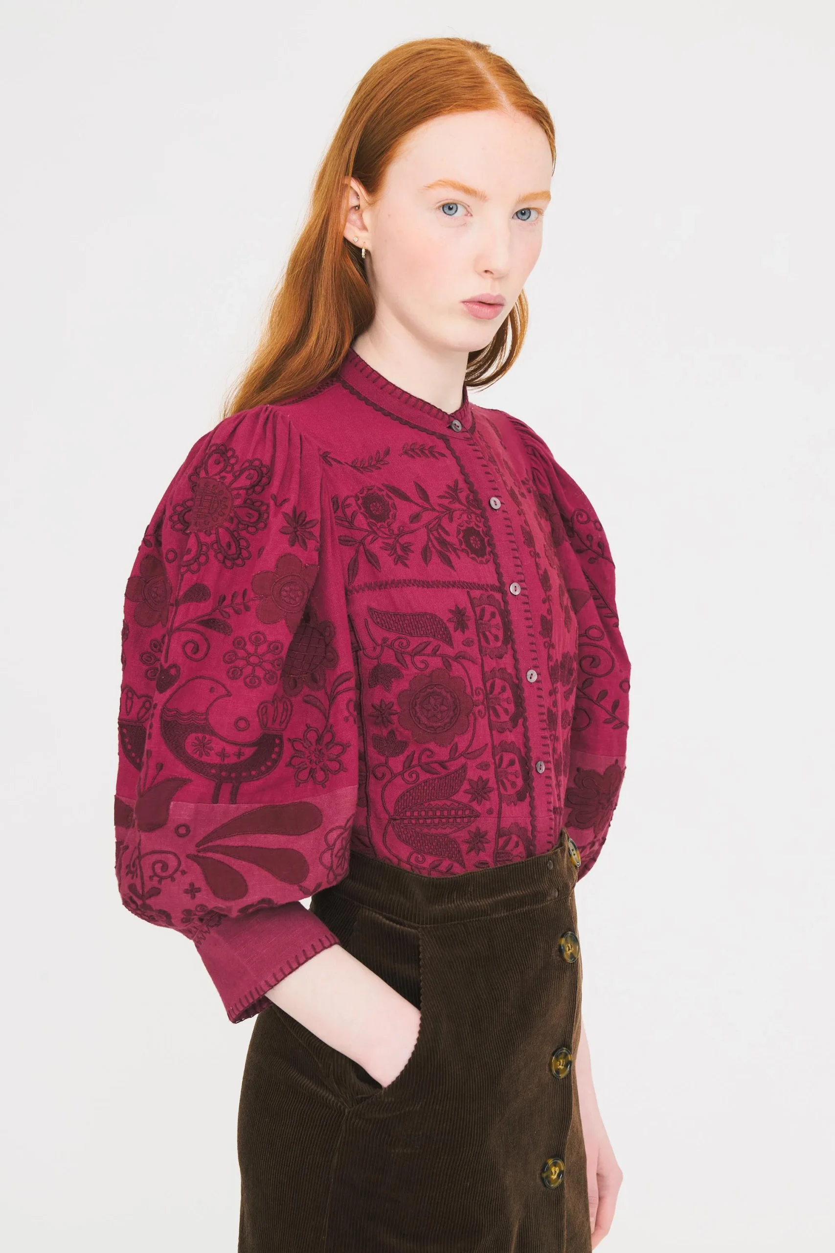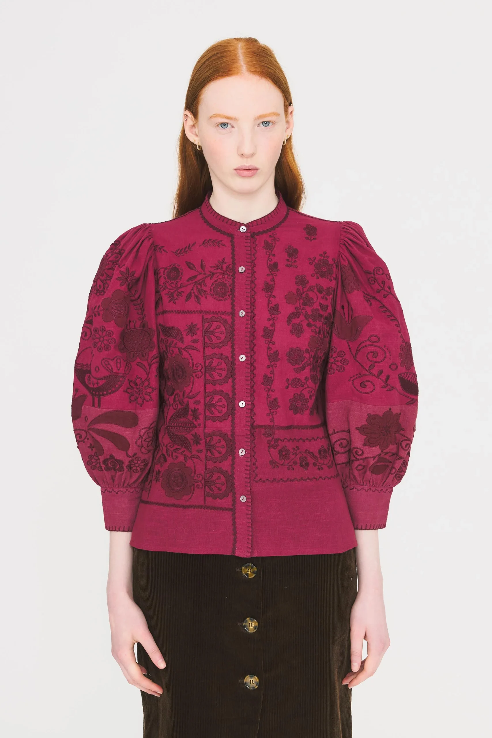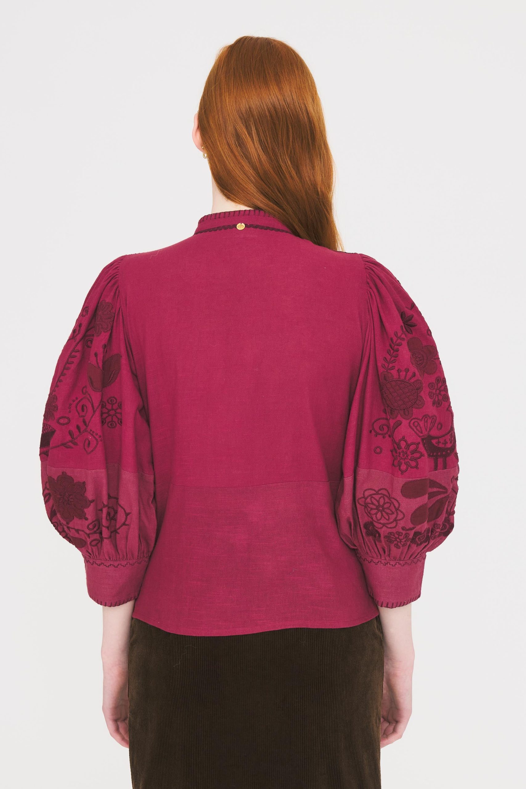 Blouse brodée en gaze de coton. Empiècement de tissu. Fils de différentes tonalités de couleur. Doublure en coton.