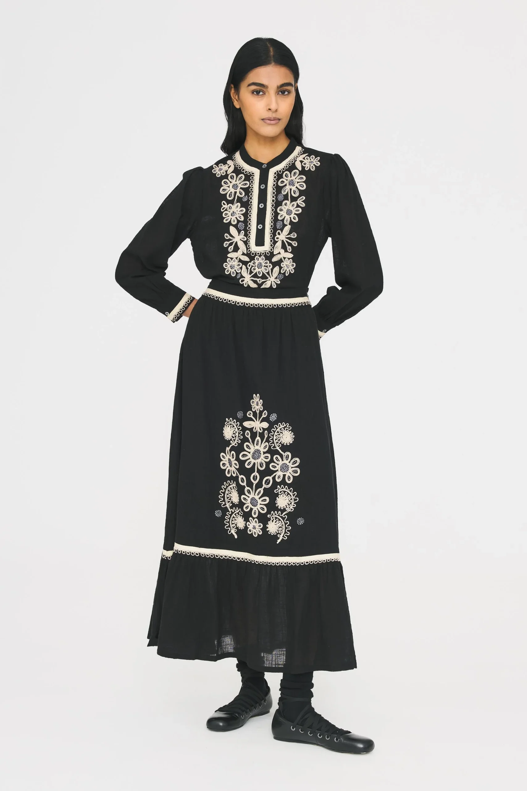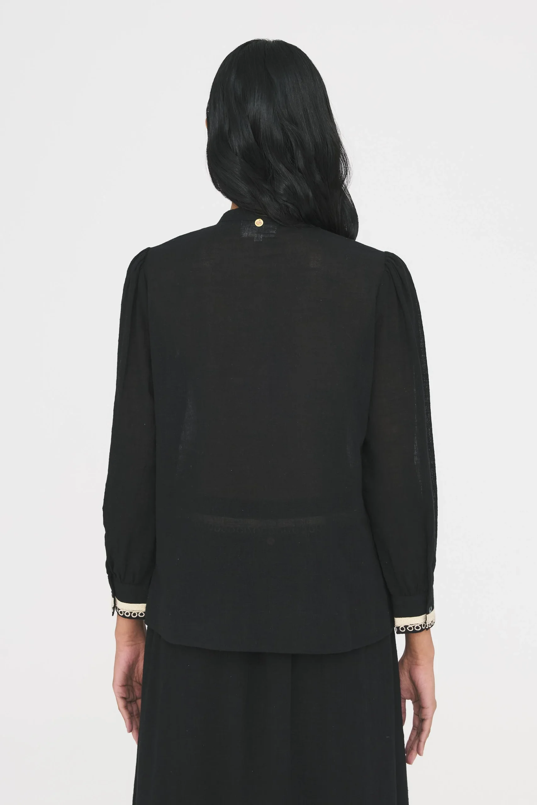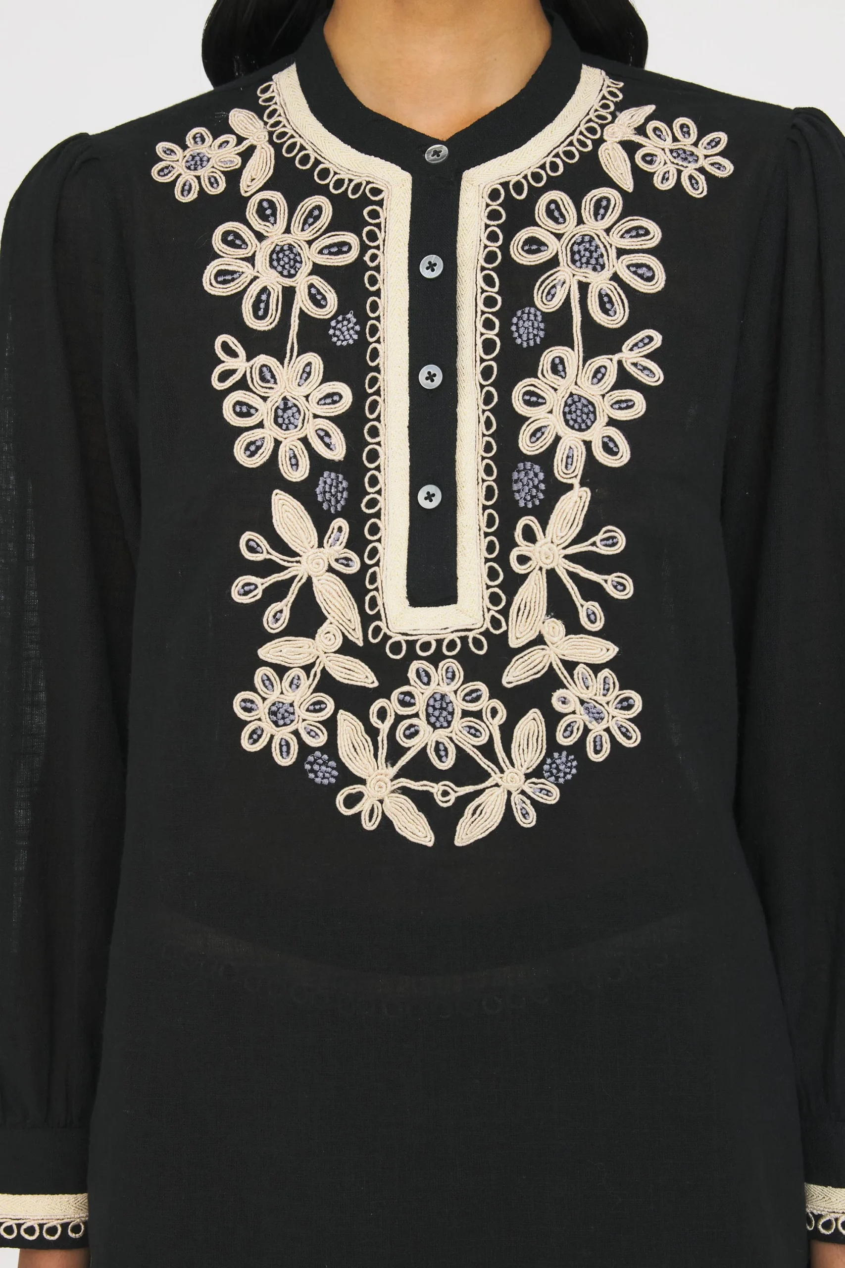 Blouse en coton brodée fils lurex artisanalement. Galon en coton appliqué au col, patte de boutonnage, sur le devant et aux emmanchures. Manches longues.