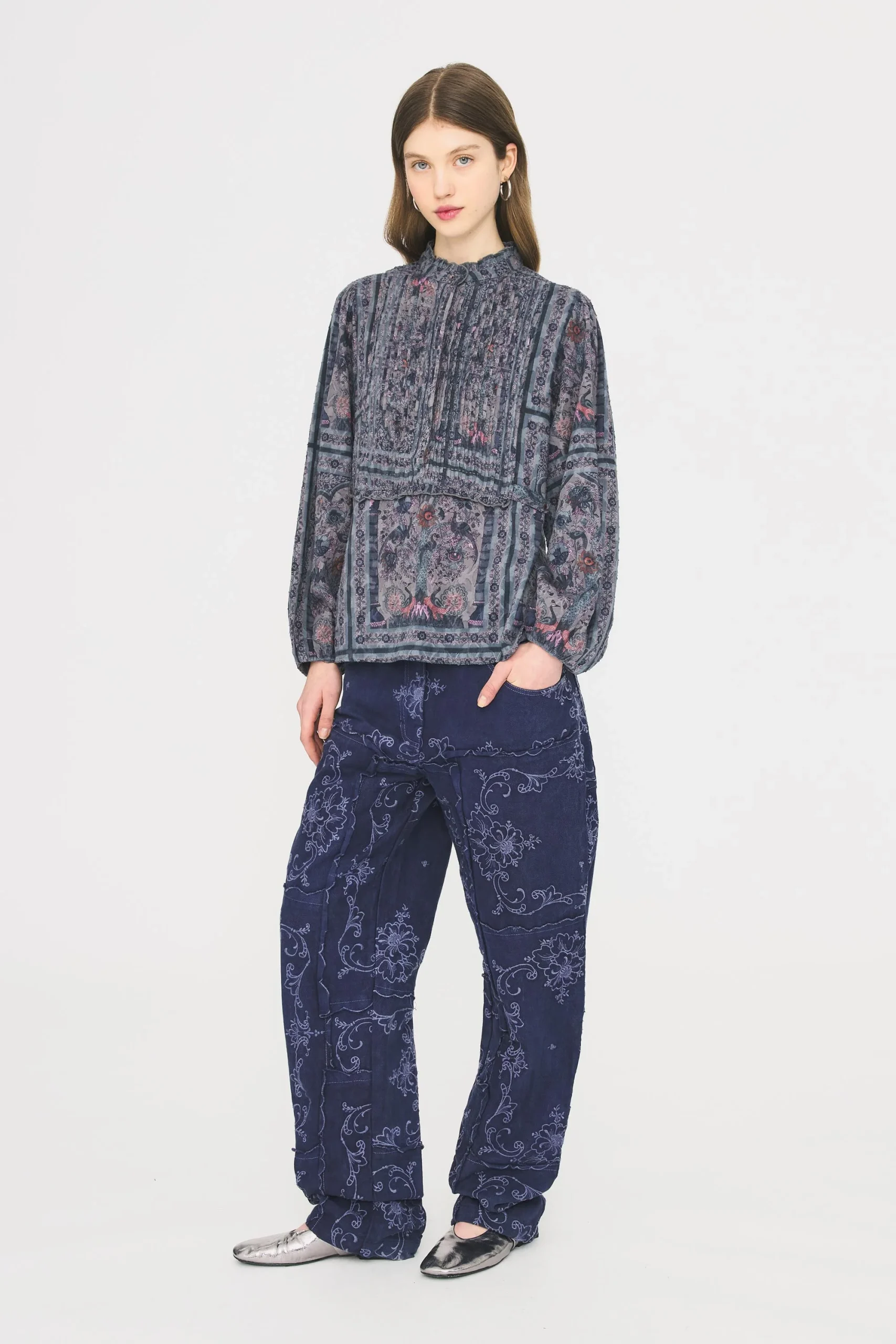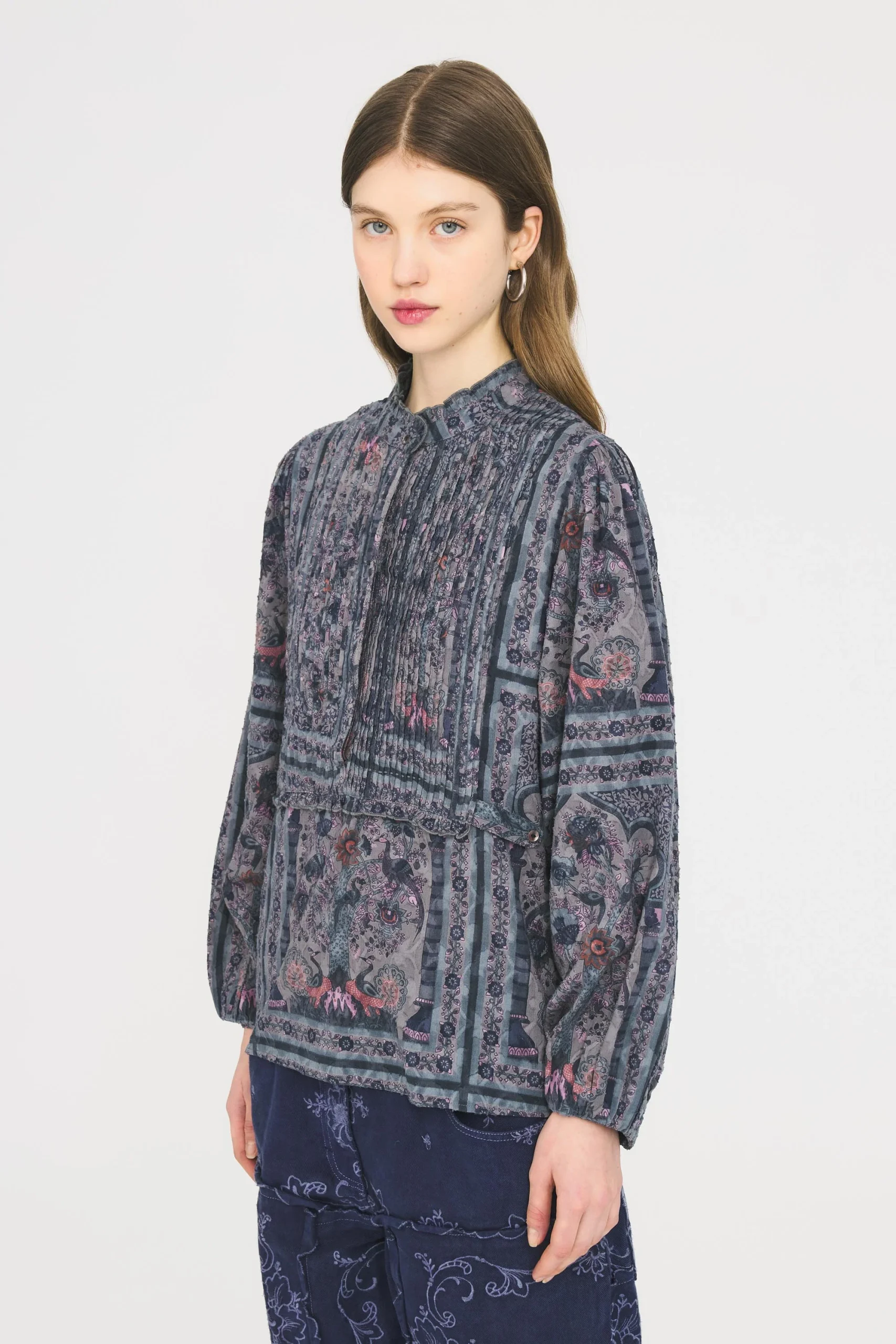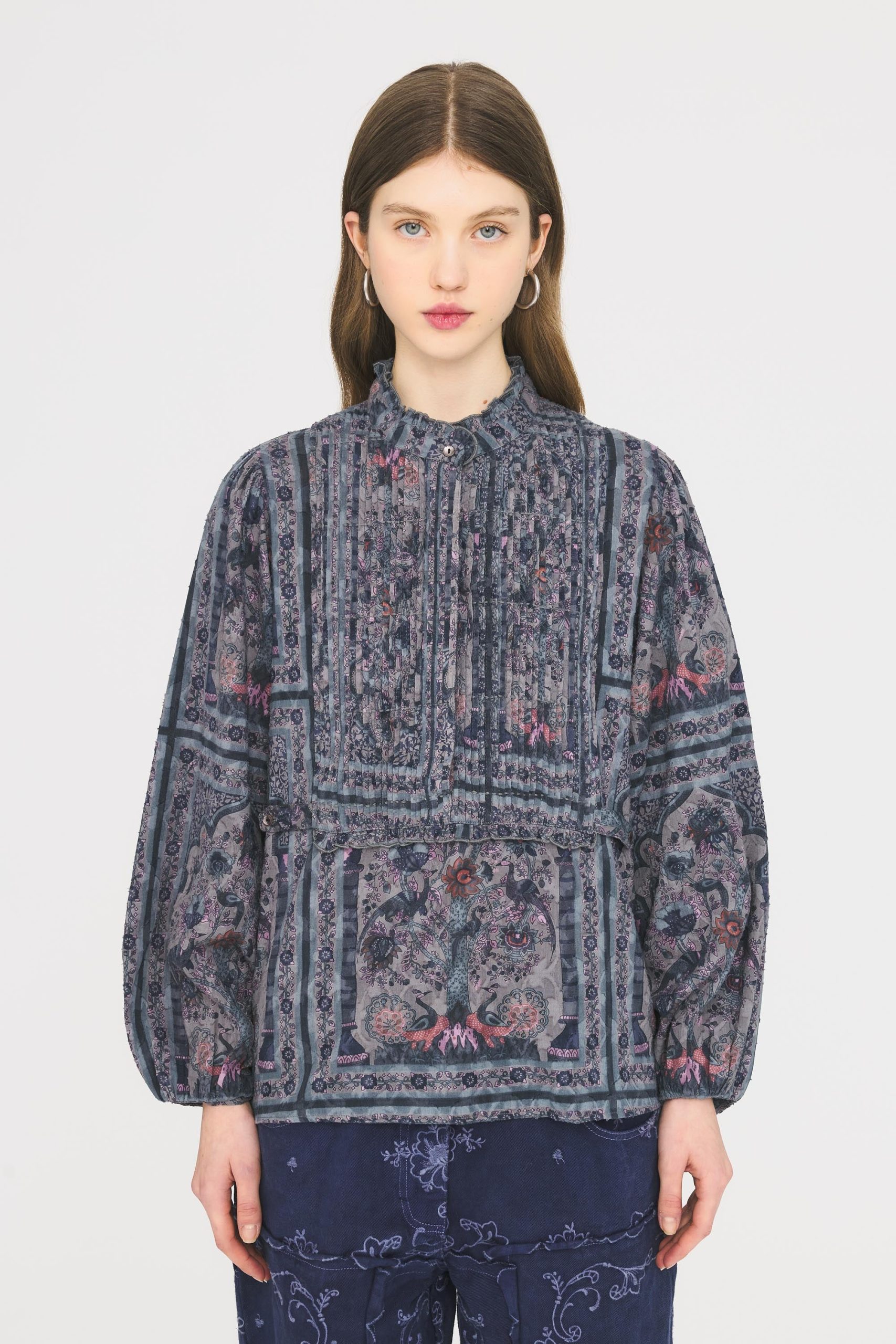 Blouse en jacquard de coton imprimé. Manches longues. Petit volant cousu au centre de la blouse.