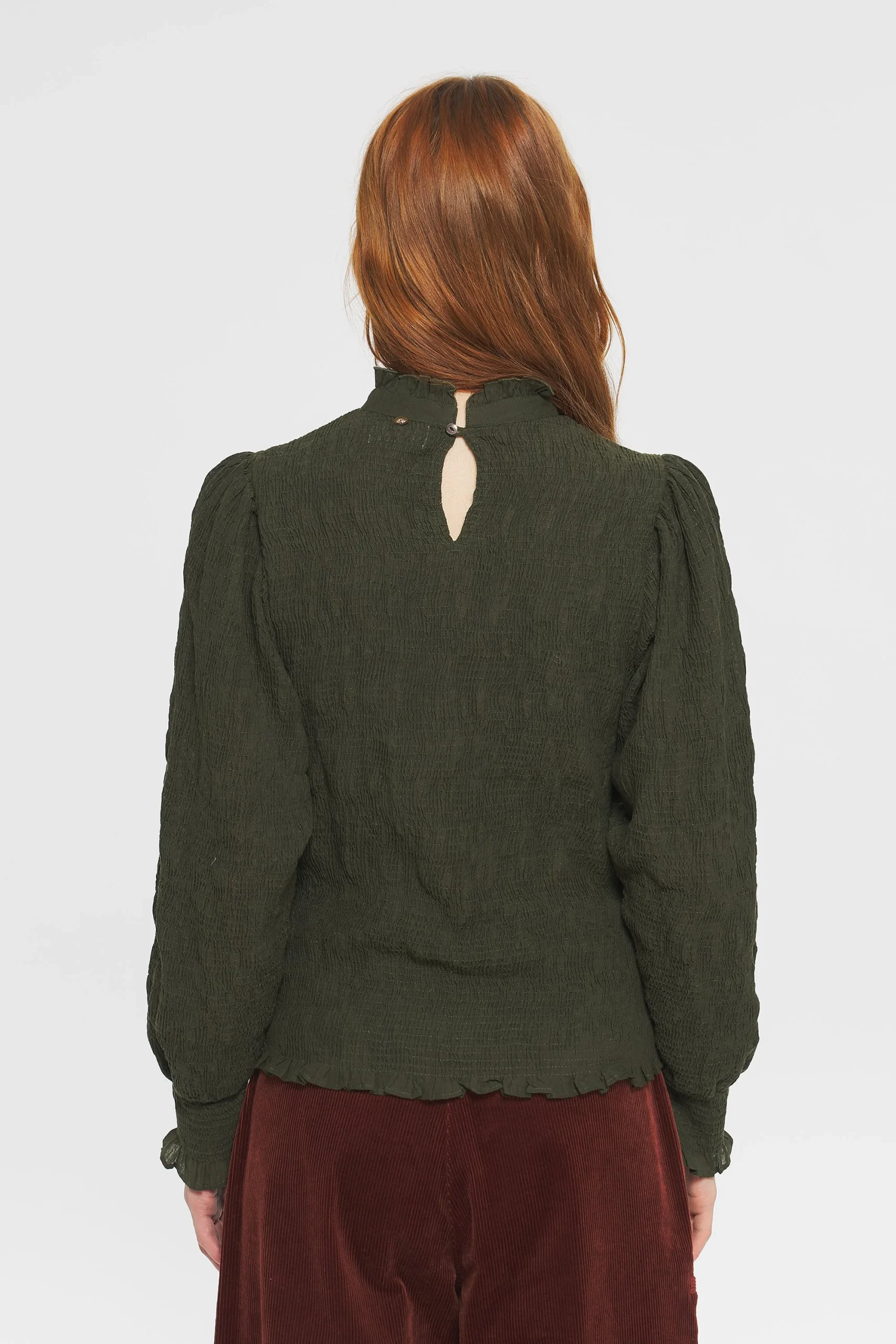 Blouse en voile de coton smockée. Fronces aux épaules et aux poignets. Manches longues resserrées aux poignets par des élastiques. Col, poignets et bas de la blouse volantés. Col rond fermé par un bouton dans le dos. Bouton en nacre naturelle.