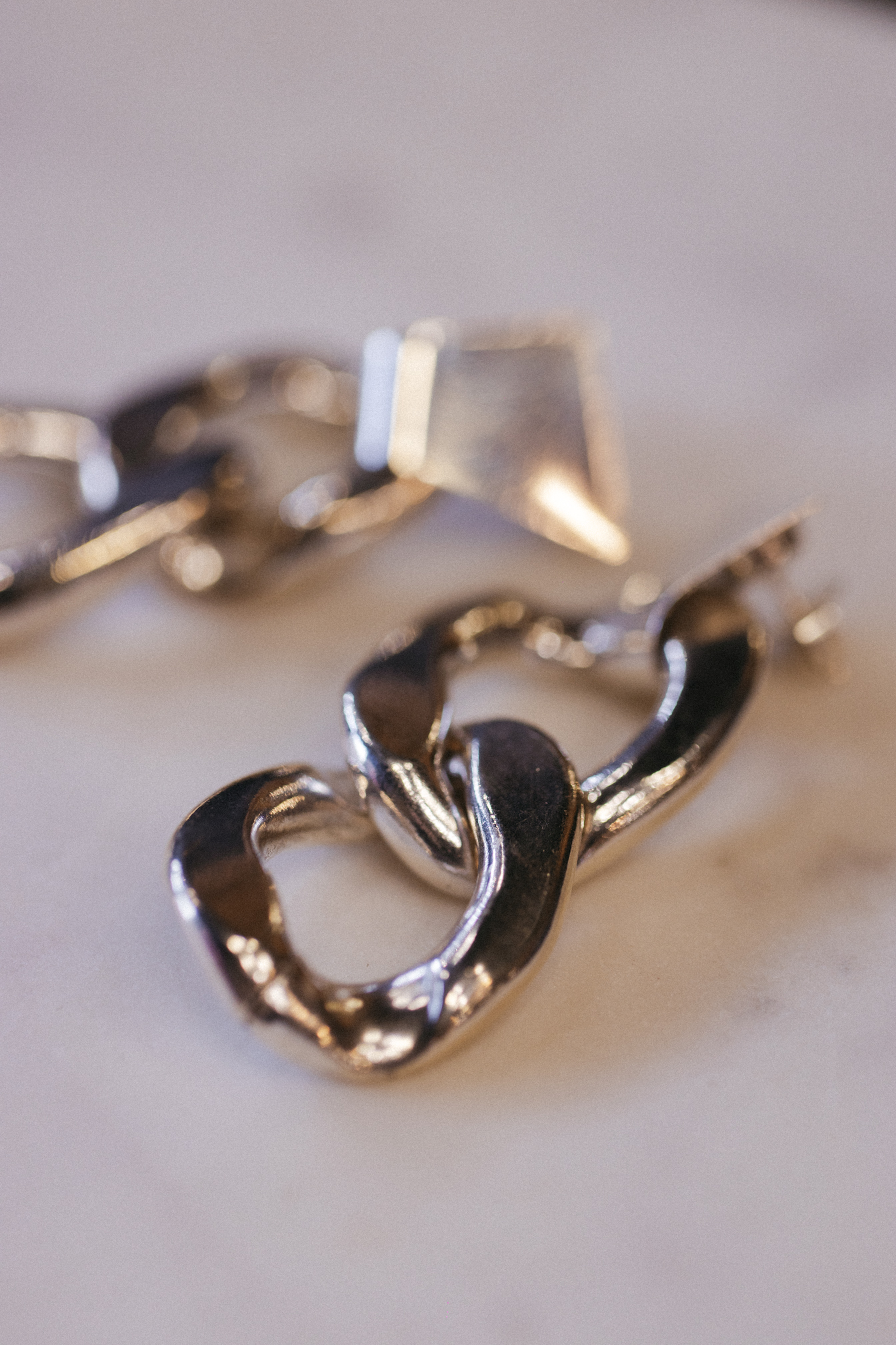 Les boucles d’oreilles Babylone de Perrine Taverniti s’imposent comme une pièce forte au design sculptural assumé. Réalisées en argent 925, elles se composent de maillons généreux à la finition lumineuse, créant un jeu de volumes qui capte la lumière avec intensité.