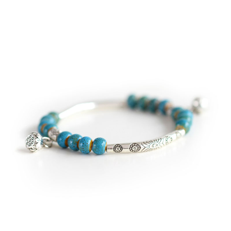 Inspiré d’anciennes peintures à l’huile de l’Antiquité, ce bracelet Arya vous apporte le sentiment d’appartenir au passé – antique et raffiné. Ce bracelet se compose de magnifiques perles en céramique teintées et de deux perles en forme de tube gravées de motifs floraux qui reflètent la lumière de façon magnifique. Ce bracelet ethnique Arya est agrémenté de deux « charms » fleurs pour accentuer le style Romantique.