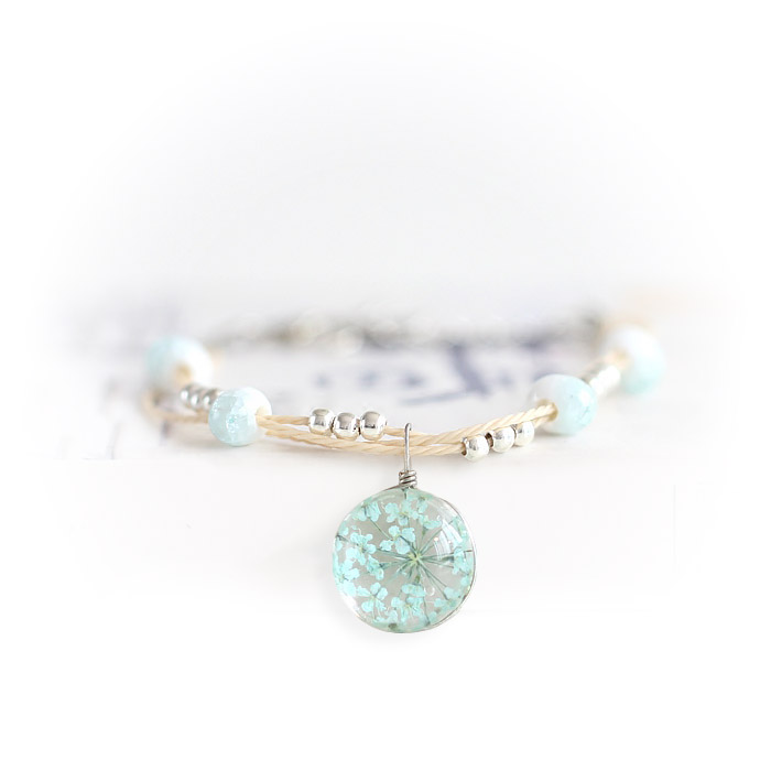Ce bracelet s’inspirant de la nature est composé d’un triple cordon en coton sur lequel est disposé plusieurs perles en céramique et en alliage de zinc. Il se fixe grâce à un fermoir à griffes de homard qui vous permet d’ajuster sa longueur de 15 à 20 cm. Au centre de ce Bracelet , se trouve une boule de verre dans laquelle est emprisonnée une véritable fleur unique colorée. Votre Bracelet boule Fleur est comme vous : unique !