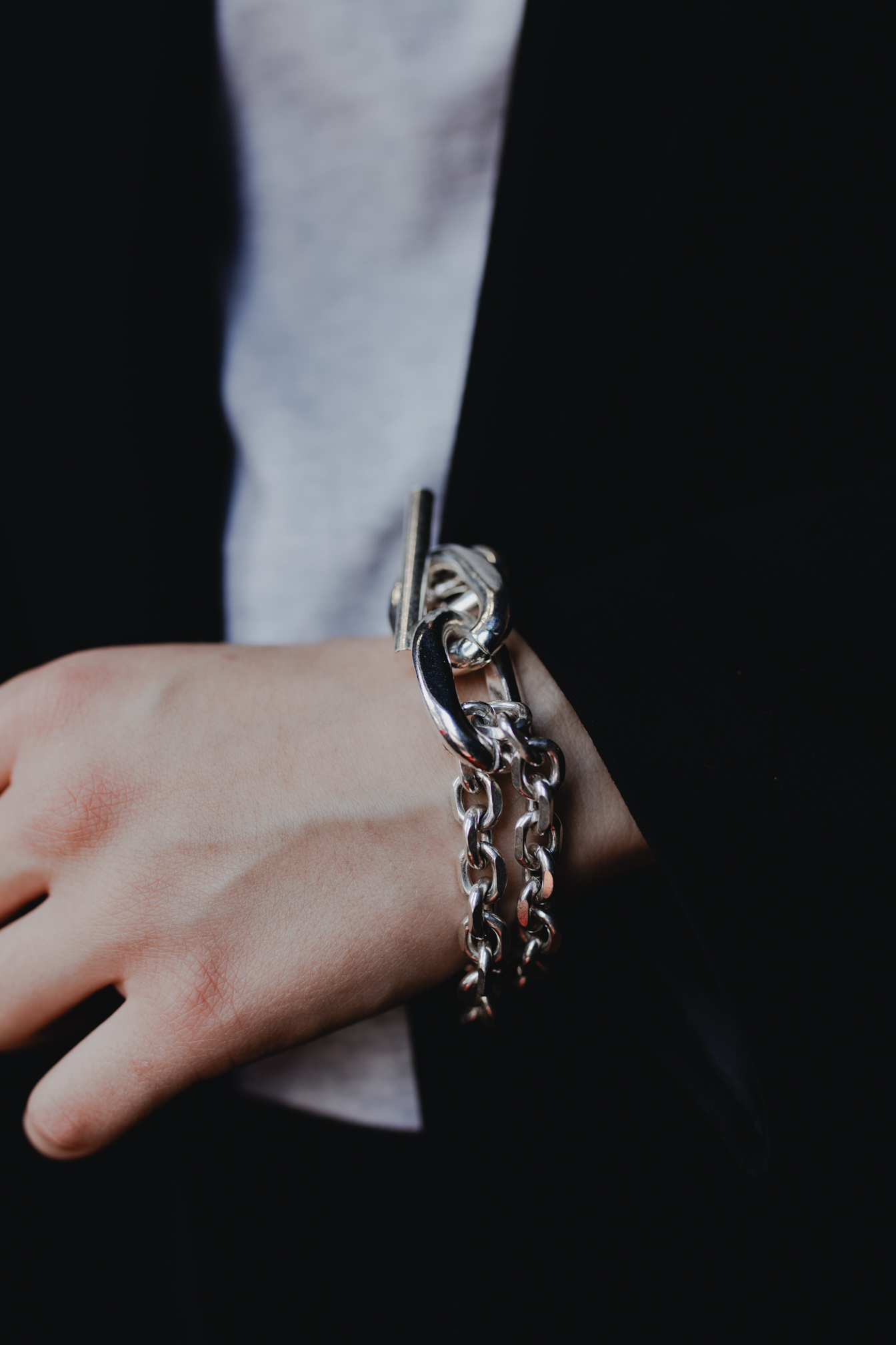Graphique, sculptural, affirmé. Le bracelet Chaptal incarne la force du design minimaliste signé Perrine Taverniti. Son gros maillon central ovale, associé à une double chaîne épaisse, en fait une pièce contemporaine qui ne passe pas inaperçue. Fermé par une barre en T oversize, ce bijou est aussi audacieux qu’élégant.