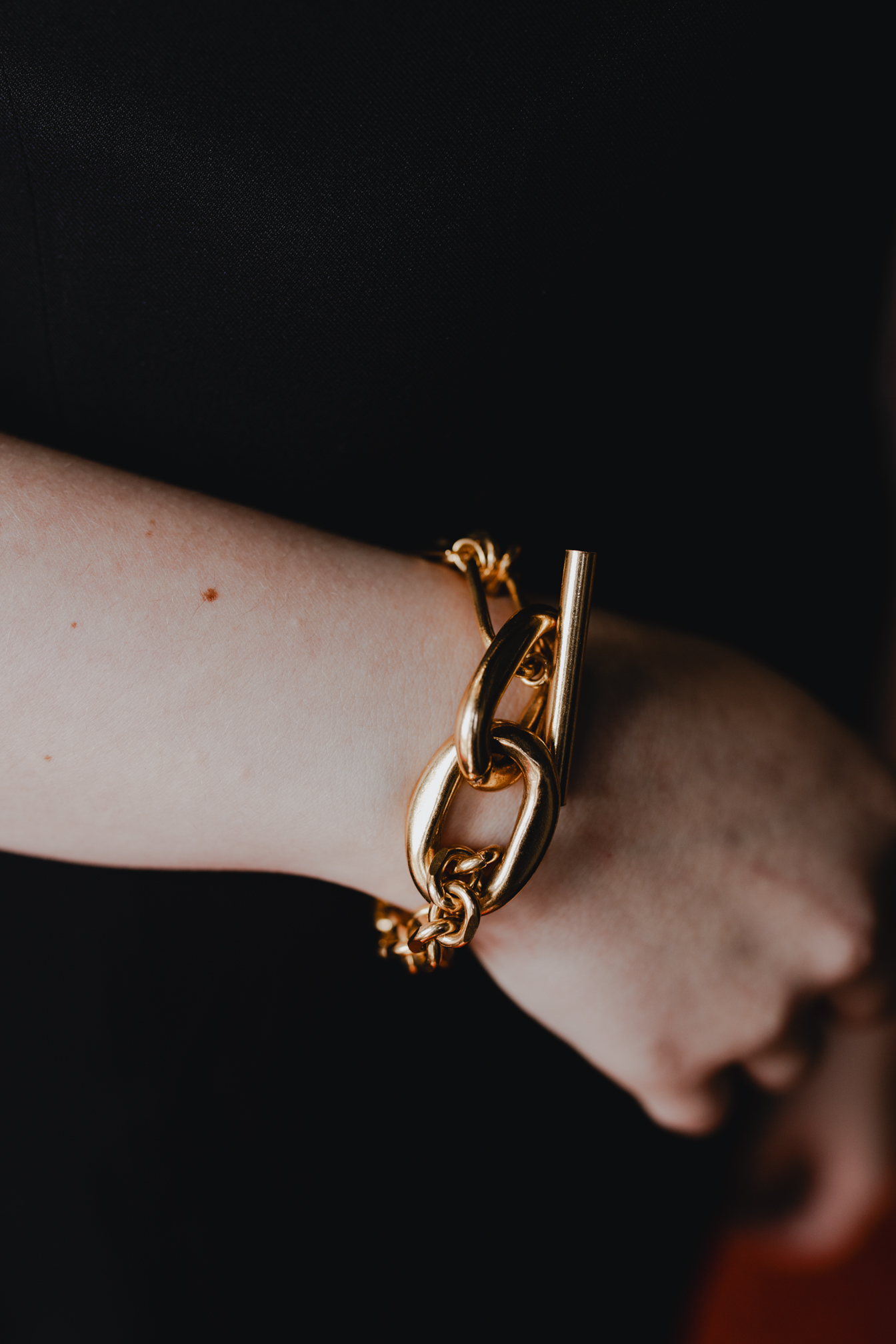 Avec son maillon central oversize et sa double chaîne plaquée or, le bracelet Chaptal affirme un style graphique et contemporain. Son fermoir barre en T signature en fait une pièce forte, élégante et sculpturale.