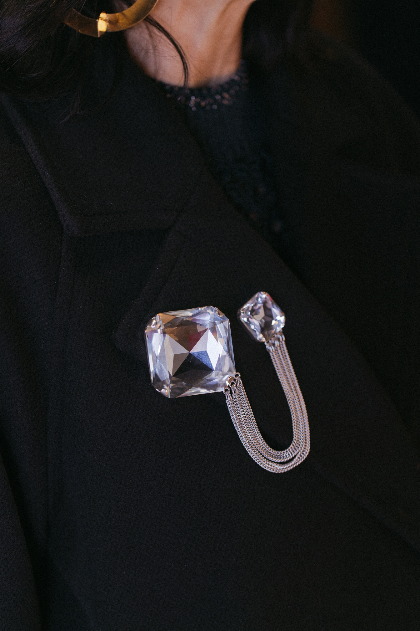 Ce jeu de contrastes entre la structure des pierres et la fluidité des chaînes donne à la broche Milton une allure graphique et contemporaine. La lumière se reflète sur les facettes des zircons, tandis que les chaînes créent un effet de lien et de mouvement, renforçant le caractère artistique de la pièce.