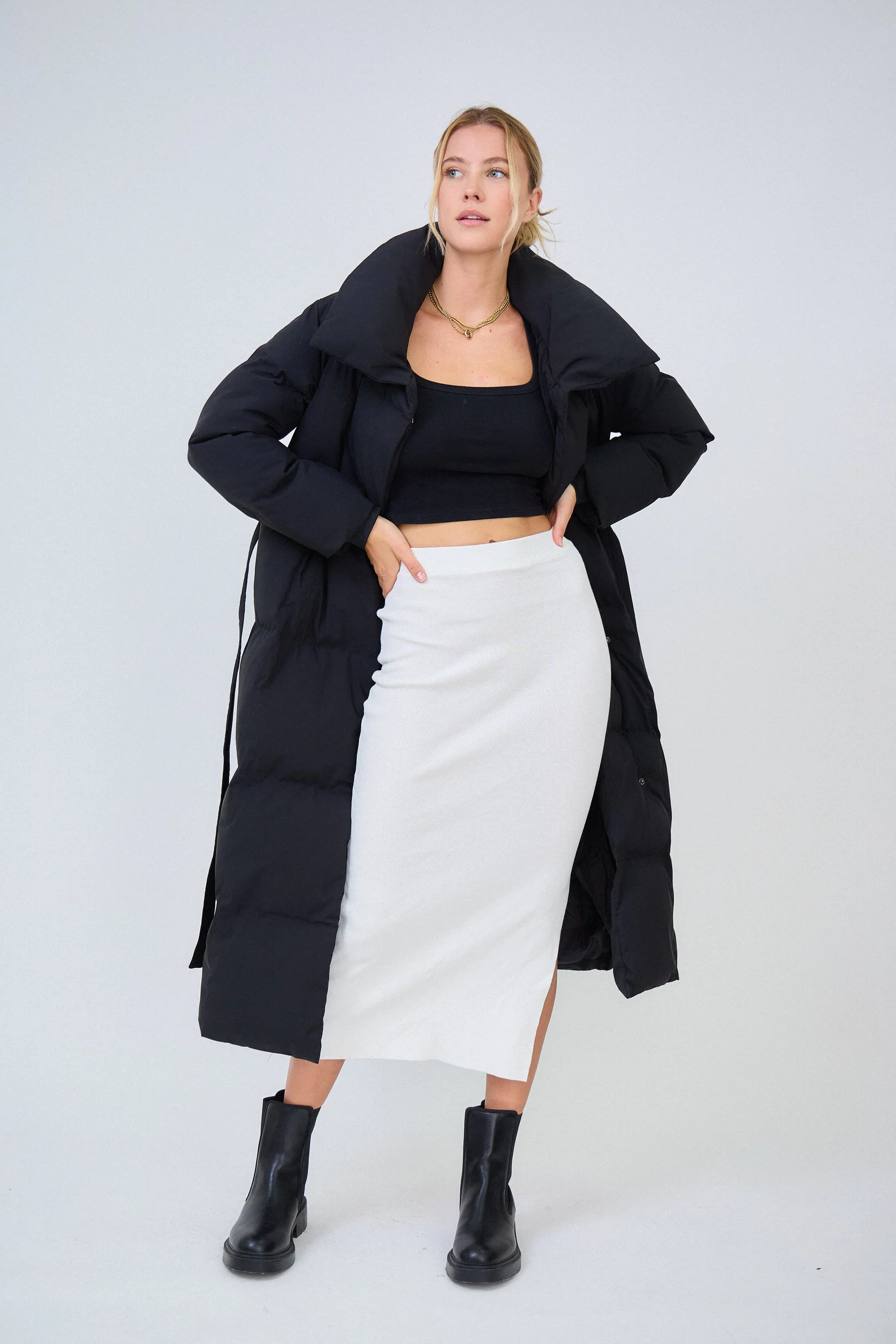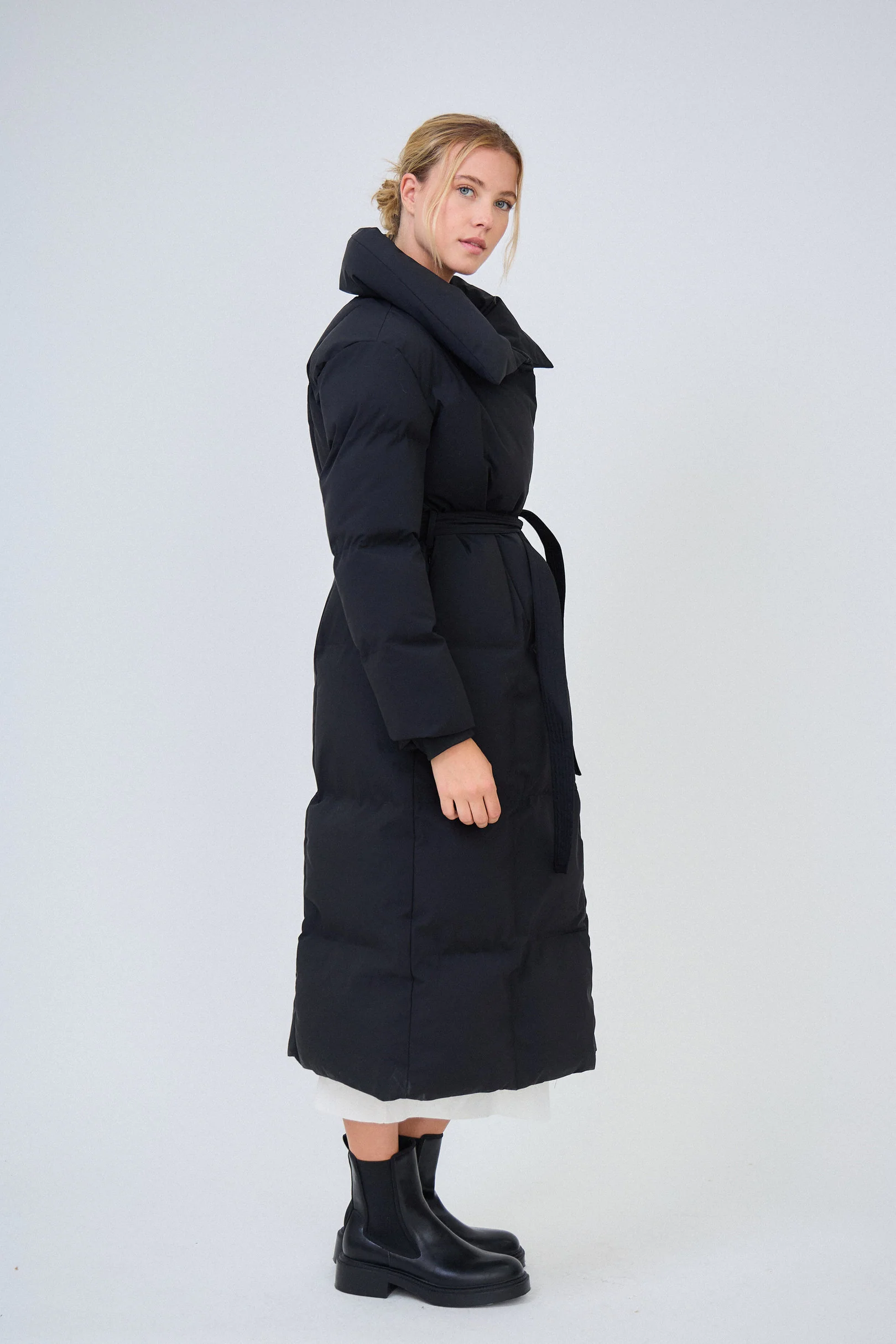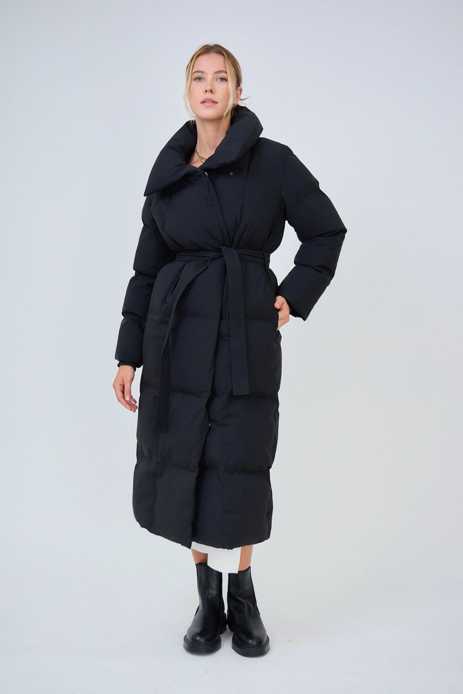 - Confort et silhouette ajustée : Sa coupe longue et son style ceinturé à la taille mettent en valeur la silhouette tout en offrant une liberté de mouvement. Le large col en entonnoir ajoute une touche de sophistication et protège efficacement du vent.