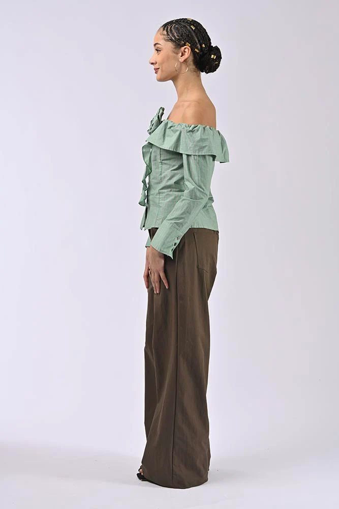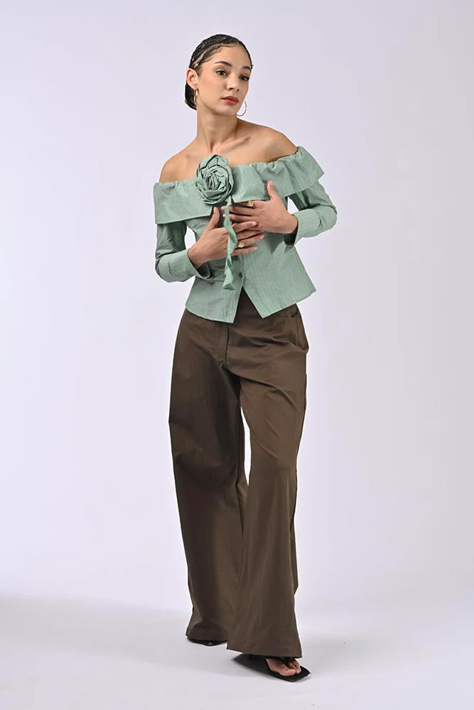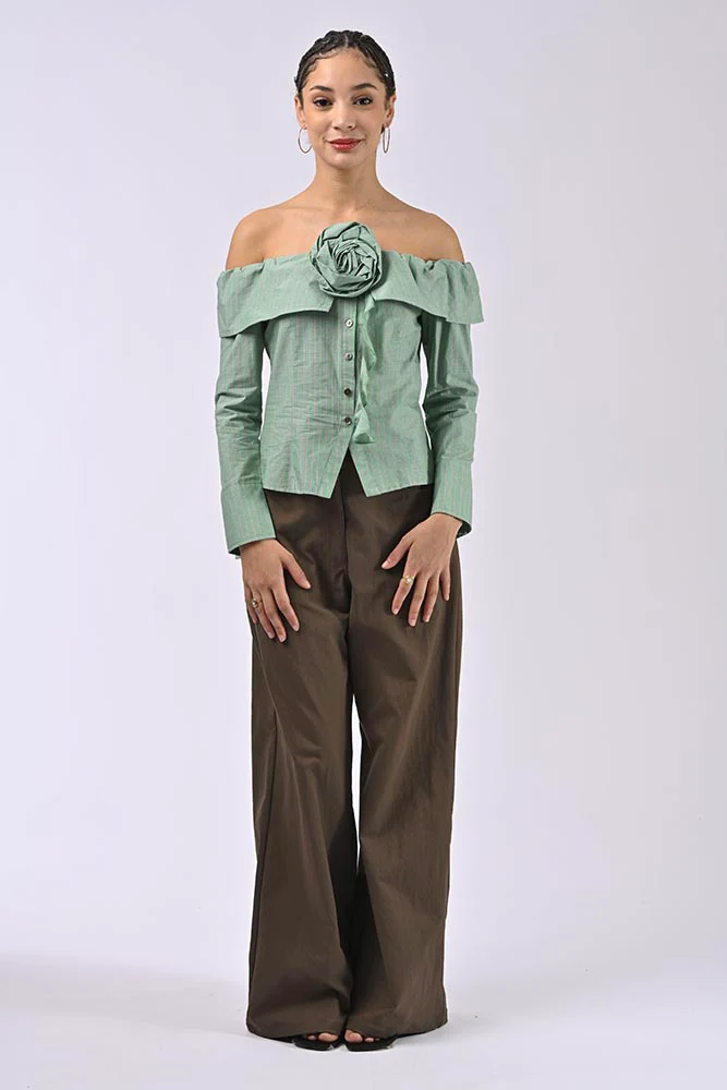 Conçue pour sublimer la silhouette, cette chemise se distingue par sa coupe off-shoulder, mettant en valeur les épaules, et son ajustement cintré à la taille. Une grande fleur en tissu orne le devant, ajoutant une note romantique et unique.