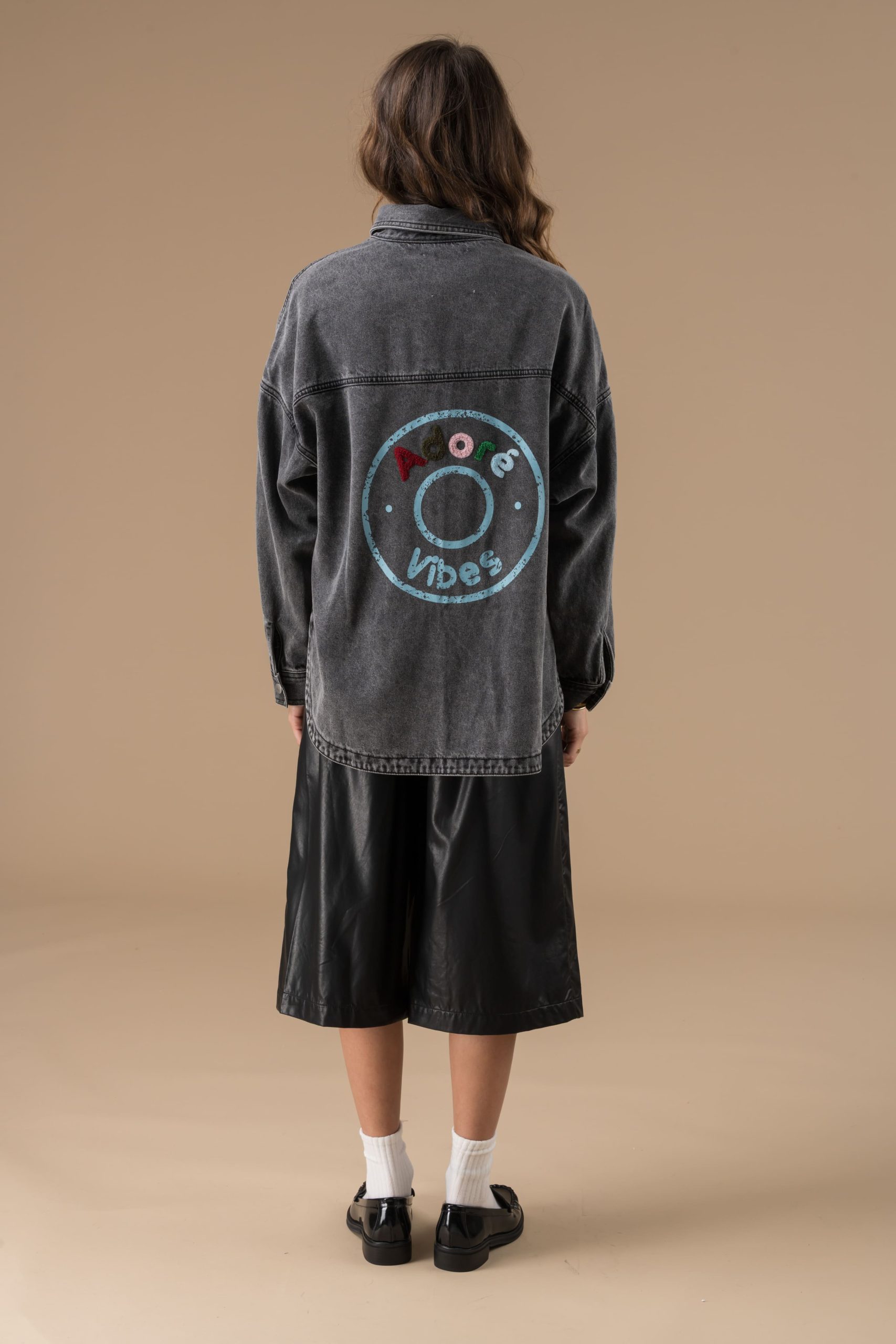 Cette surchemise se distingue par des détails soignés et originaux. La fermeture par boutons pression métallisés est à la fois pratique et moderne, permettant d’enfiler et de retirer la chemise en un clin d’œil. Mais le détail le plus remarquable réside dans le dos, qui est orné d’impressions et de broderies formant les mots « Adoré Vibes« , une signature audacieuse et inspirante. C’est une déclaration de style, un hommage à la créativité et à l’authenticité.