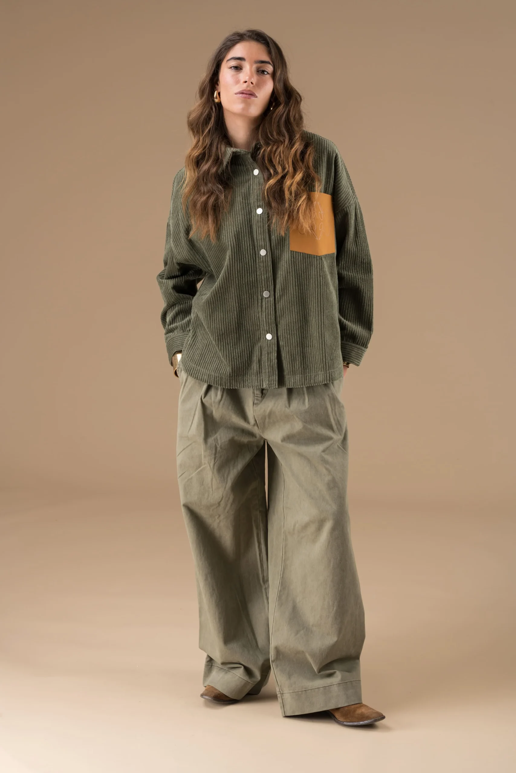 Chemise Bertie Kaki manches longues. Surchemise en tissus rayé façon velours, avec une poche centrale sur le devant, en cuir gravé du A, initiale d’Adoré Paris. Le vêtement se ferme par des boutons pression.