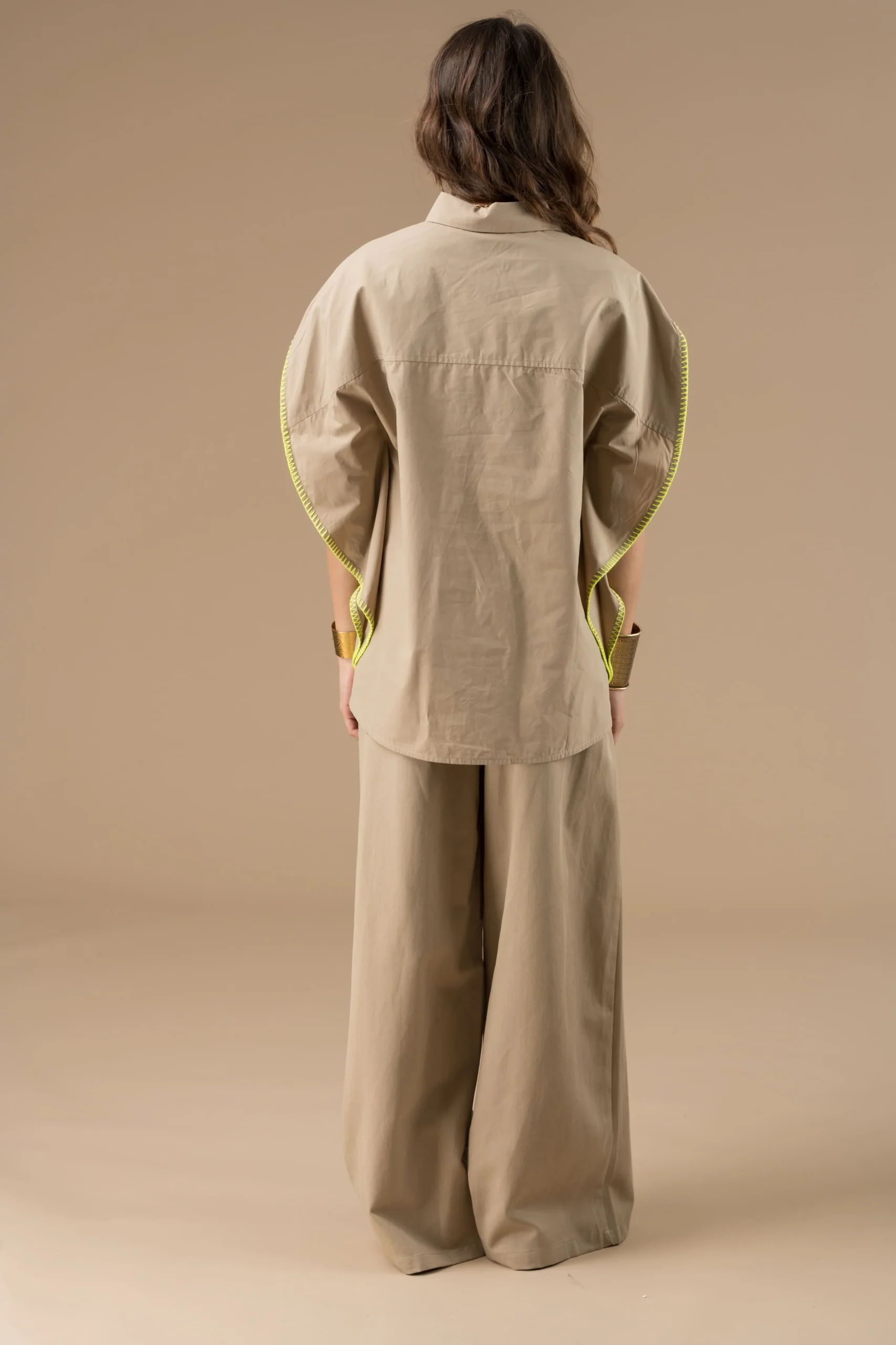 Le design sans manches et la large emmanchure aux bords brodés de jaune apportent une touche de modernité et de raffinement. Ce vêtement est bien plus qu’une simple chemise ; c’est une œuvre d’art textile qui célèbre la féminité. Le détail le plus remarquable réside dans la poche sur le devant, ornée d’une étiquette en simili cuir où est fièrement affichée la marque Adoré Paris.