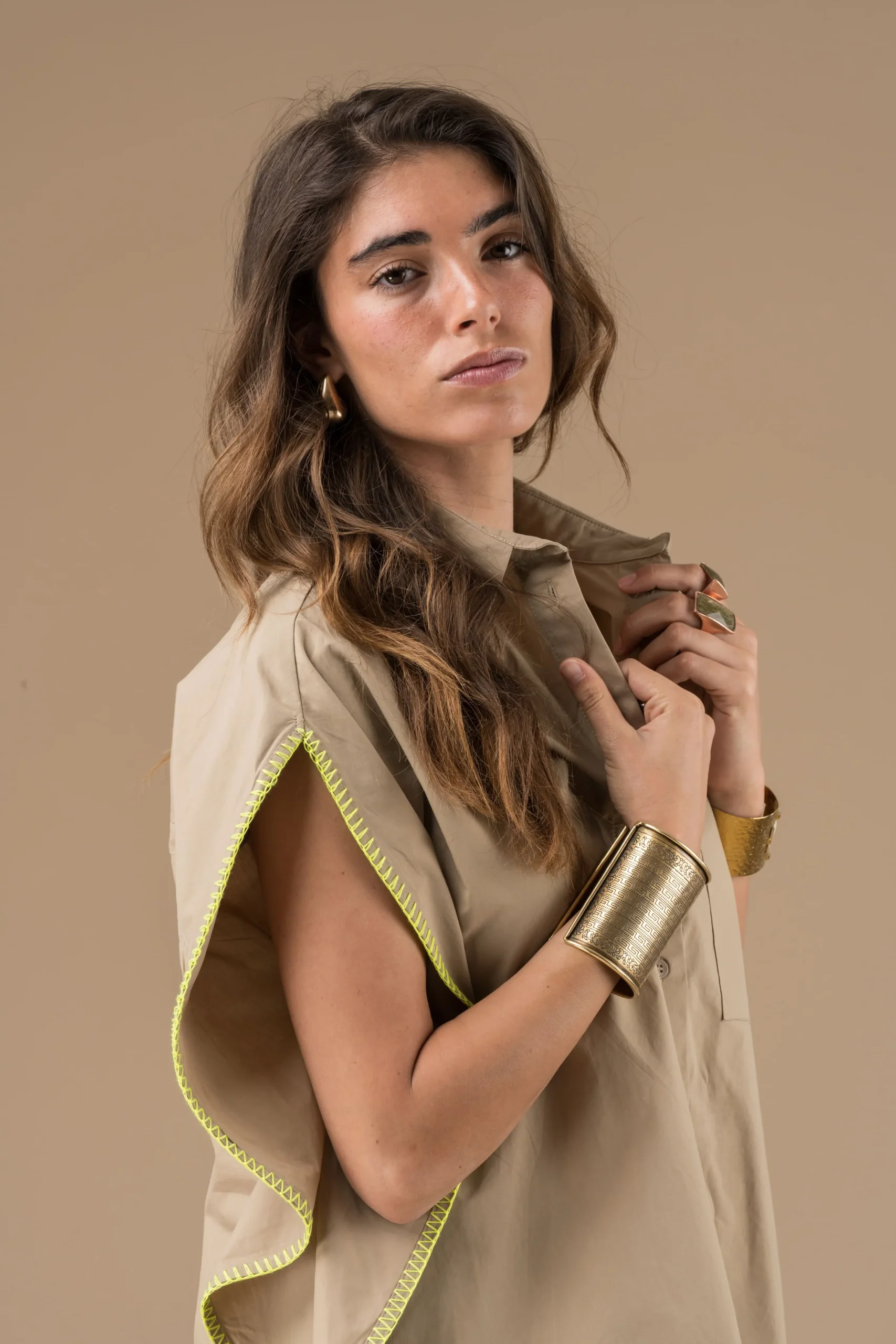 Chemise Fabiola Cuivre sans manches avec une large emmanchure aux bords brodés de jaune. Une poche sur le devant est ornée d’une étiquette en simili cuir, de la marque Adoré Paris. Ce vêtement est en pur coton. Cette chemise se ferme par des boutons.