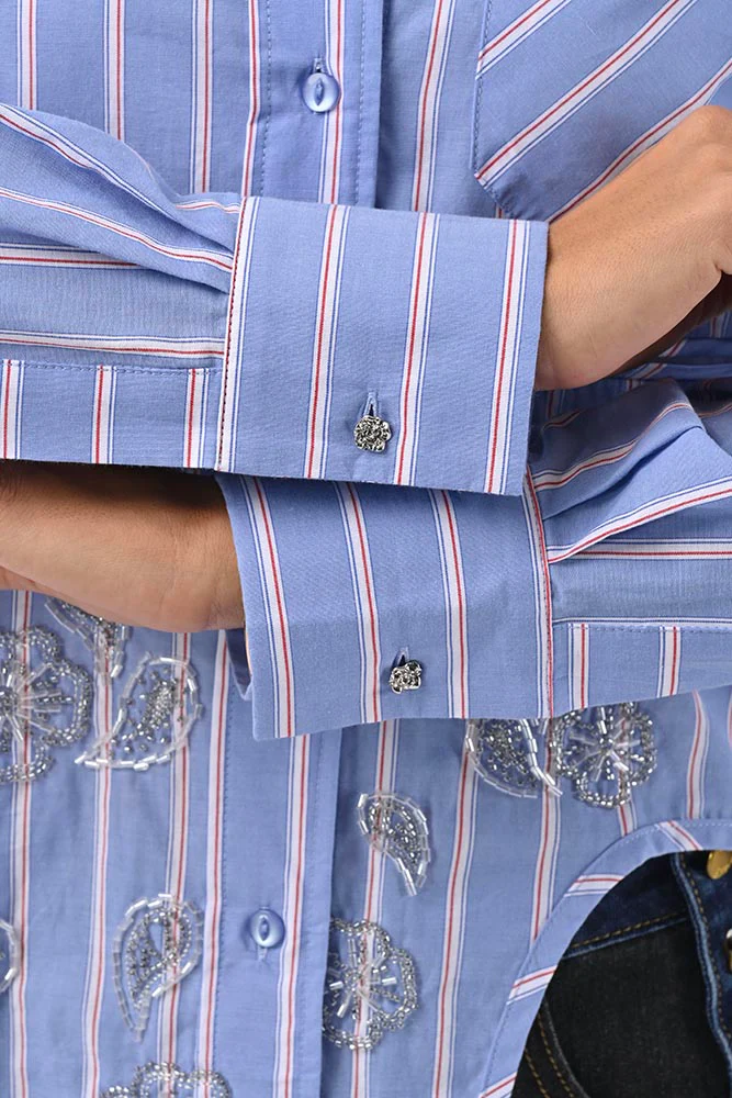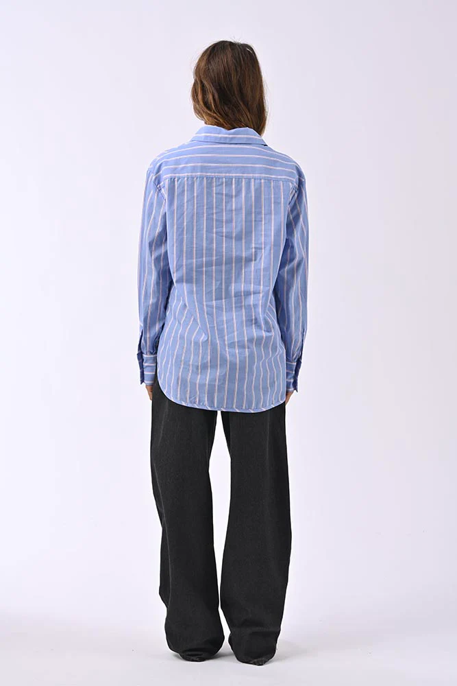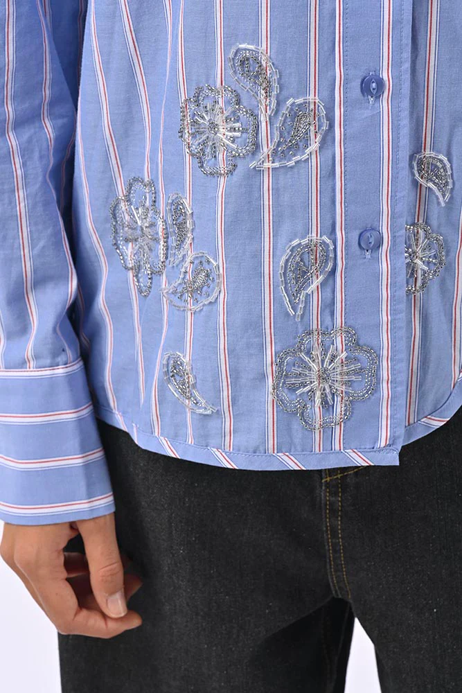 La chemise Idris Rayures bleues allie élégance et décontraction avec son motif rayé bleu et blanc rehaussé de touches de rouge. Son design intemporel en fait une pièce polyvalente, adaptée aussi bien à un usage quotidien qu’à des occasions plus sophistiquées.
