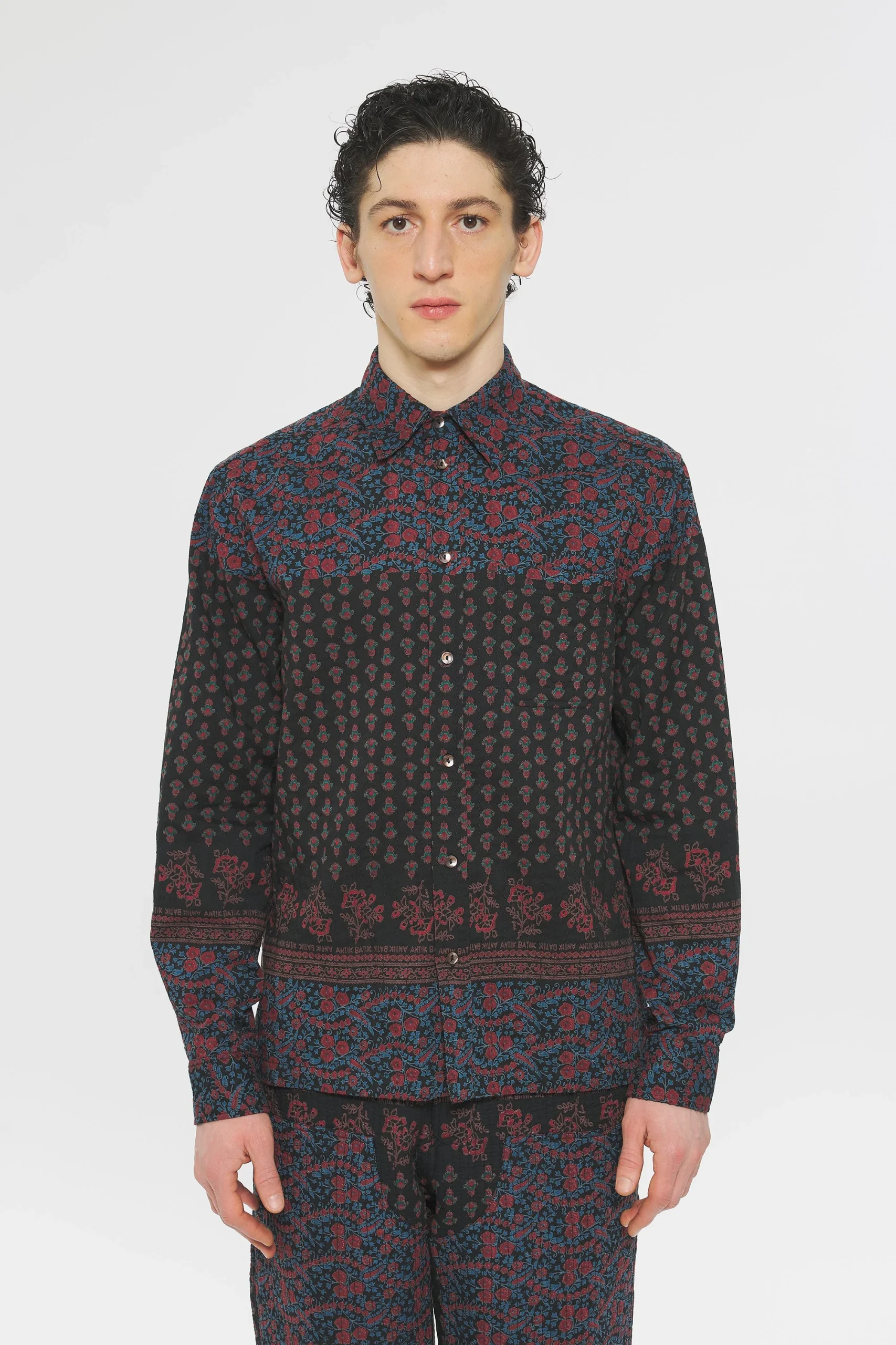 Chemise en coton imprimé. Patte de serrage sur le devant et aux poignets. Boutons en nacre naturelle.