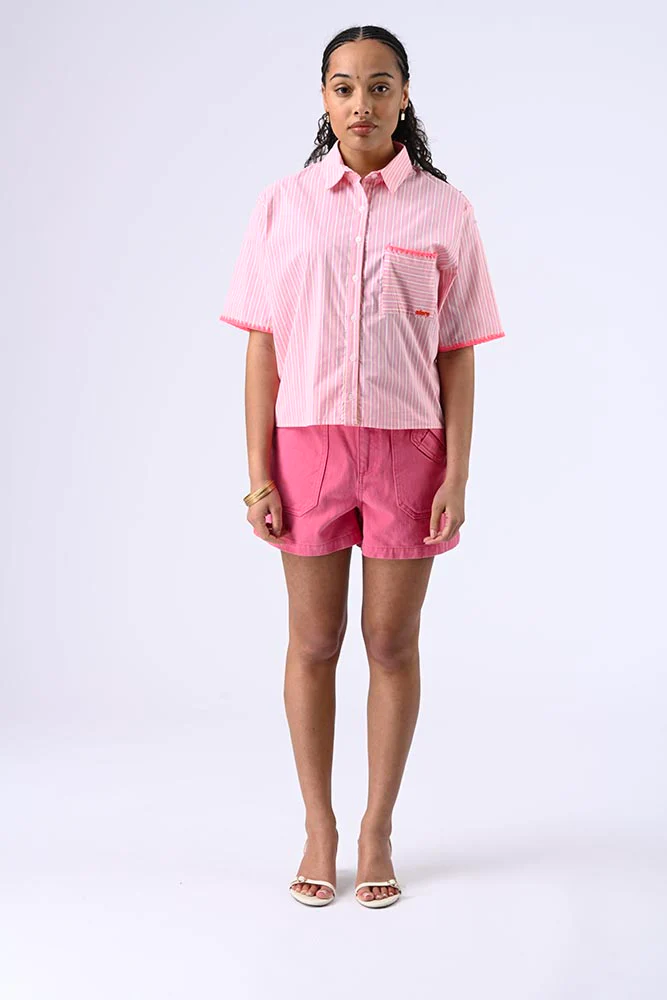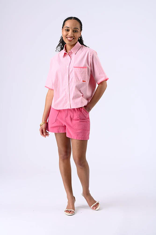 Chemise à manches 3/4, col classique, petits boutons et détails de broderie, avec liseré sur les manches et la poche pour une touche raffinée. Couleur rose