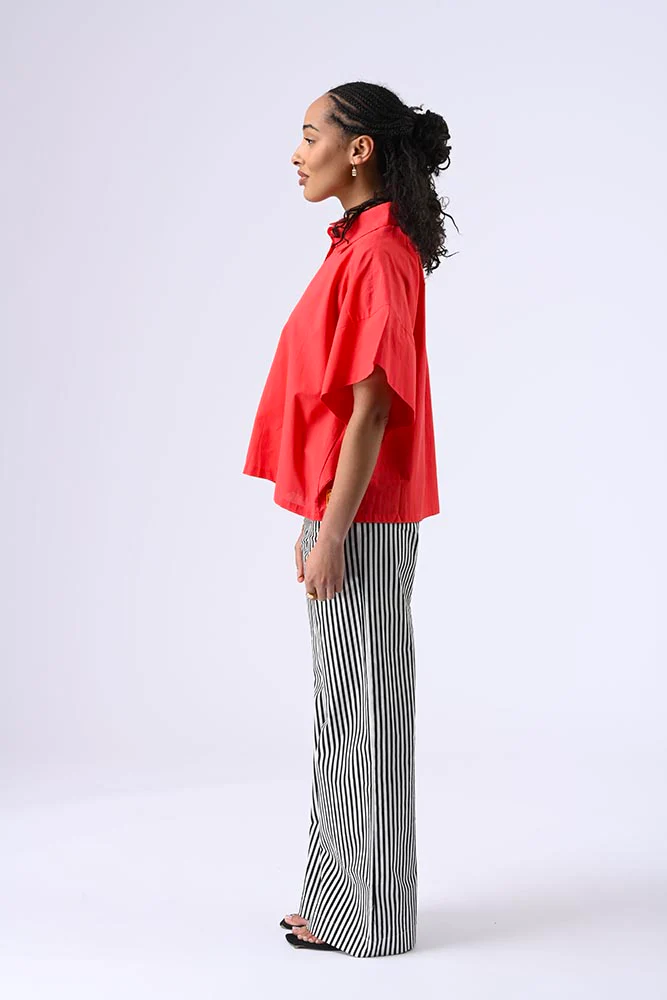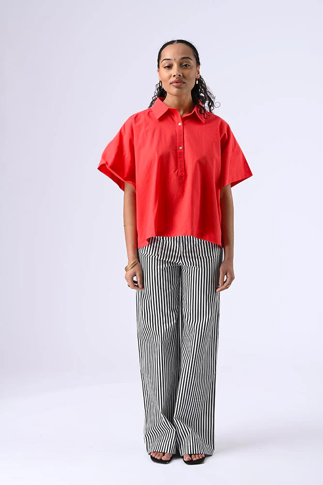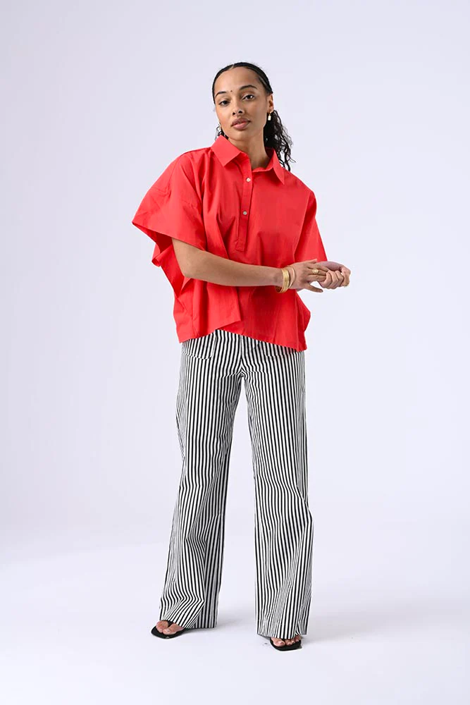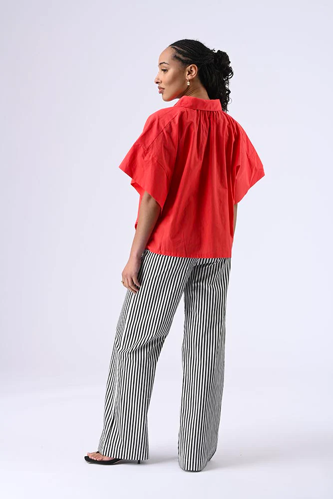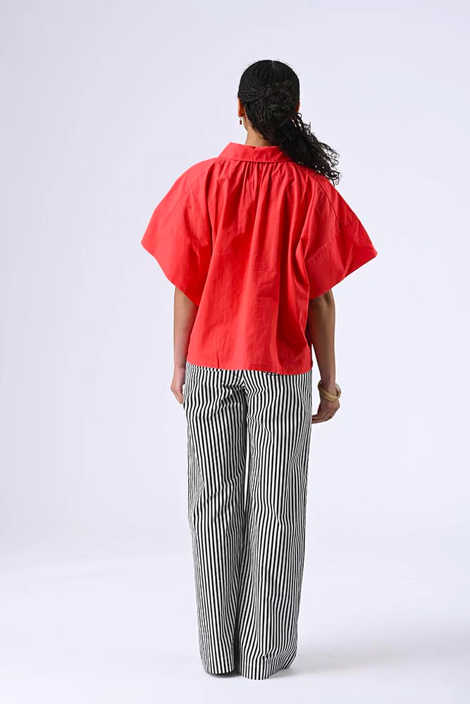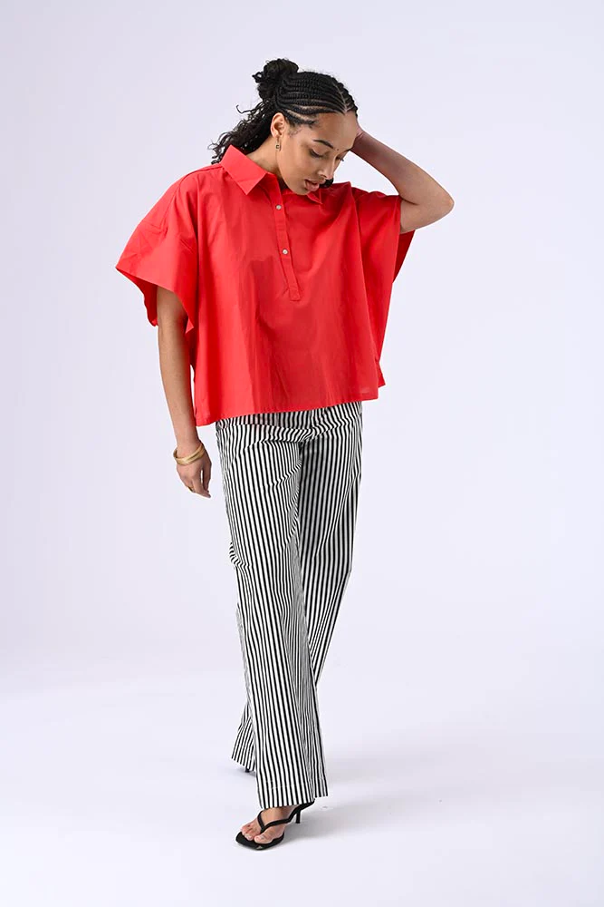 Chemise ample, manches larges mi-longues, col classique et légère ouverture fermée par 2 boutons pour une touche d’élégance discrète. Couleur rouge