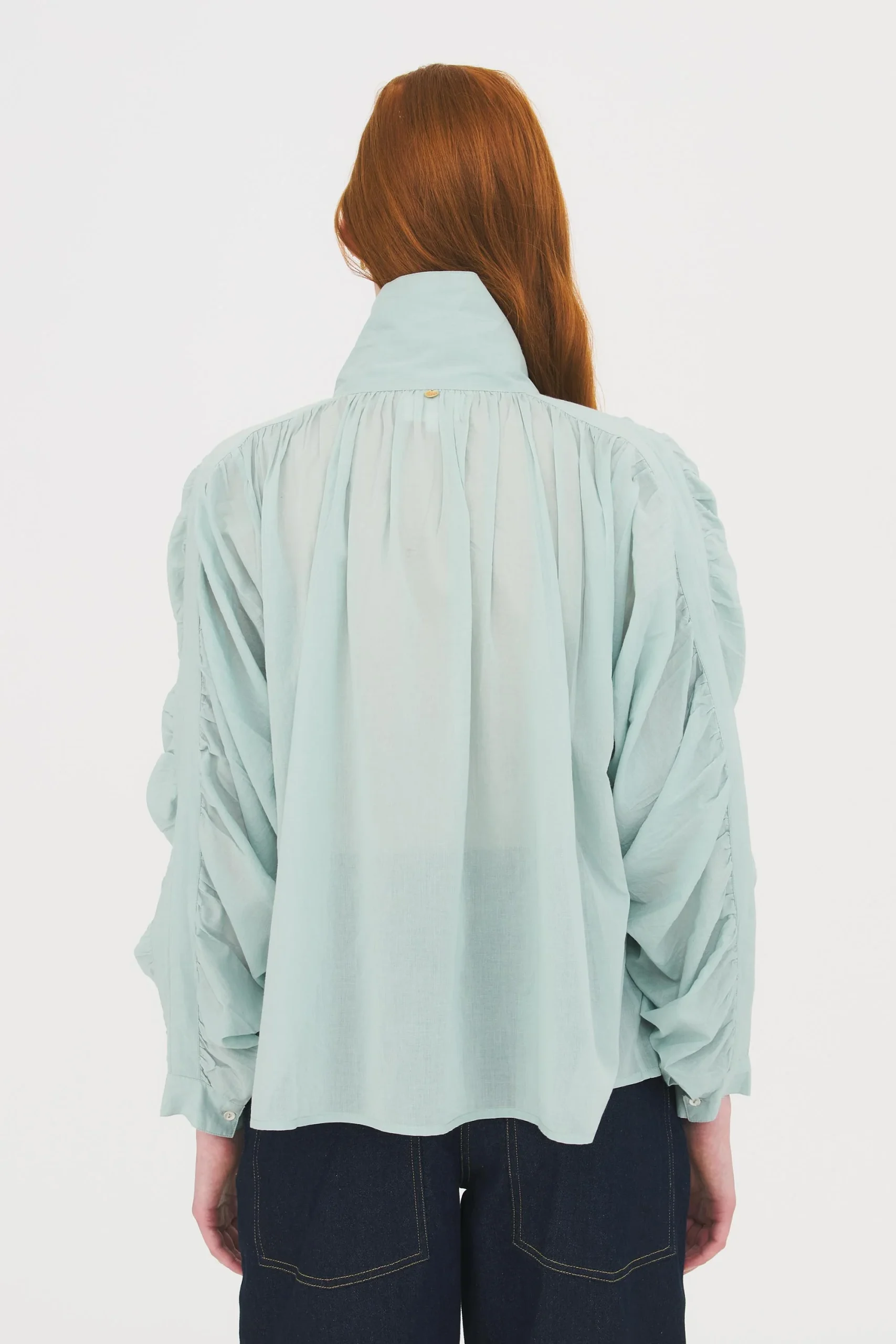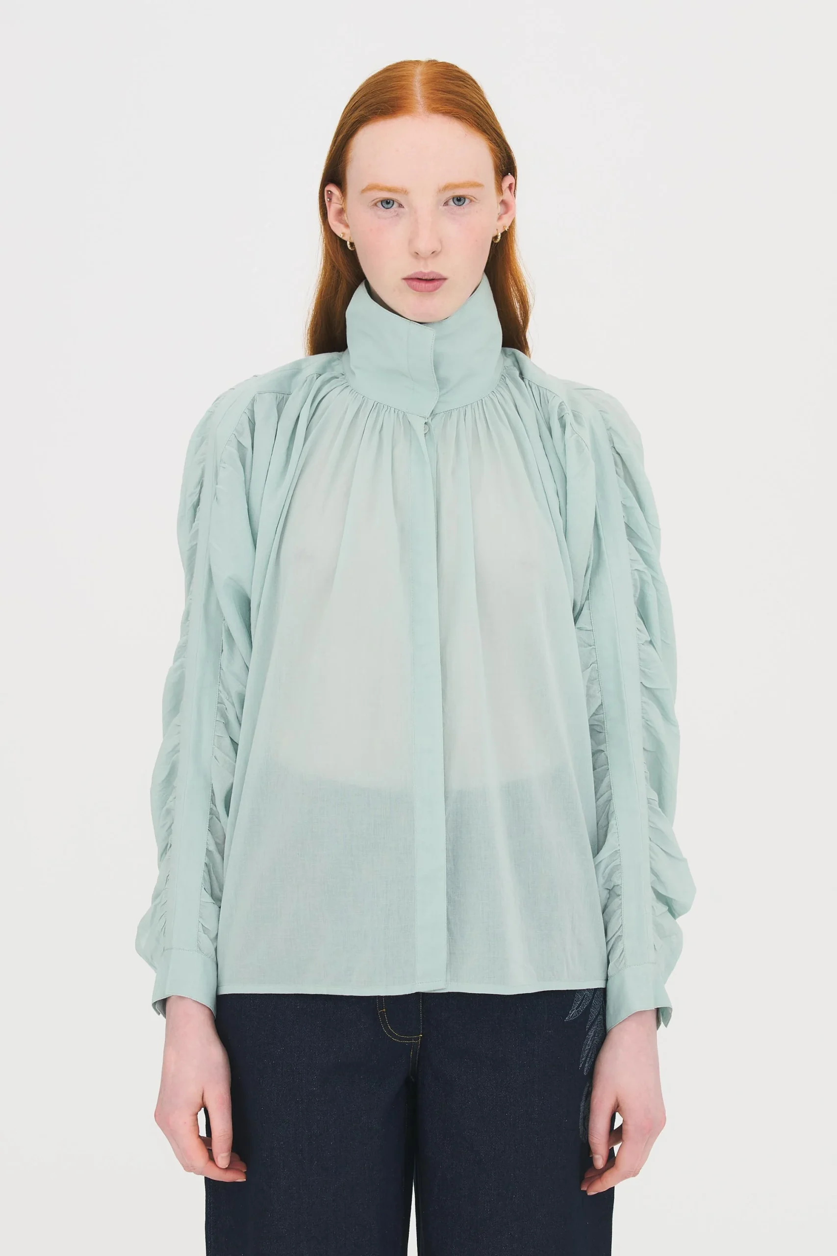 Blouse en voile de coton. Coupe ample. Manches ballon froncées. Double ganse à la couture. Col montant. Patte de boutonnage dissimulée qui permet de porter la blouse ouverte.